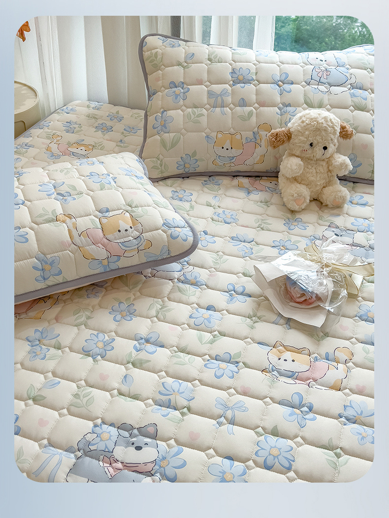 雯豆家纺 2025四季款新品夹棉床笠三件套水洗棉磨毛小清新印花床垫保护套 萌趣小狗