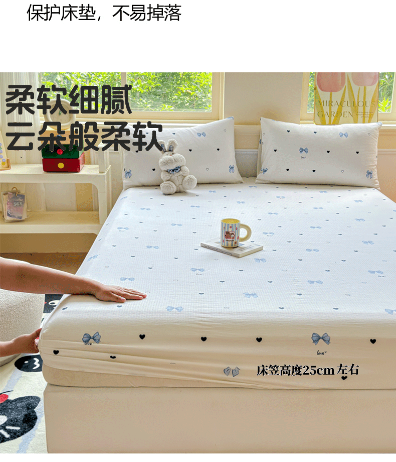 佑佳家纺2025新款A类高克重水洗棉床笠 蓝色蝴蝶结