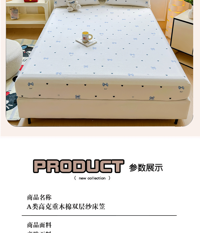 • 91家纺网 家纺一手货源 找家纺 佑佳家纺2025新款A类高克重水洗棉床笠 蓝色蝴蝶结