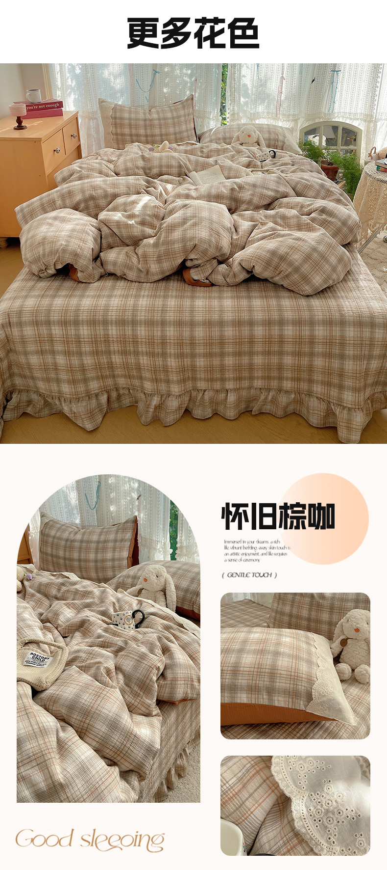 当前位置: 91家纺网 > 商品网购 > 床品套件 > 四件套 > 其它四件套 > 轻奢坊 2025新款125g高克重皱皱撒欢复古格子蕾丝花边四件套 橄榄绿格