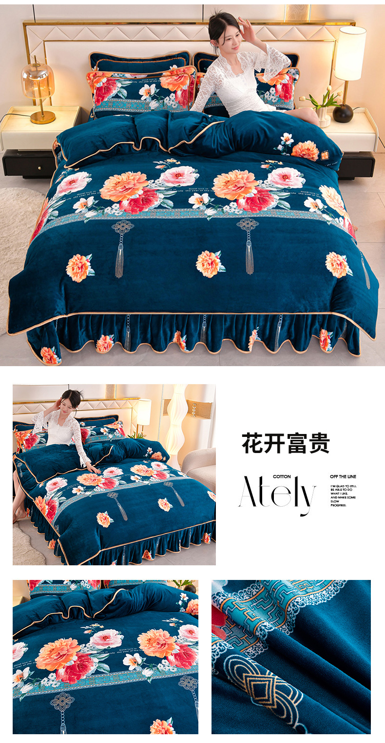 商品名称:硕喜 2025新款新8.5斤法莱绒四件套珊瑚牛奶金貂绒四件套床裙款 花开富贵
