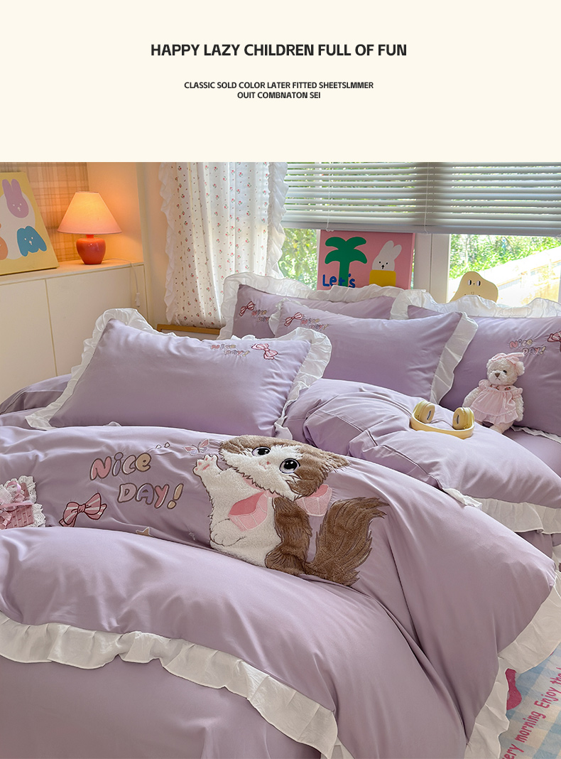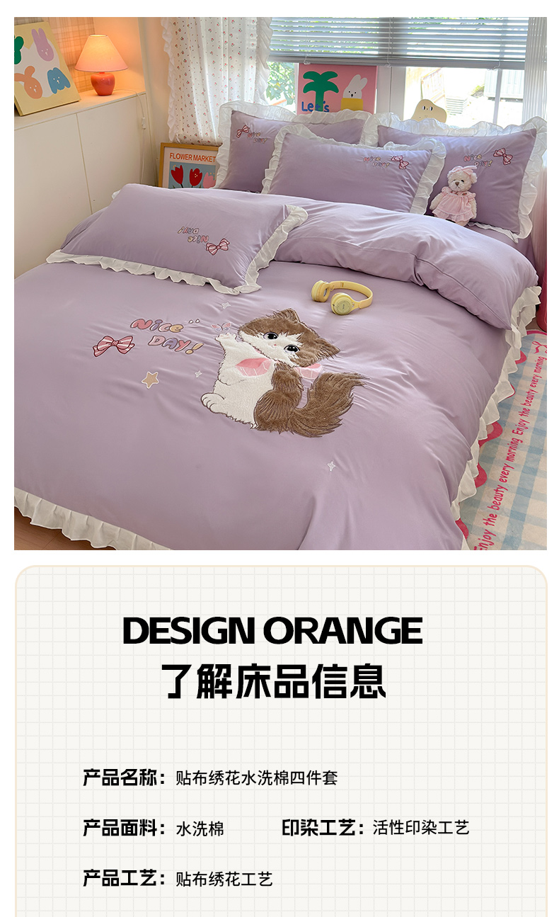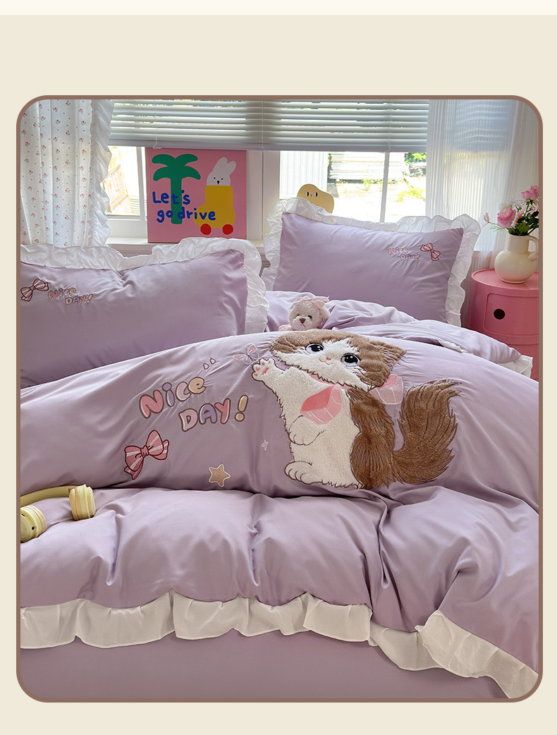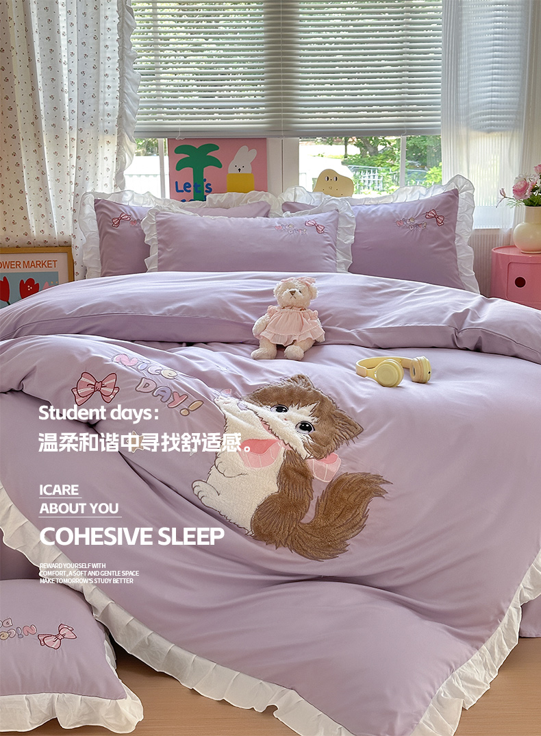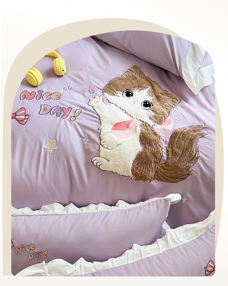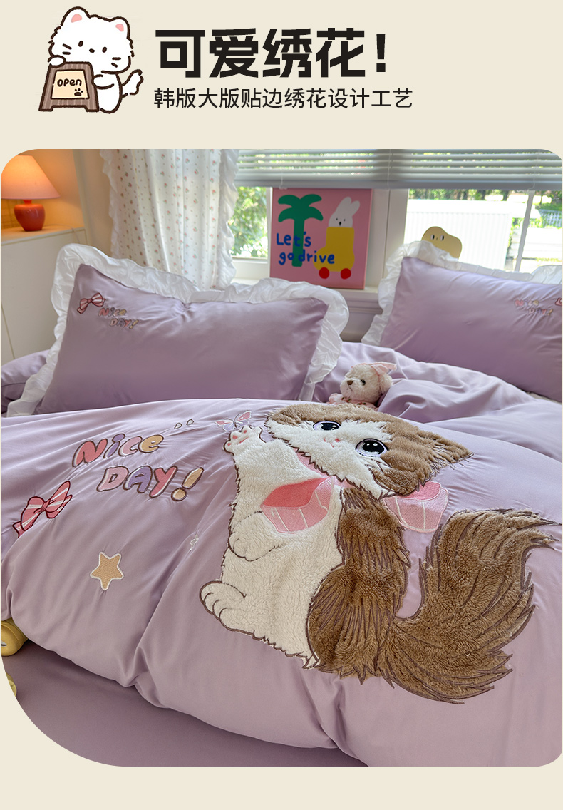 当前位置: 91家纺网 > 商品网购 > 床品套件 > 四件套 > 水洗棉四件套 > 易禾家纺 2025新款韩版卡通兔毛贴布绣水洗棉四件套学生宿舍三件套-炸毛小猫 炸毛小猫——雾紫