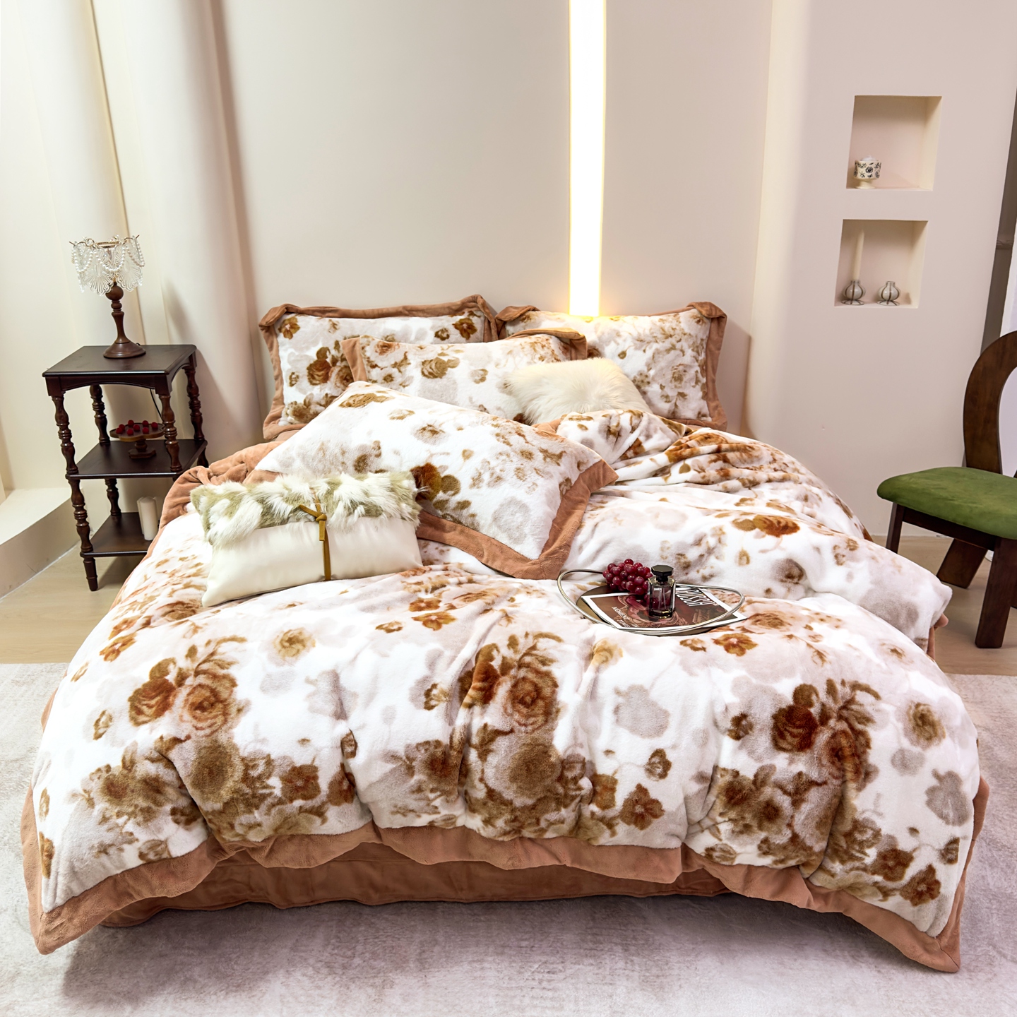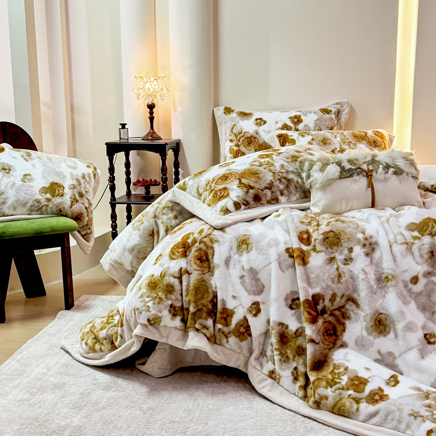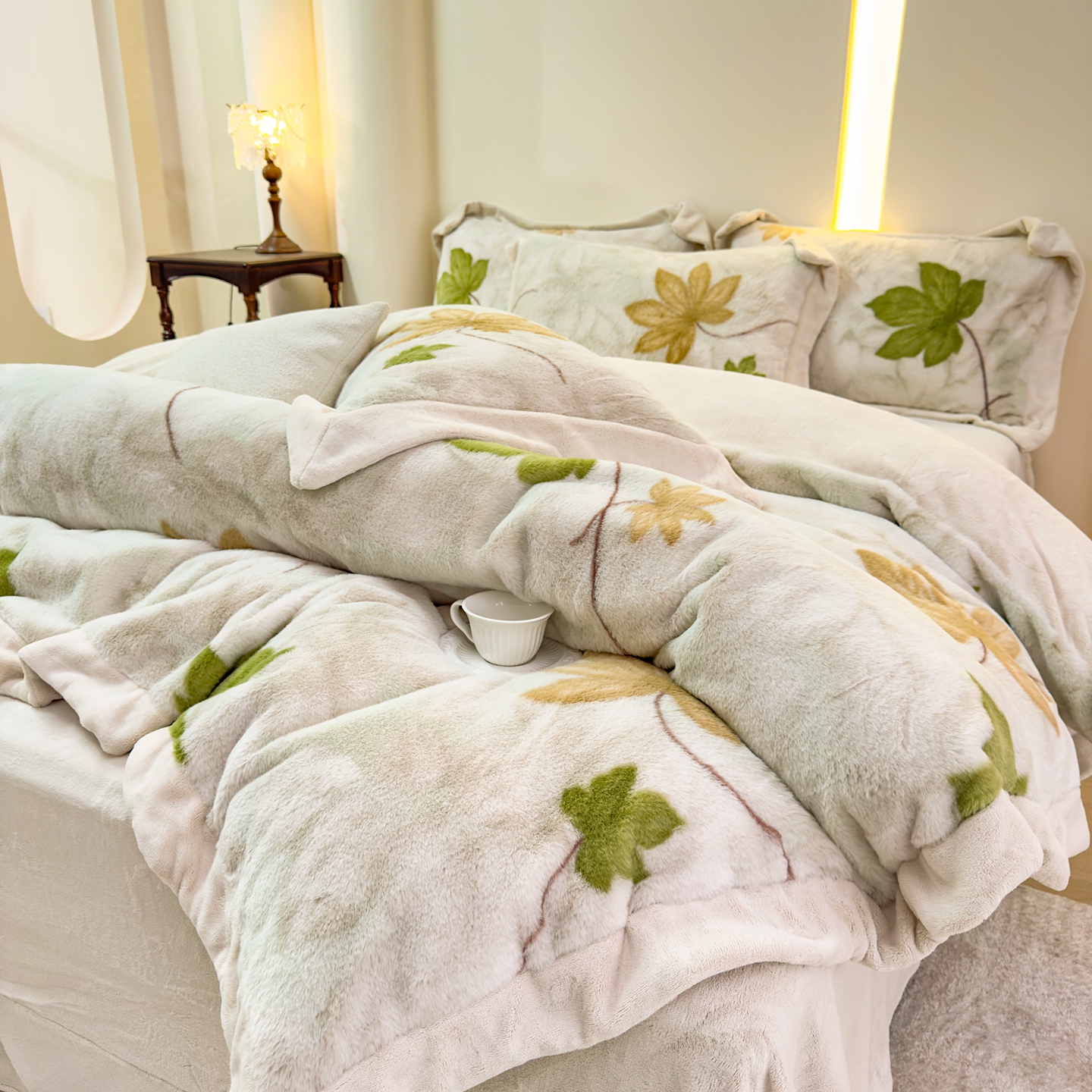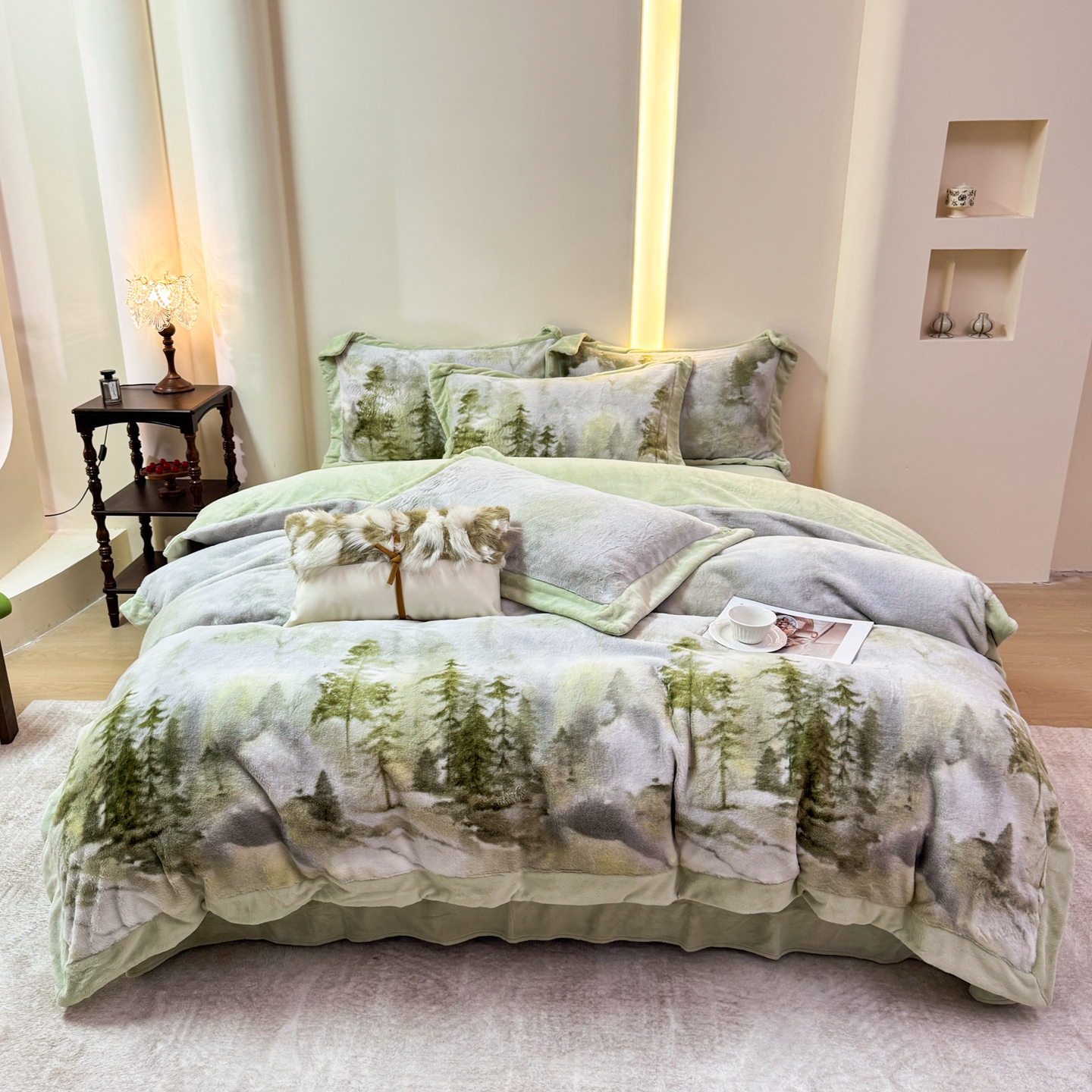 商品名称:优姿家纺 2025新款380克11斤兔毛绒印花四件套 秘境-茶绿