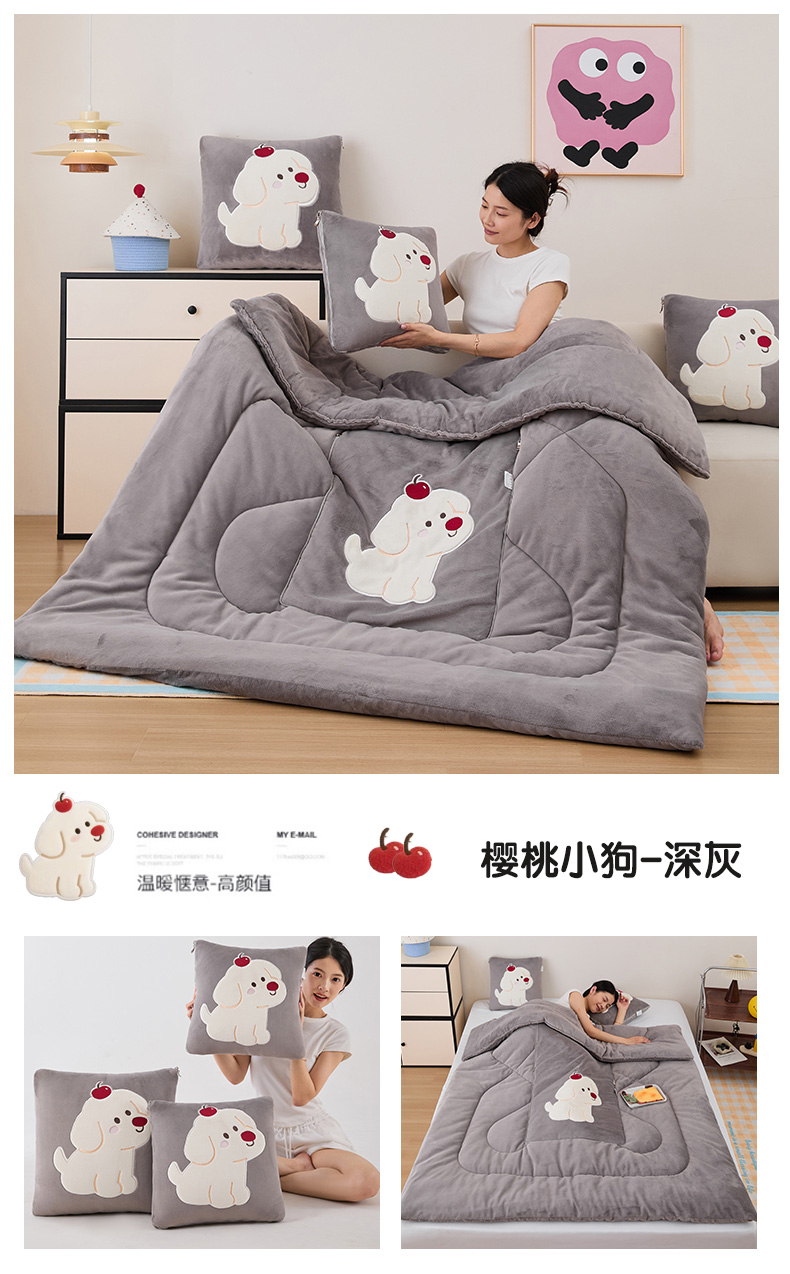 商品名称:哩哩熊2025抱枕被子两用加厚牛奶绒二合一汽车载枕头办公室午睡毯子冬天靠枕-樱桃小狗 樱桃小狗-深灰