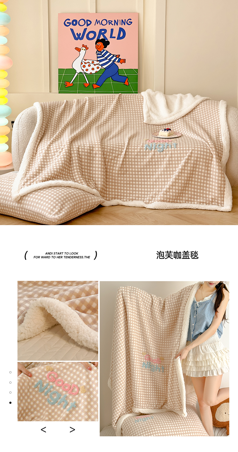 商品名称:布柔 2025新款高克重加厚印花毛巾刺绣牛奶绒羊羔绒盖毯双层毛毯午休毯卡通多功能沙发毯子 泡芙咖盖毯
