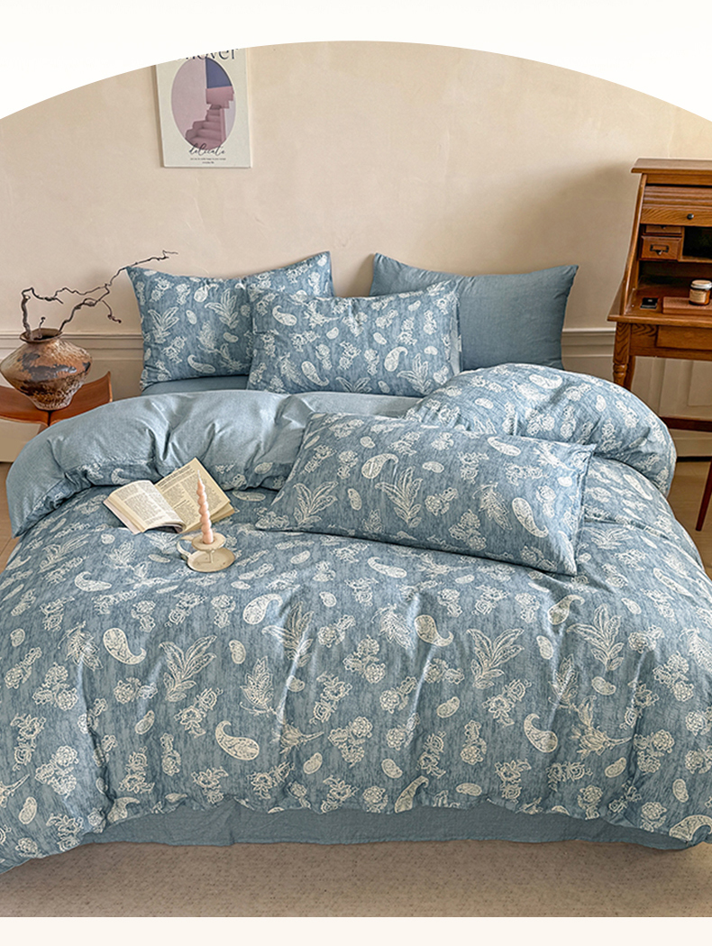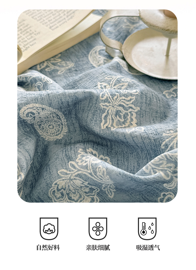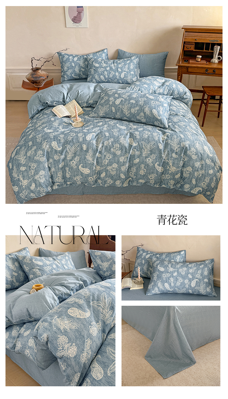 商品名称:壹号库家纺 2025年新品A类仿麻中古风皱皱纱双层纱四件套 青花瓷