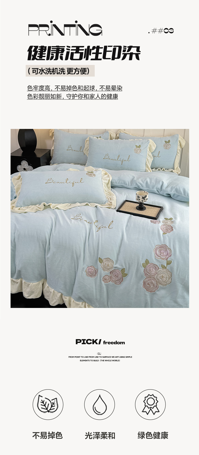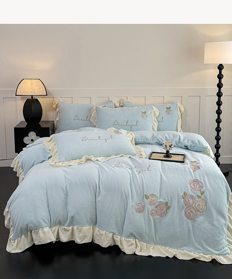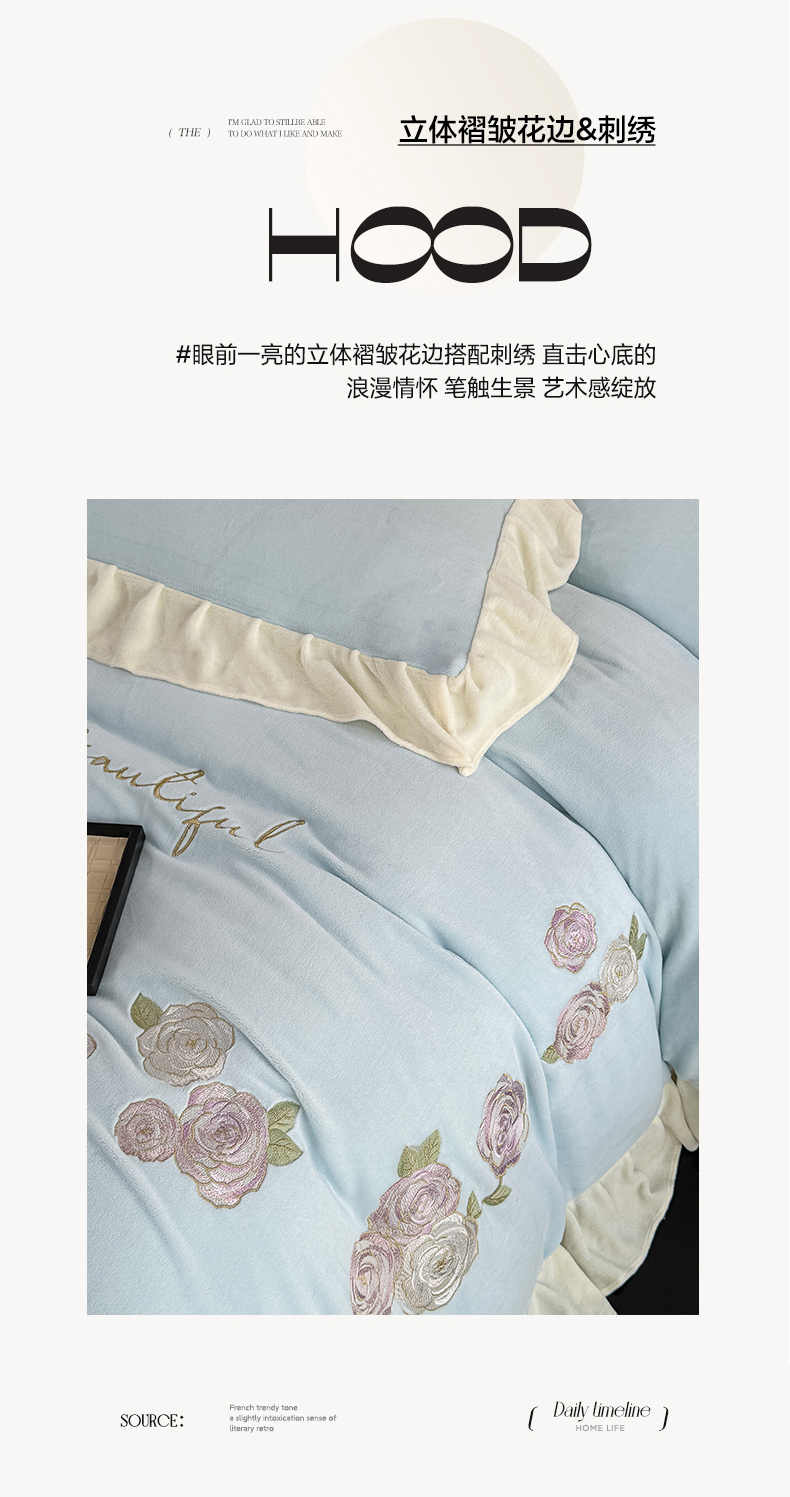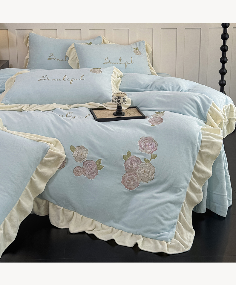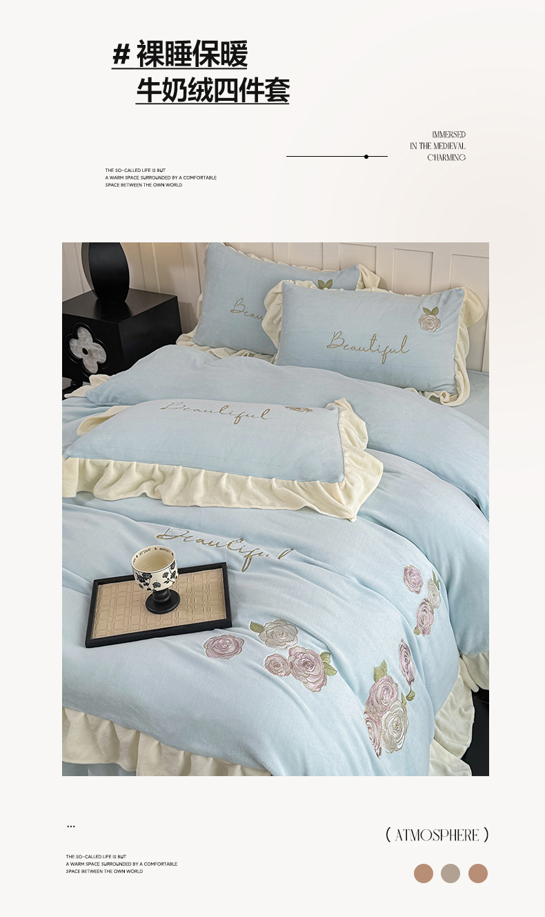 当前位置: 91家纺网 > 商品网购 > 床品套件 > 四件套 > 牛奶绒四件套 > KA家纺 2025新款冬高克重刺绣床裙款花边款牛奶绒四件套-秘密花园系列 秘密花园兰