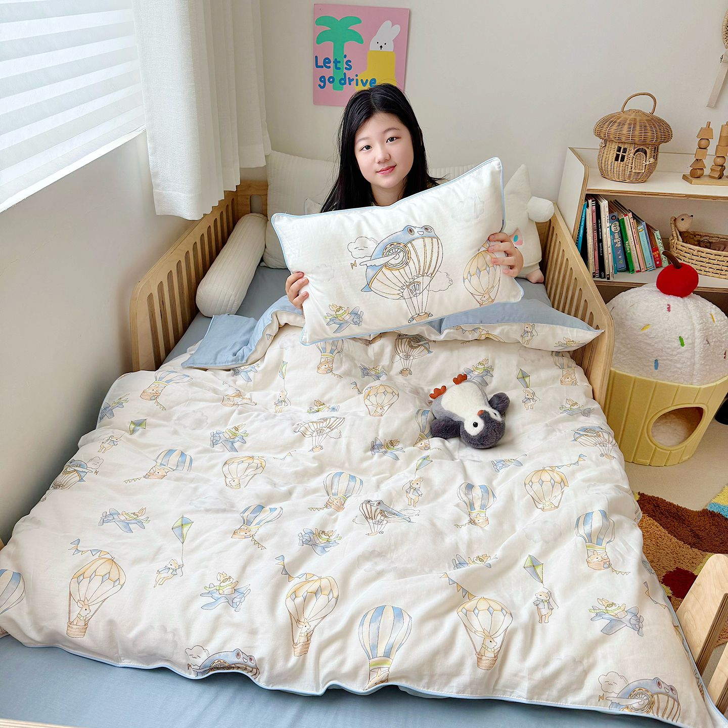 当前位置: 91家纺网 > 商品网购 > 床品套件 > 三件套 > 萌宝家纺 2025新款母婴A类全棉双层纱儿童被套纯棉纱布三件套 热气球