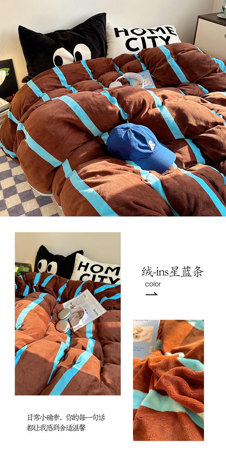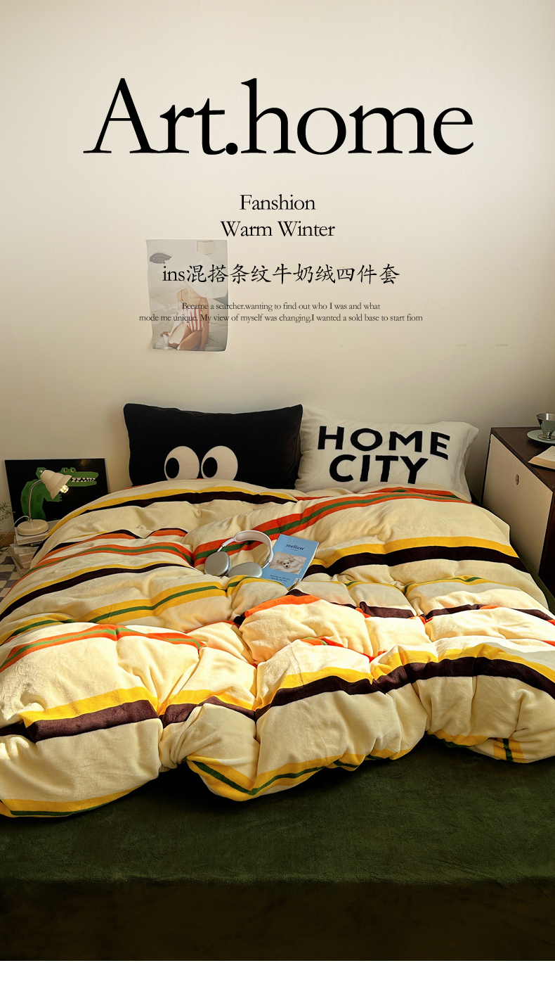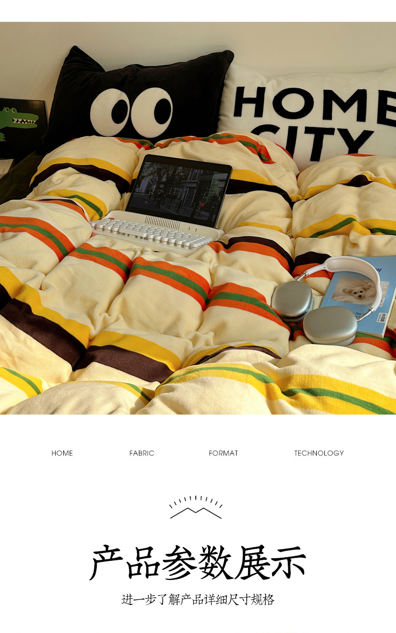 商品名称:蜜宿 2025新款大眼睛混搭条纹牛奶绒四件套(小号三件套枕套默认发黑色大眼睛款!!也可以调换字母款枕套!!) 绒-ins多彩条