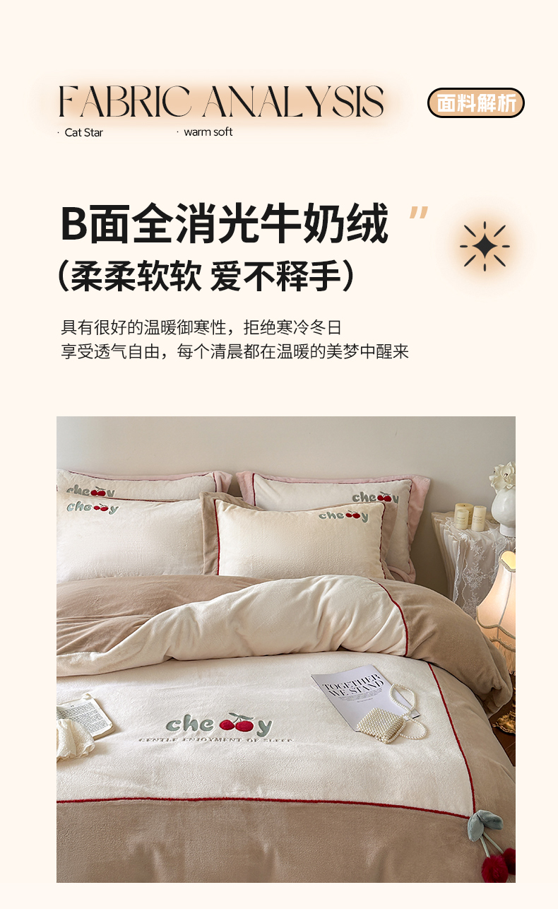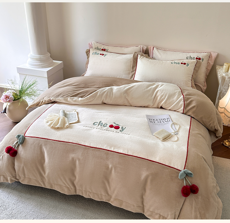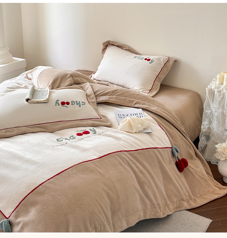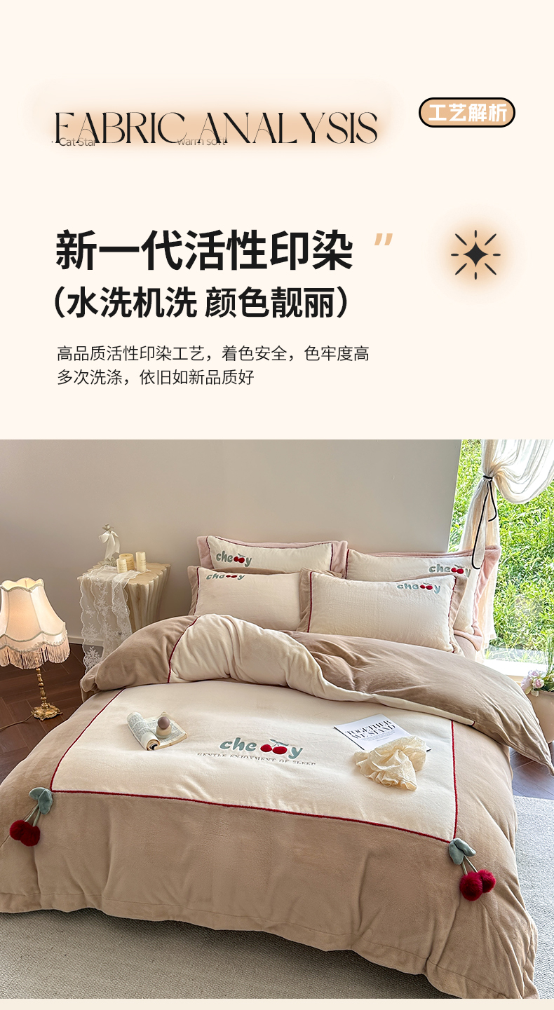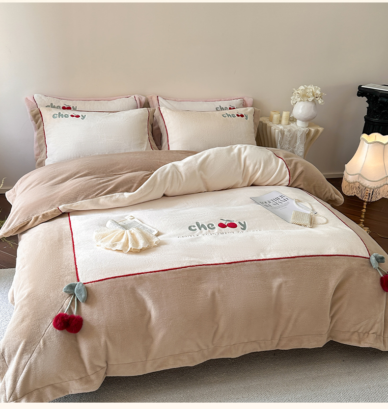 商品名称:艾唯希家纺 2025新款小兔毛全消光牛奶绒工艺四件套-绒樱桃系列 绒樱桃-驼