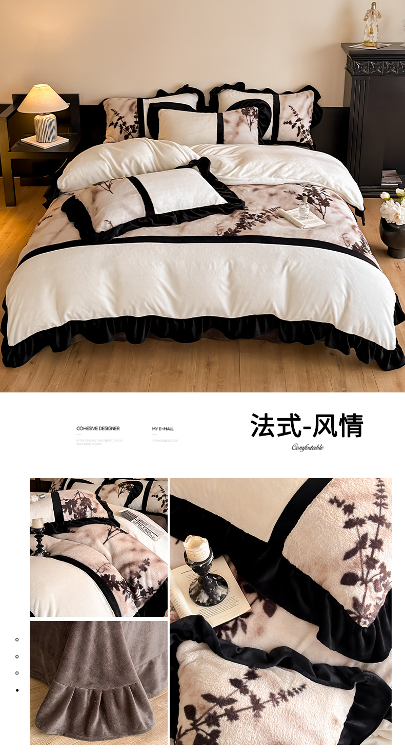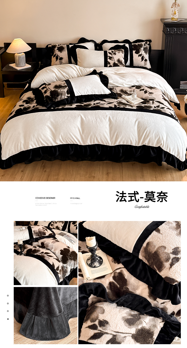 (总)子曰 2025新款A类法式小香风黑边款兔绒牛奶绒四件套,黑边款-豹纹灰,黑边款-赫本,黑边款-花语,黑边款-曼丽,黑边款-莫奈,黑边款-萦漫