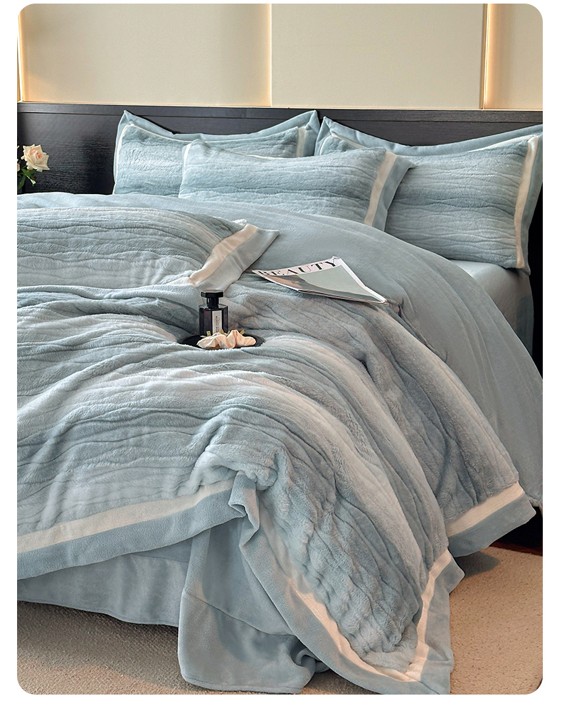 商品名称:绘萱家居 2025新款亲肤舒适双拼边雕花兔毛绒四件套-爱丁堡 爱丁堡-蓝