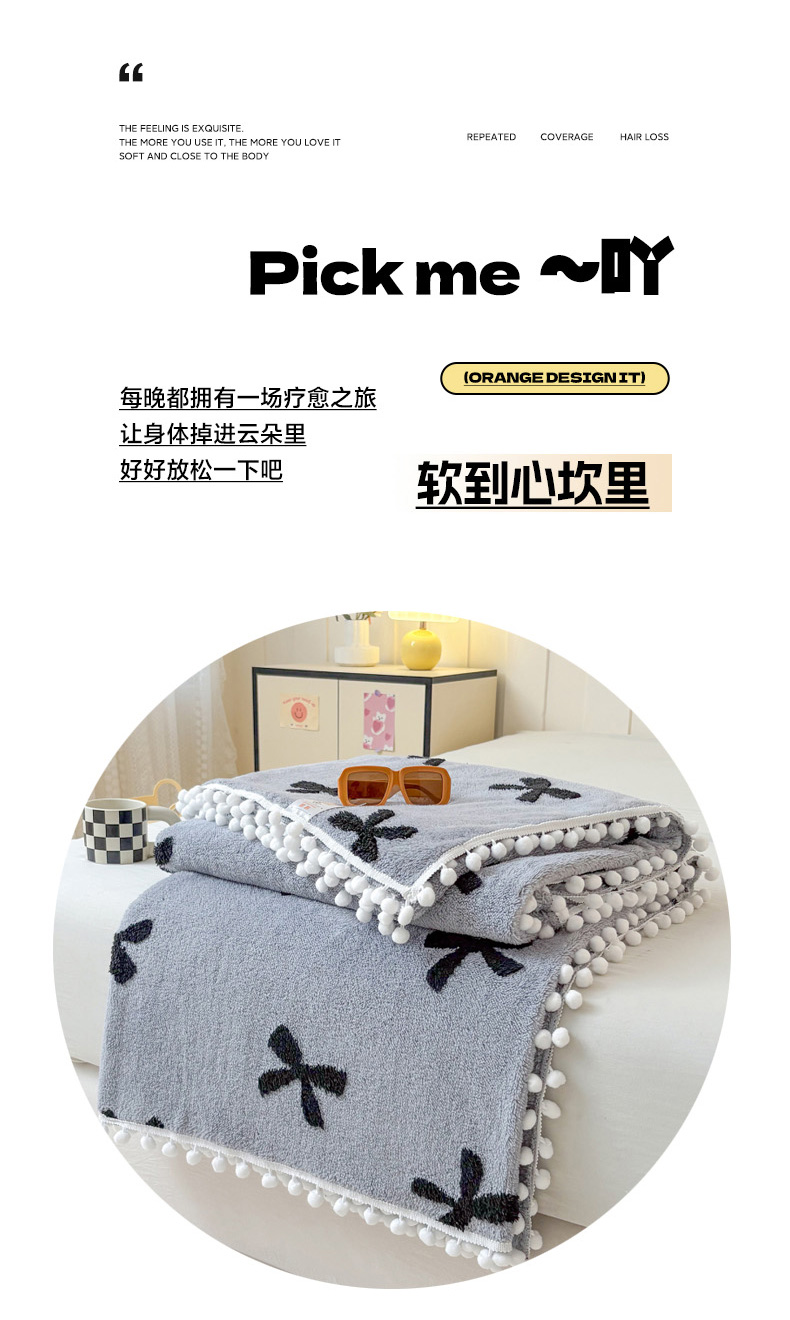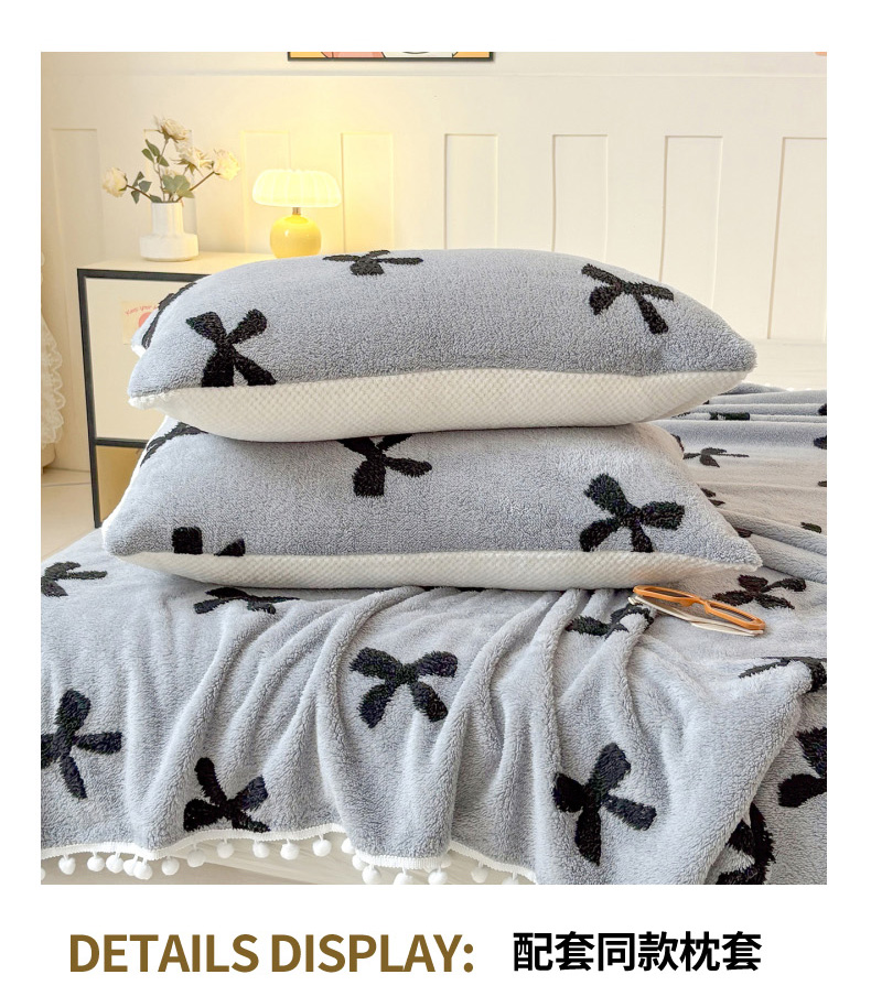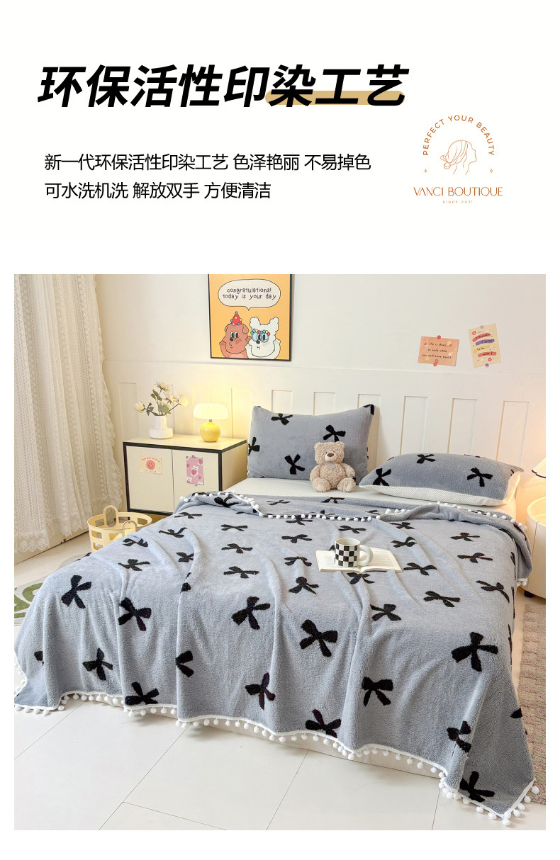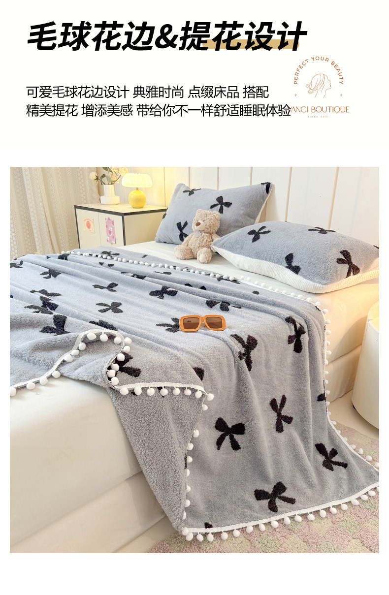 商品名称:恋佳居 2025新款高克重提花舒棉绒吊球花边毛毯 蝴蝶结