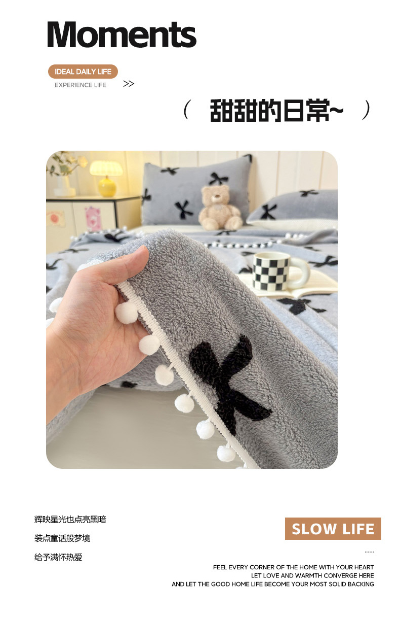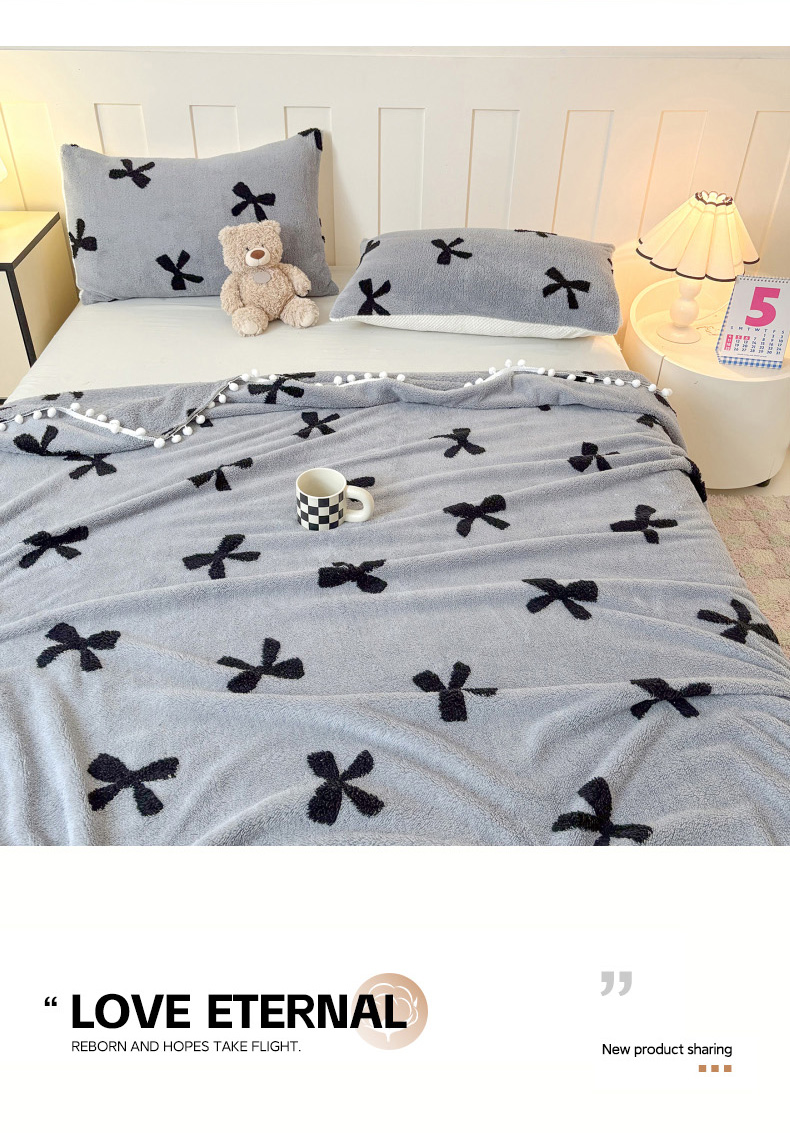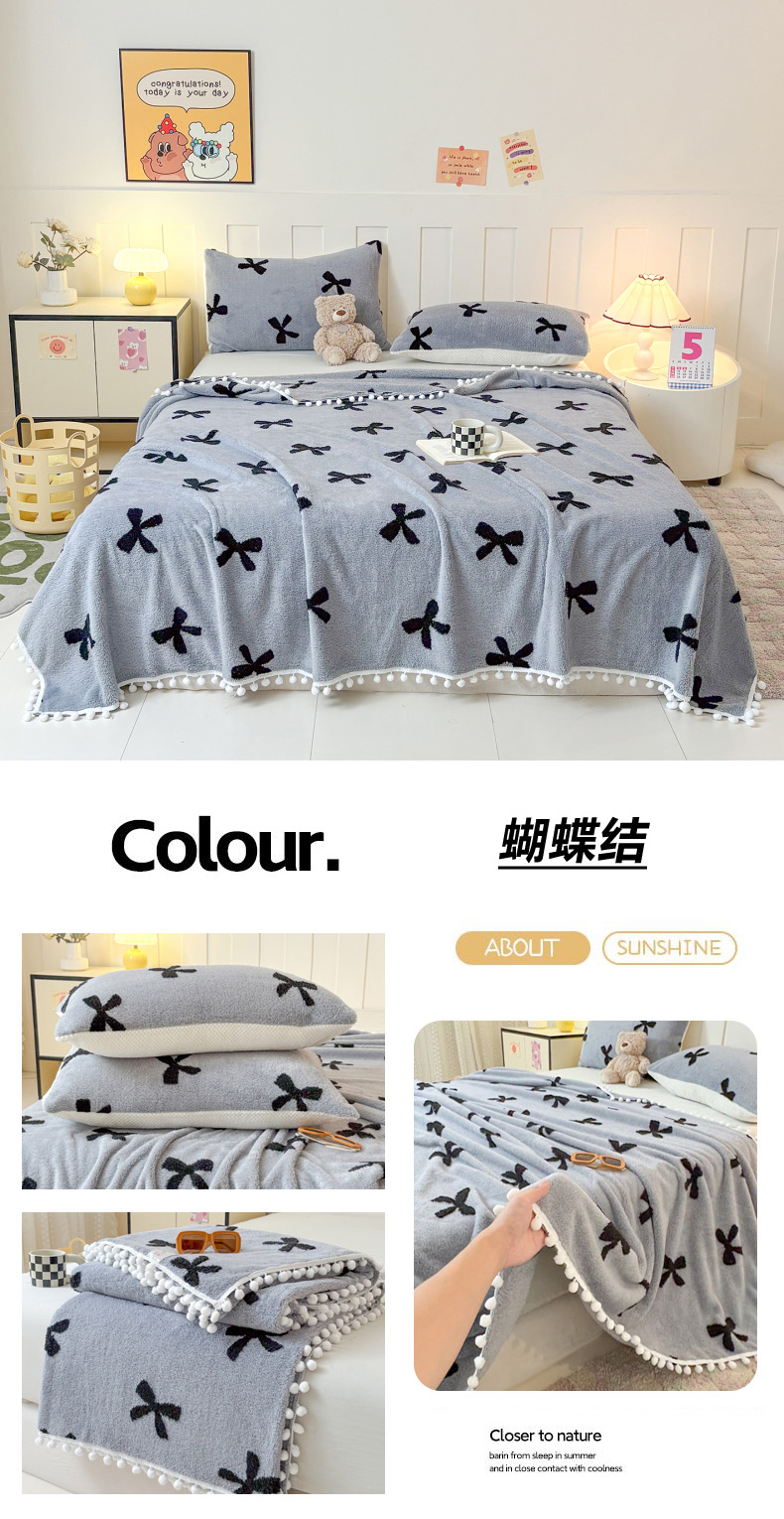 商品名称:恋佳居 2025新款高克重提花舒棉绒吊球花边毛毯 蝴蝶结