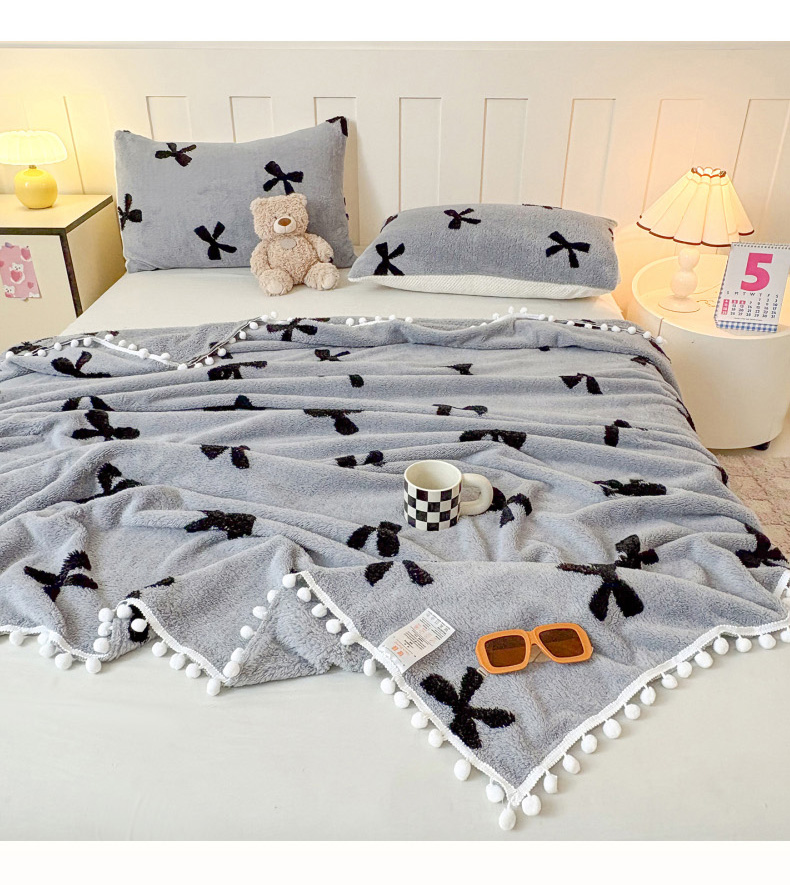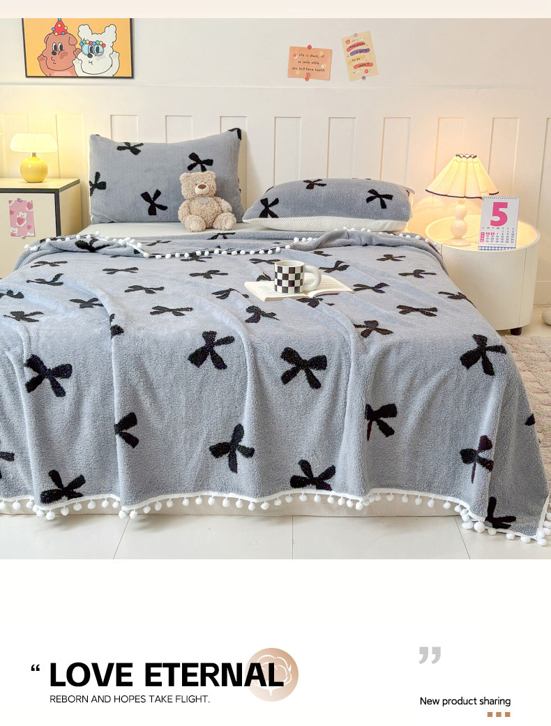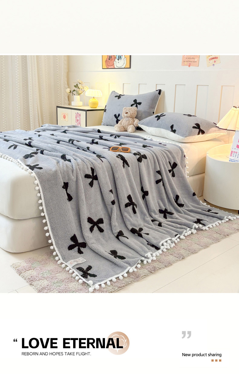 恋佳居 2025新款高克重提花舒棉绒吊球花边毛毯 蝴蝶结