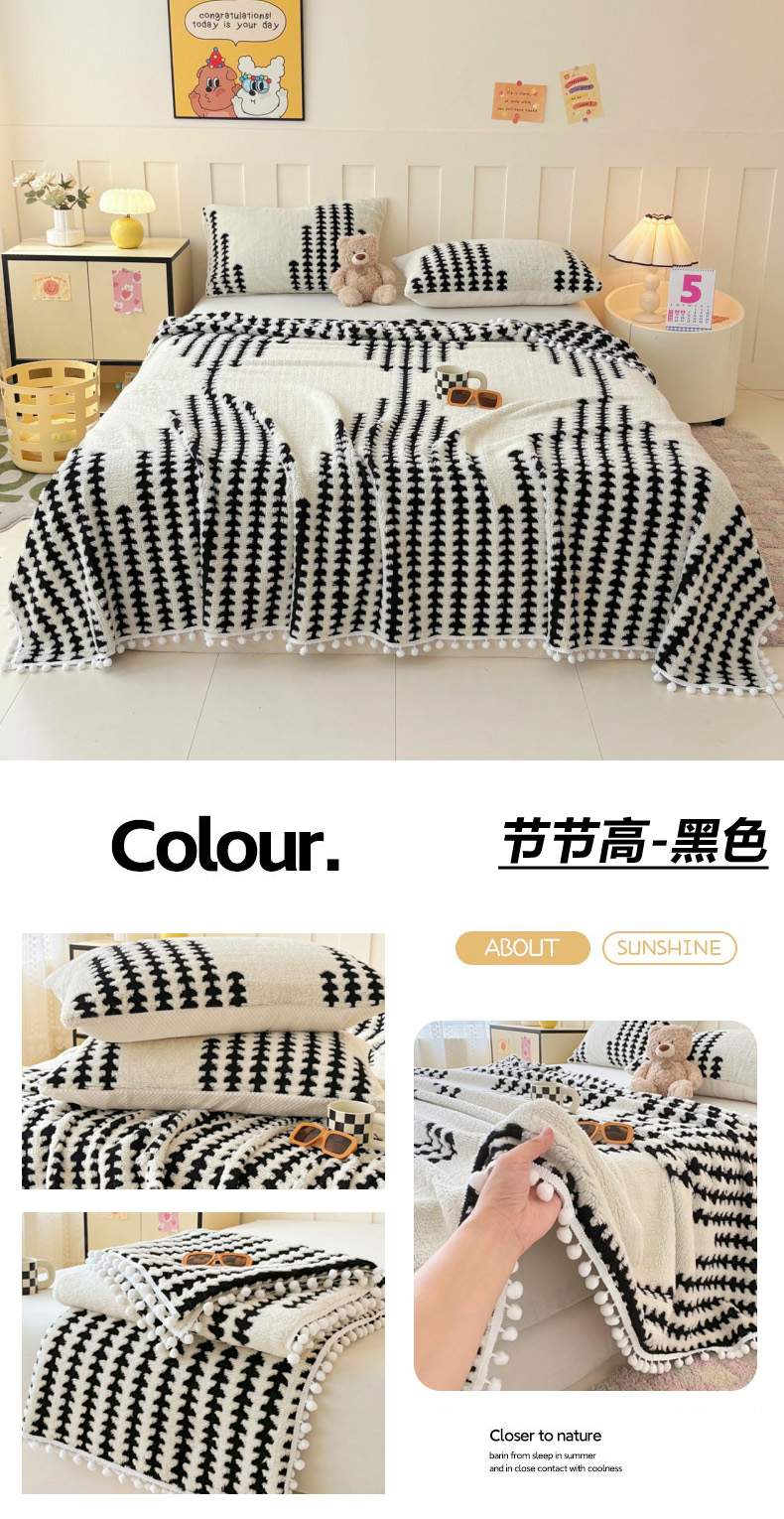 (总)恋佳居 2025新款高克重提花舒棉绒吊球花边毛毯,蝴蝶结,蝶儿飞,节节高-黑色,节节高-灰色,节节高-卡其色