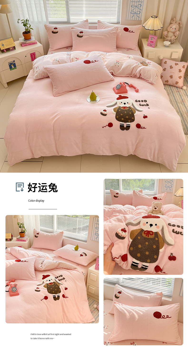 (总)寐居家纺 2025新款贴布绣高克重牛奶绒四件套,安吉拉喵,查理狗,粉糯kitty,皮皮布布