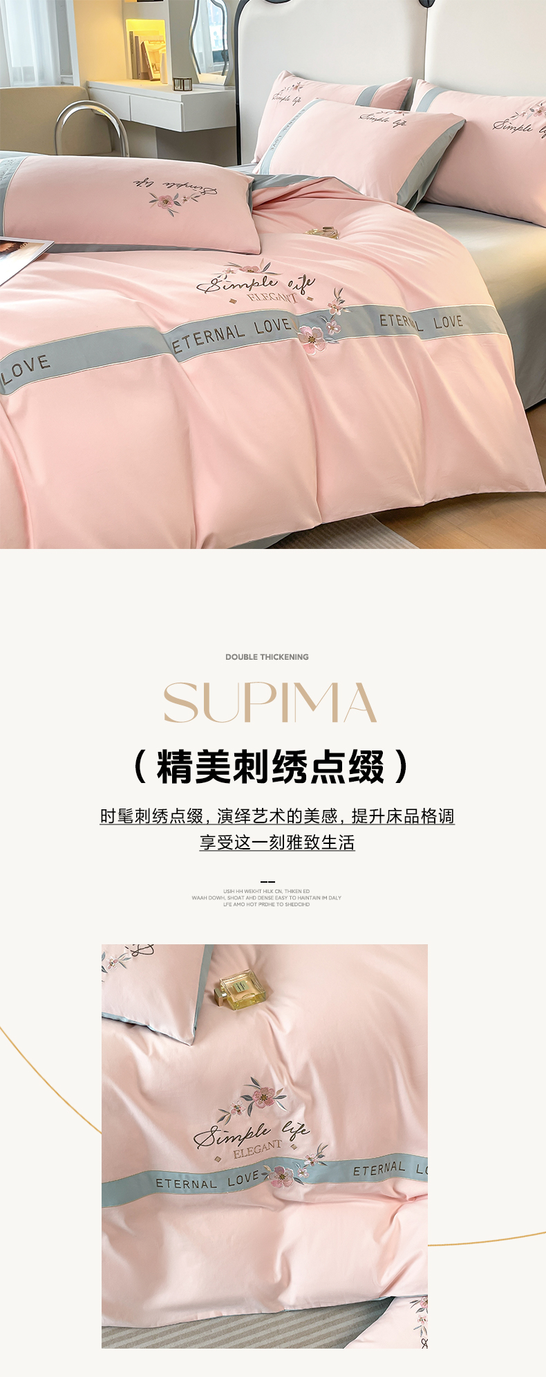 商品名称:桃园 新款纯棉全棉长绒棉磨毛不掉毛刺绣四件套高端礼盒-斯嘉丽 斯嘉丽-轻奢粉