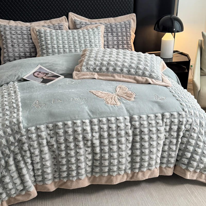 商品名称:保罗圣迪奥 2025新款350克剪花牛奶绒四件套-三拼角蝴蝶 三拼角蝴蝶-咖色