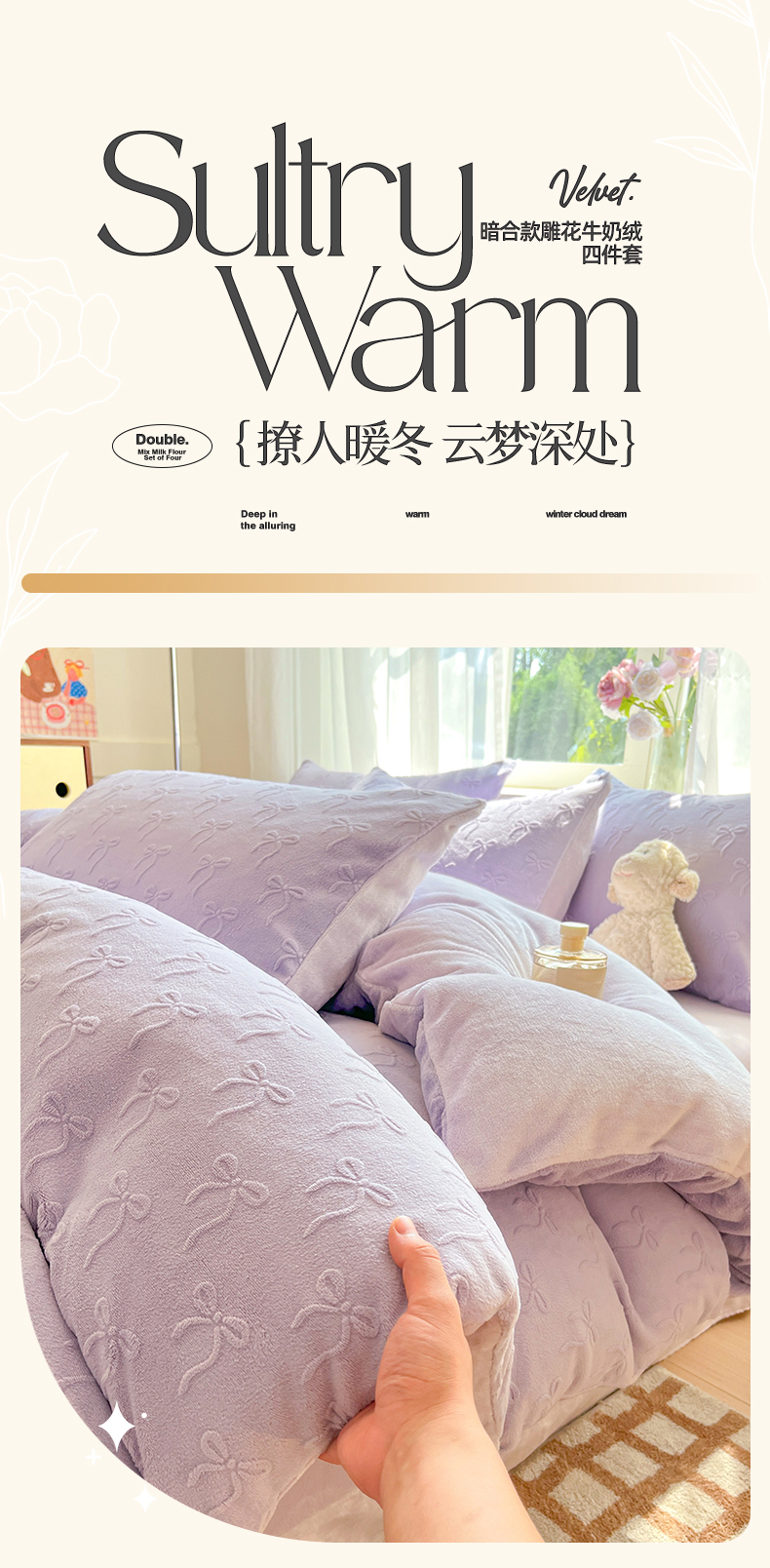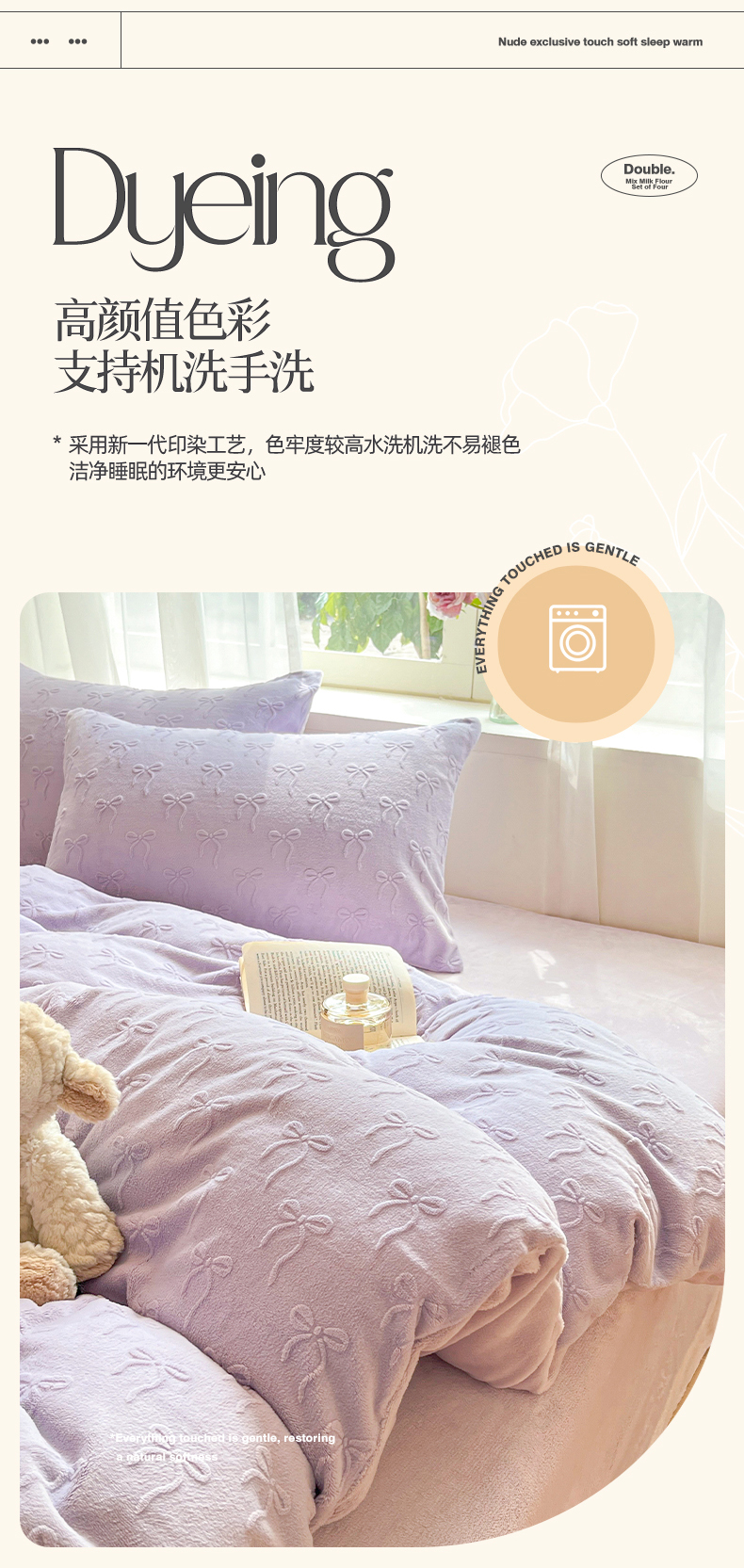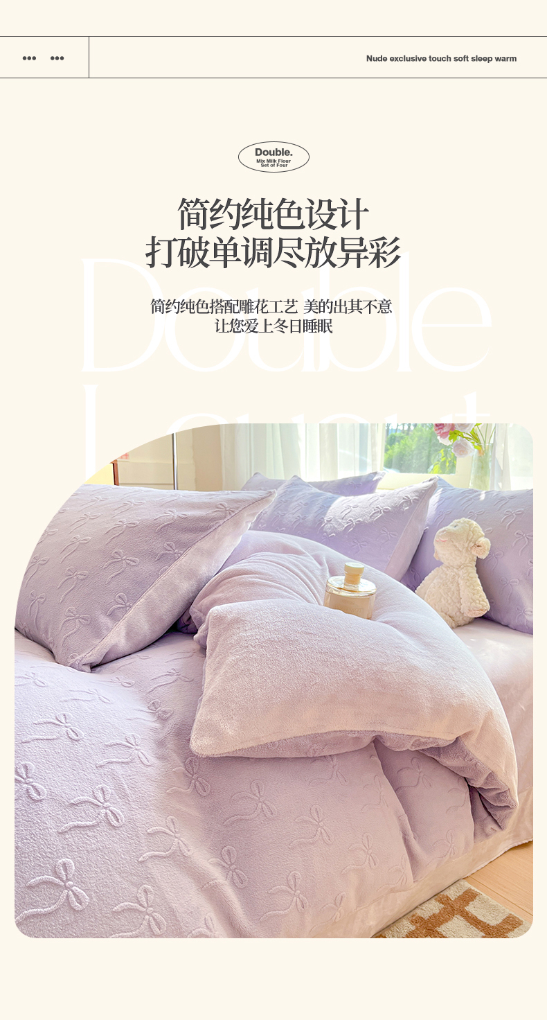 绘萱家居 2025新款高克重雕花雕印纯色牛奶绒四件套双拼法莱绒珊瑚绒 甜蜜结-紫