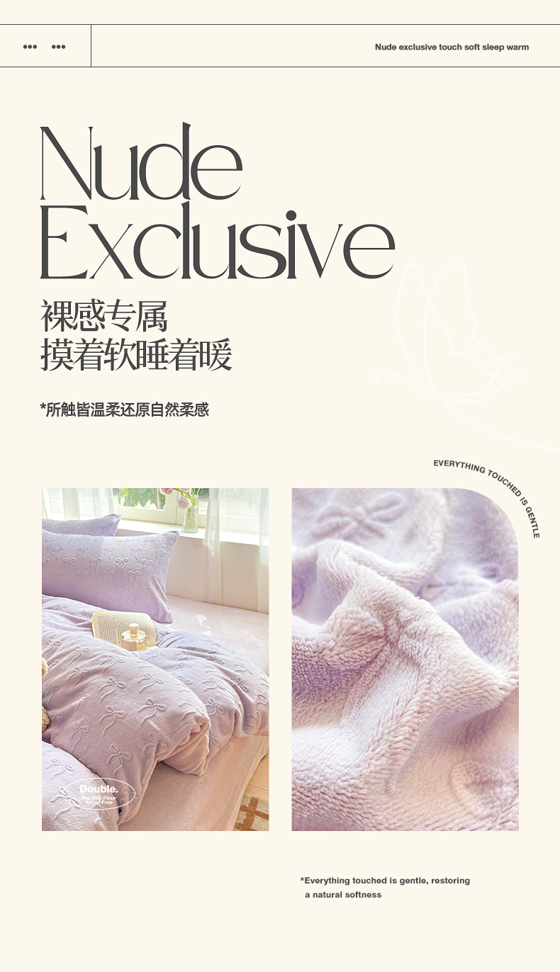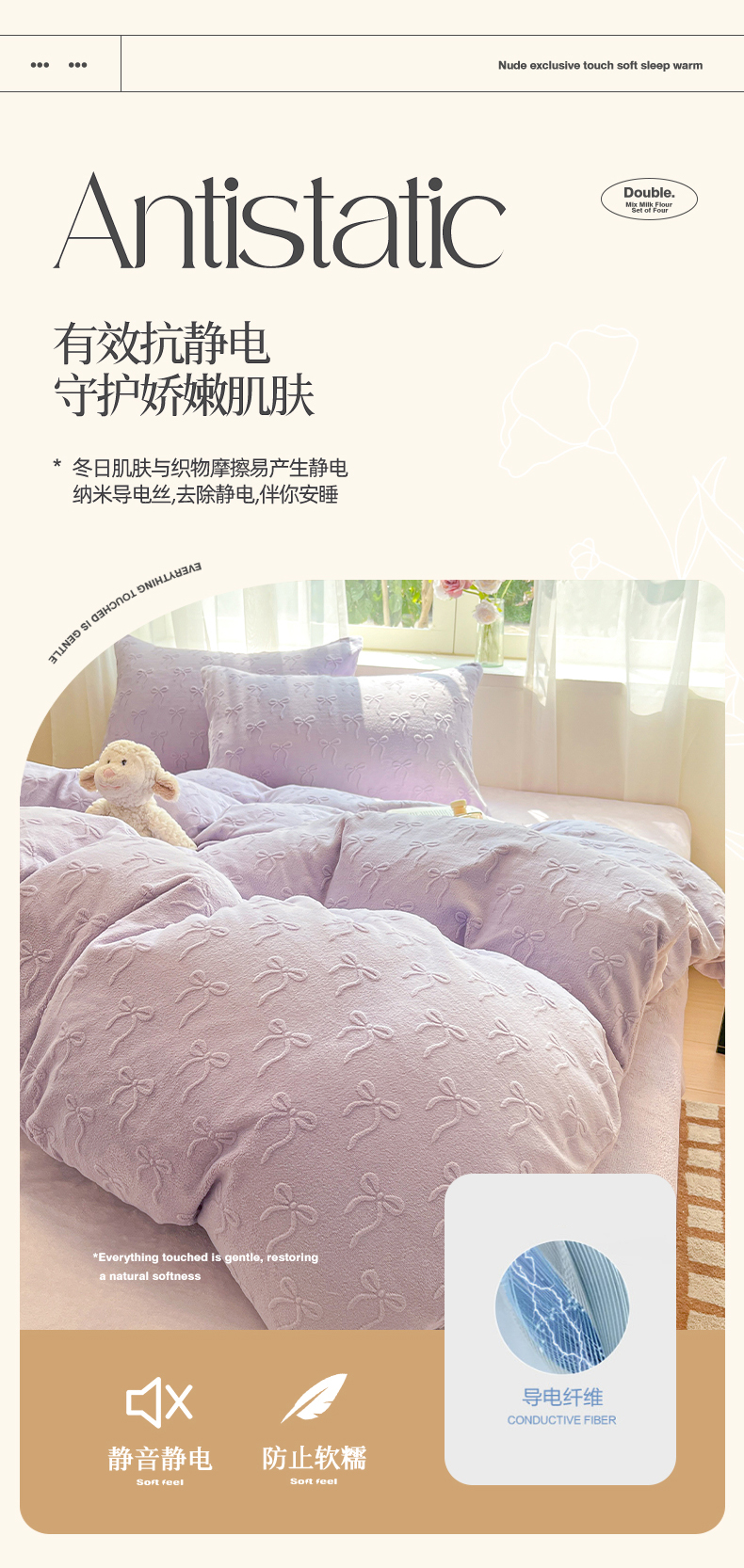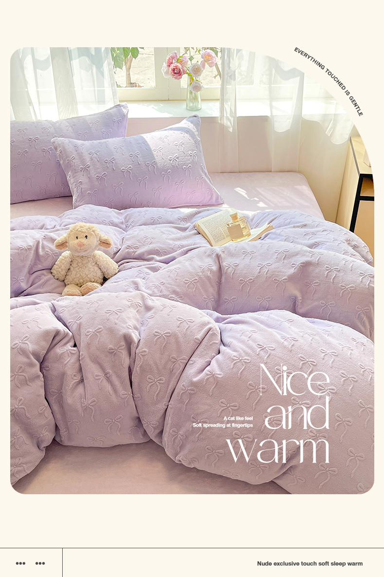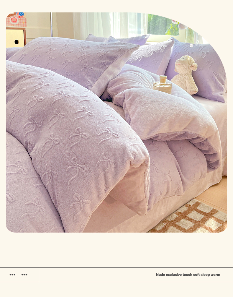 绘萱家居 2025新款高克重雕花雕印纯色牛奶绒四件套双拼法莱绒珊瑚绒 甜蜜结-紫