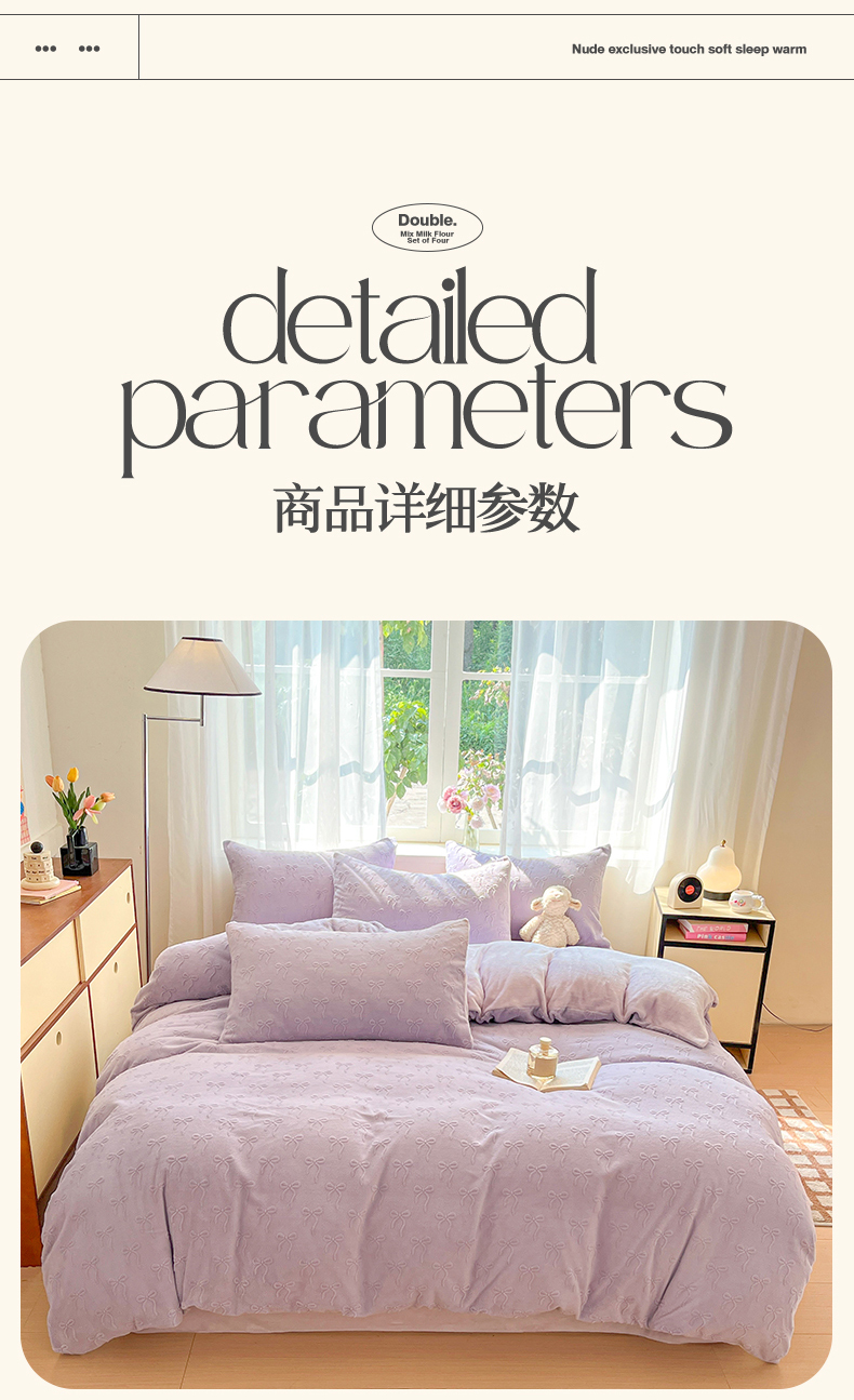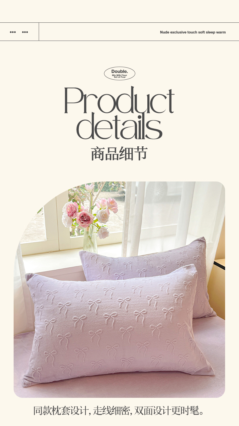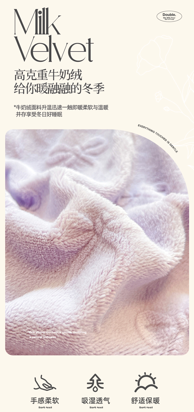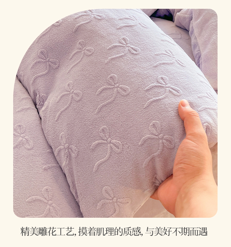 商品名称:绘萱家居 2025新款高克重雕花雕印纯色牛奶绒四件套双拼法莱绒珊瑚绒 甜蜜结-紫
