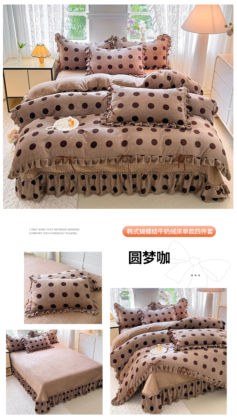 商品名称:韩约家纺 2025新款韩式蝴蝶结牛奶绒床盖款四件套 彩色波点