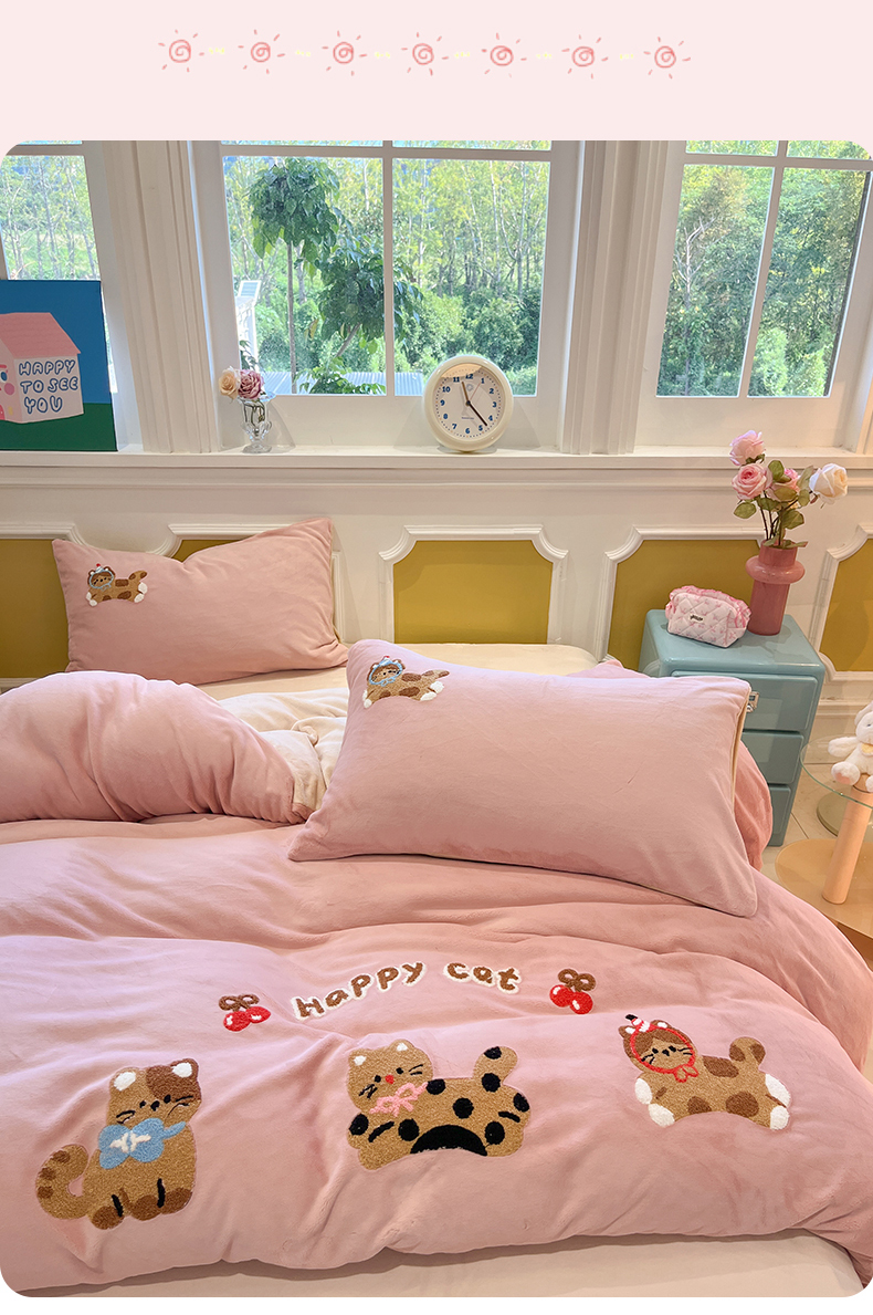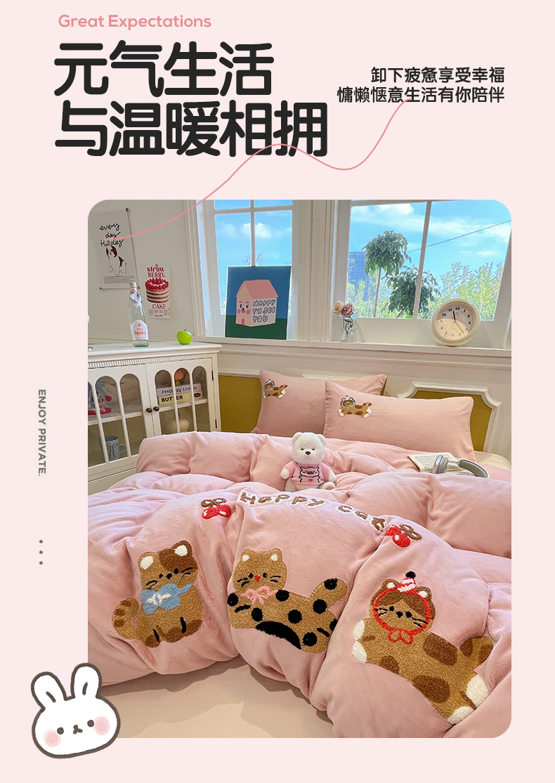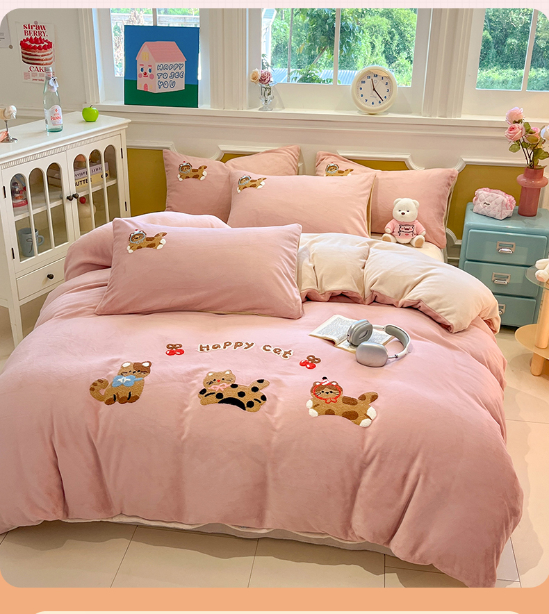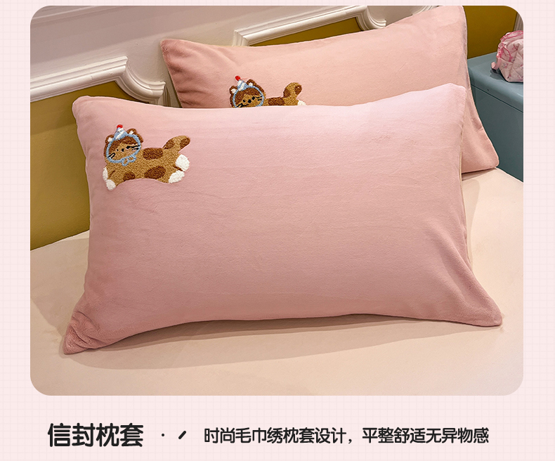 星座家纺 2025新款A类卡通200g牛奶绒毛巾绣四件套 粉糯猫咪