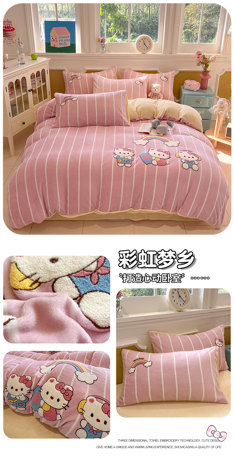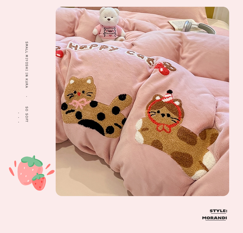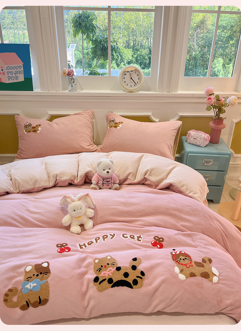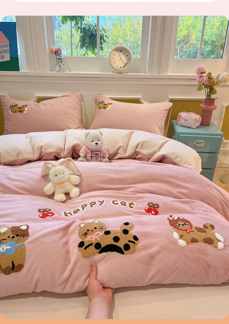 星座家纺 2025新款A类卡通200g牛奶绒毛巾绣四件套 粉糯猫咪