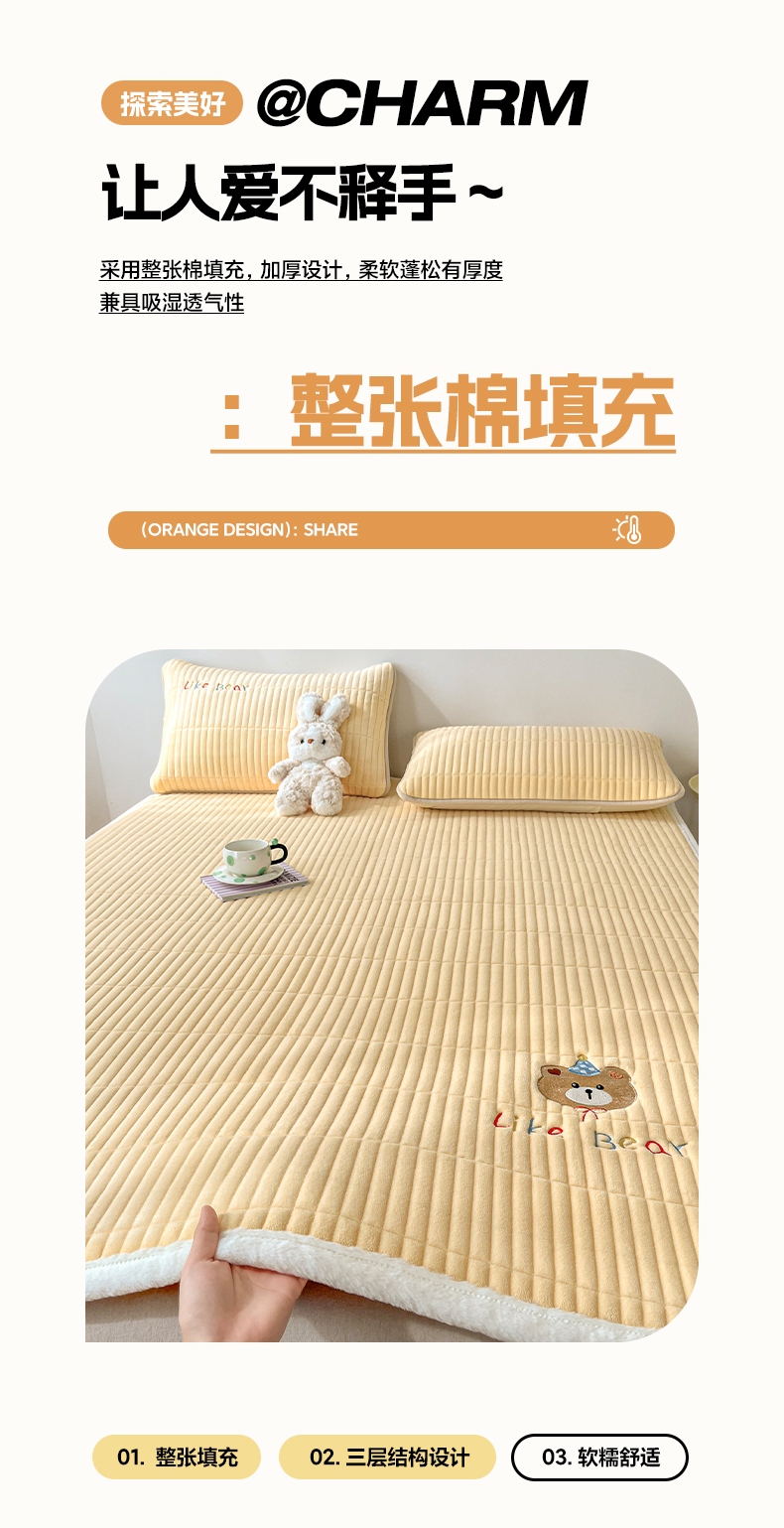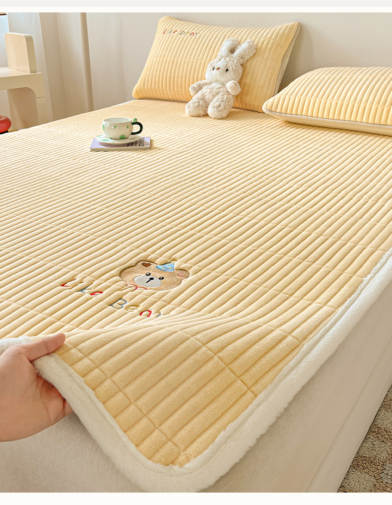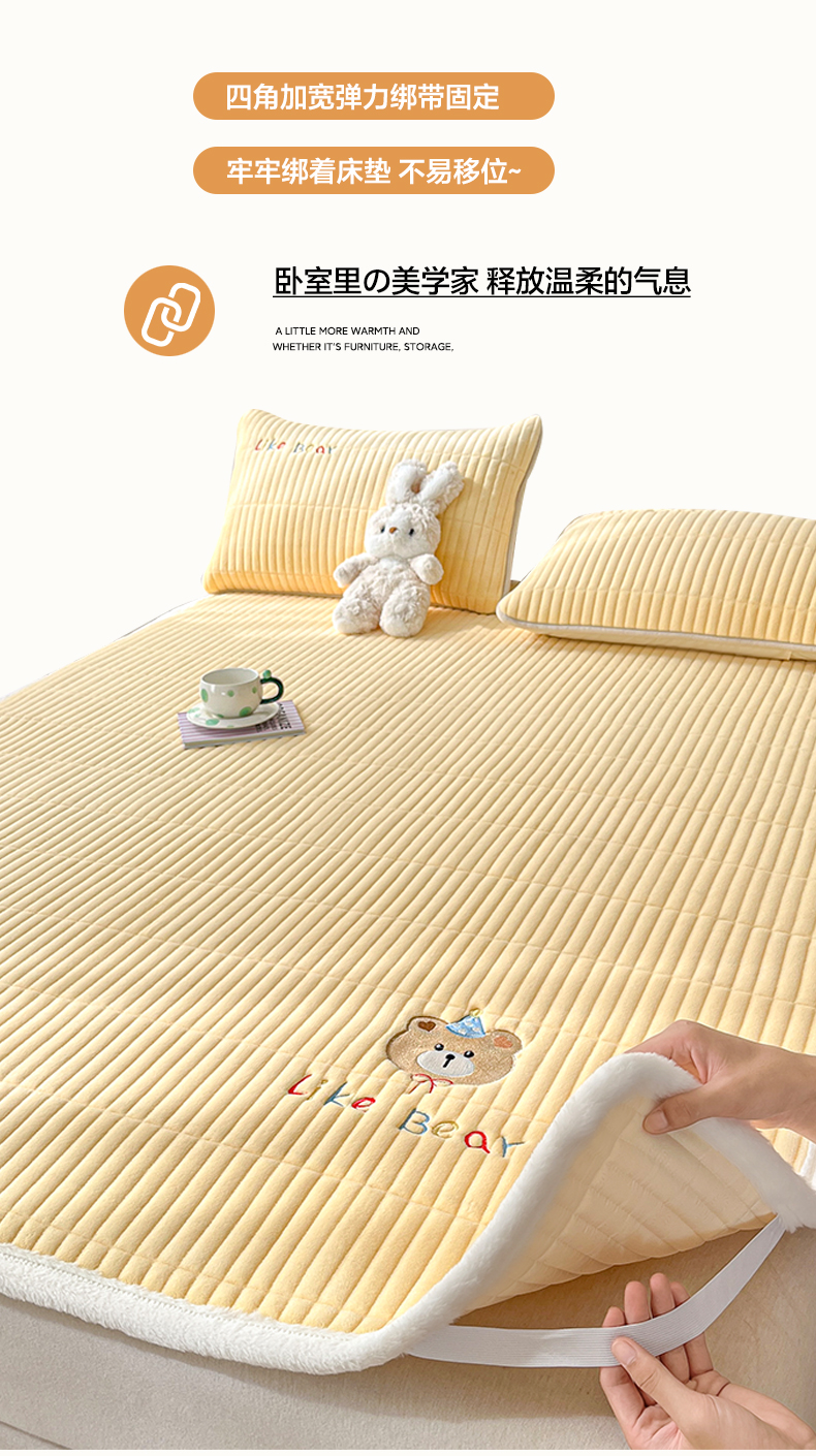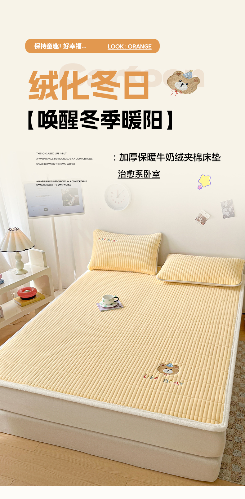 • 91家纺网 家纺一手货源 找家纺 摩妮卡 2025新款加厚保暖牛奶绒夹棉绣花床垫三件套 呆呆熊-黄