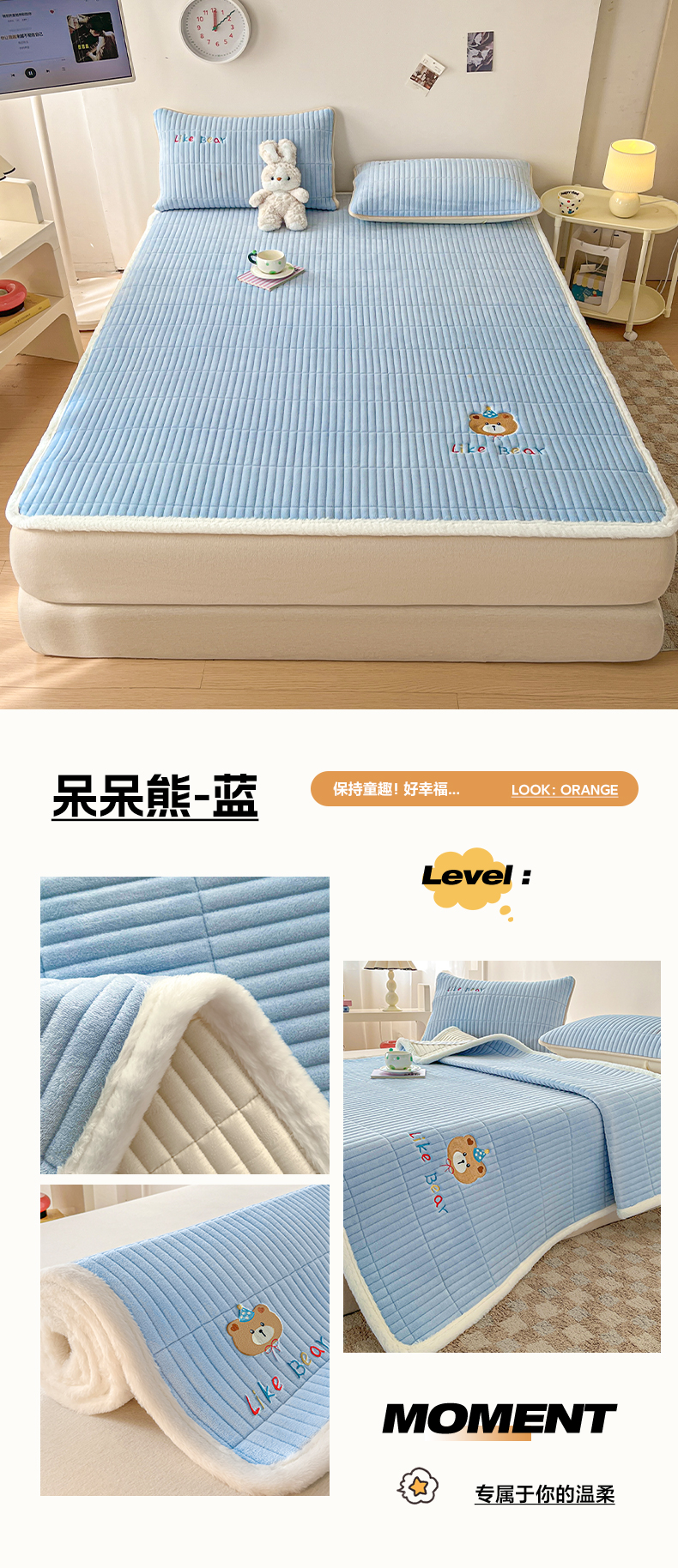 (总)摩妮卡 2025新款加厚保暖牛奶绒夹棉绣花床垫三件套,呆呆熊-蓝,呆呆熊-黄,呆呆熊-咖,Kitty猫-白,Kitty猫-粉,Kitty猫-紫