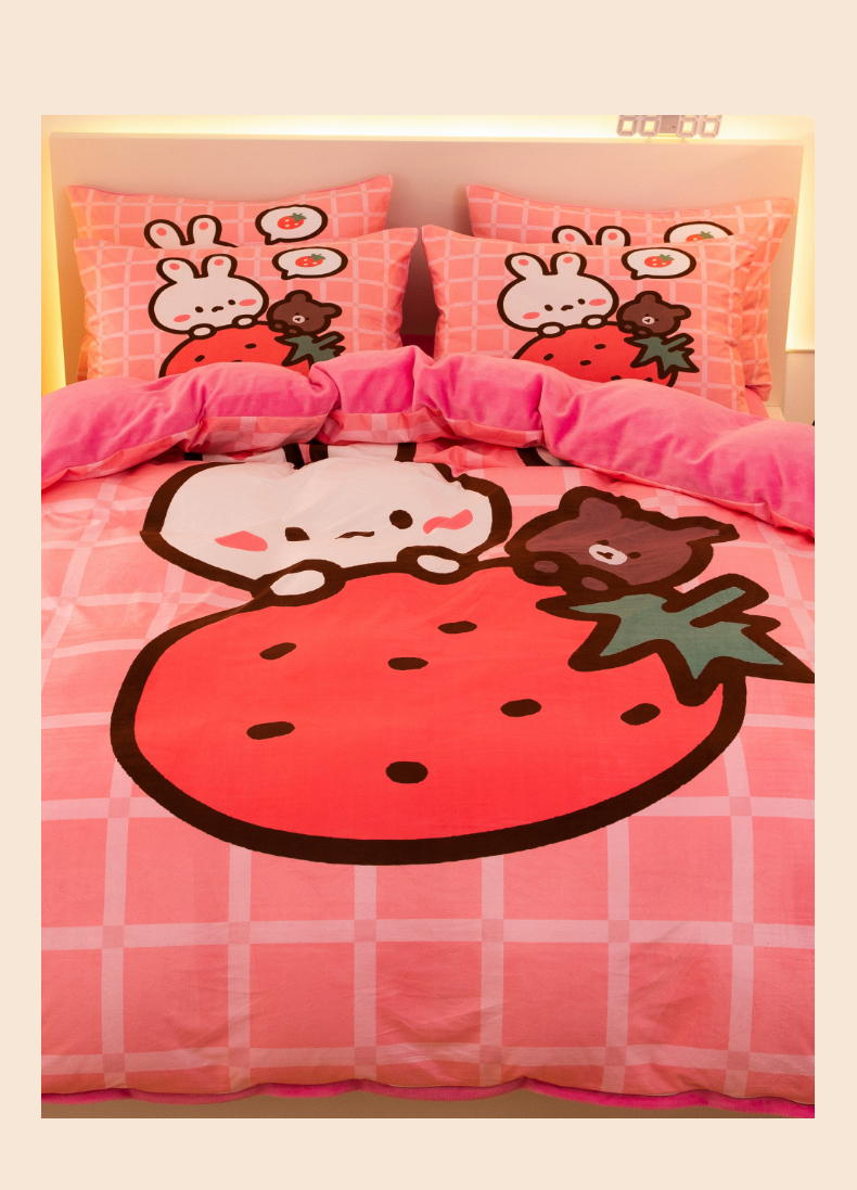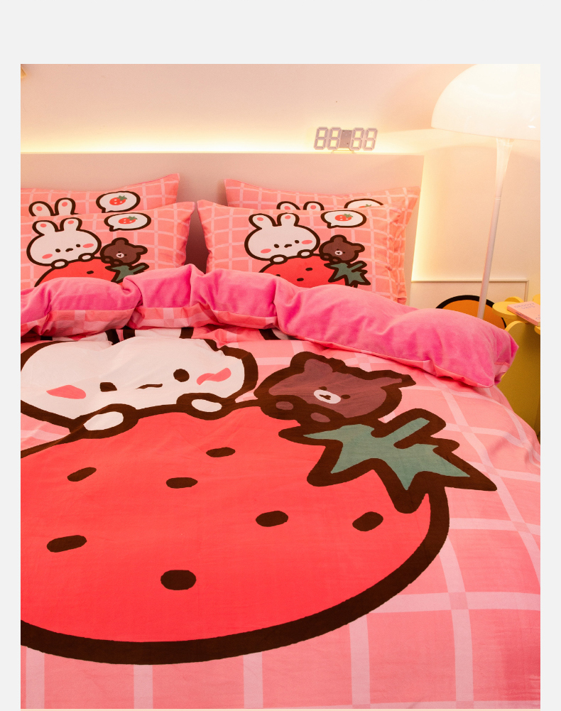 一电 2025外贸跨境电商儿童卡通床上四件套亲肤牛奶绒学生三件床单被套加大珊瑚宝宝卡通单被套3 草莓动物