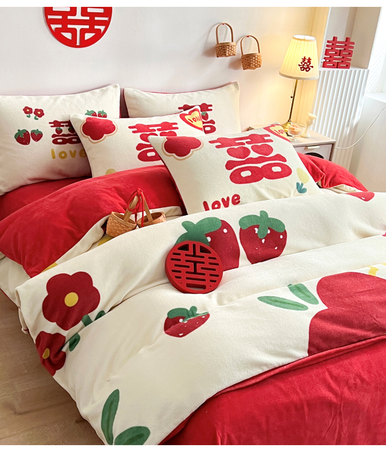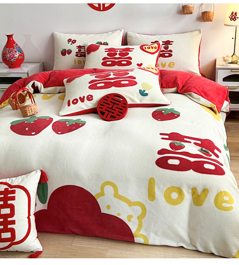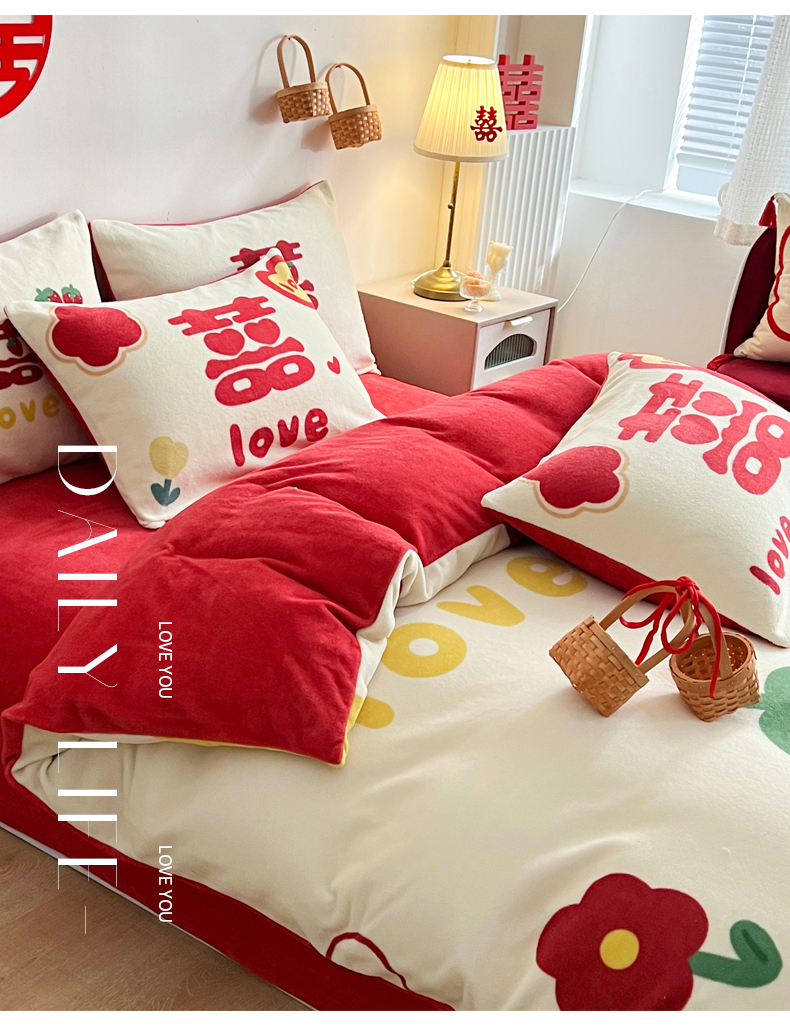 一电 2025新款网红花婚庆牛奶绒四件套结婚喜被大红色新婚被罩婚嫁妆被套床单 爱你一生