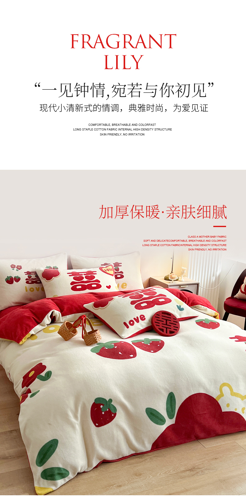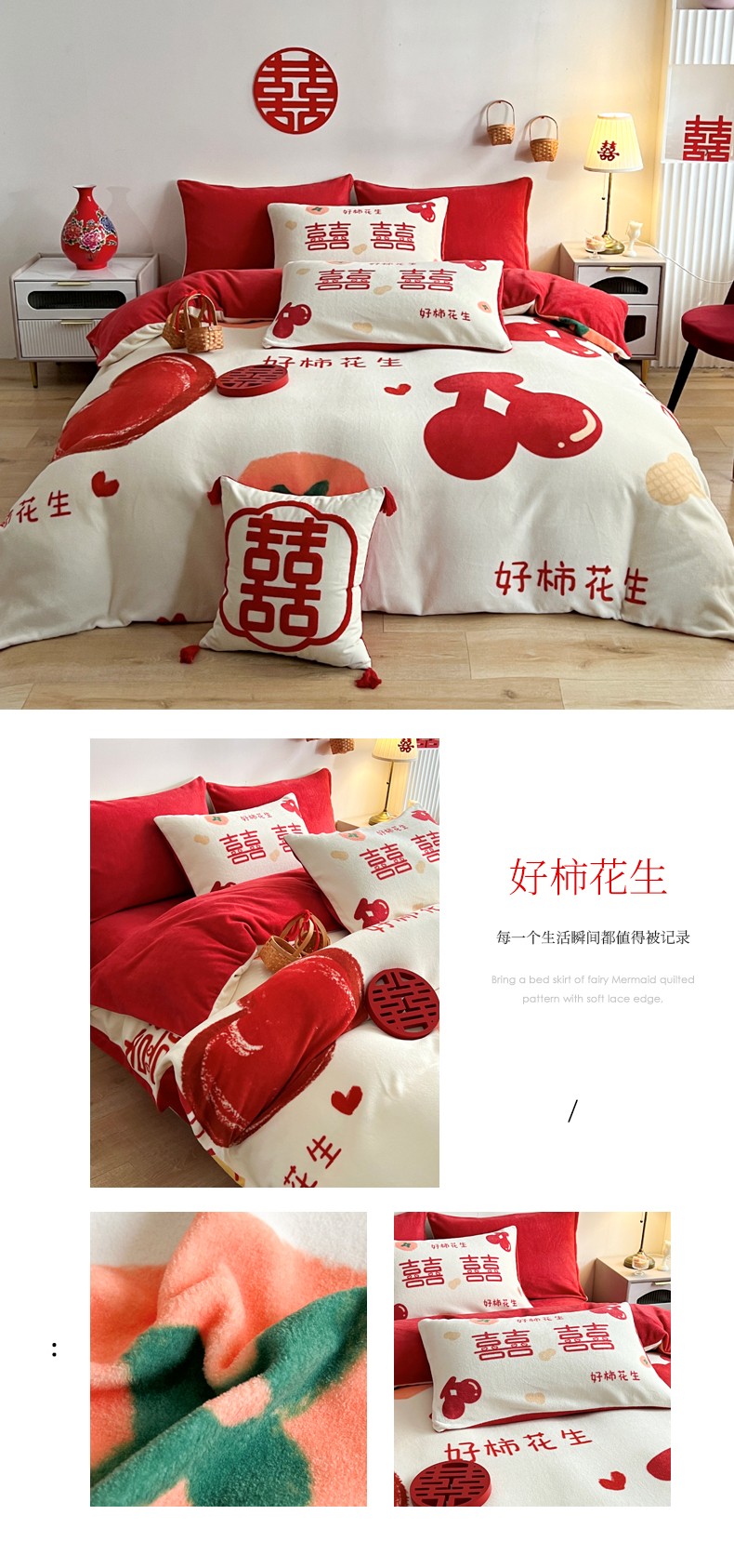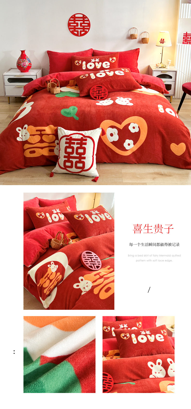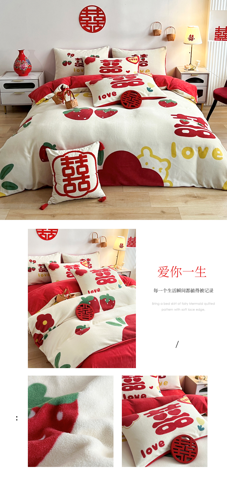 商品名称:一电 2025新款网红花婚庆牛奶绒四件套结婚喜被大红色新婚被罩婚嫁妆被套床单 爱你一生