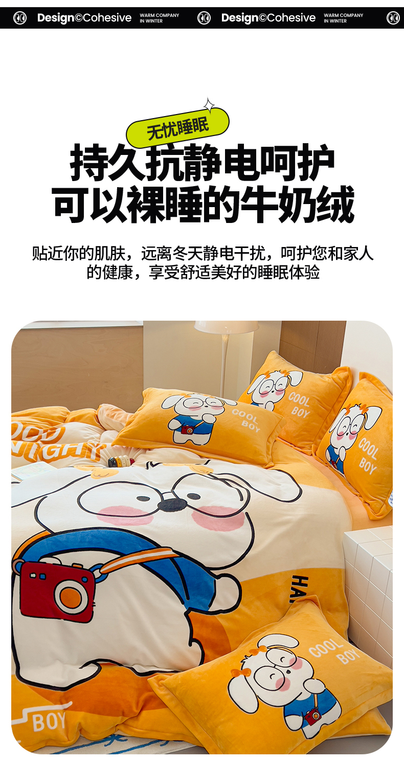 福来临家纺 2025牛奶绒大版卡通四件套 眼镜小崽