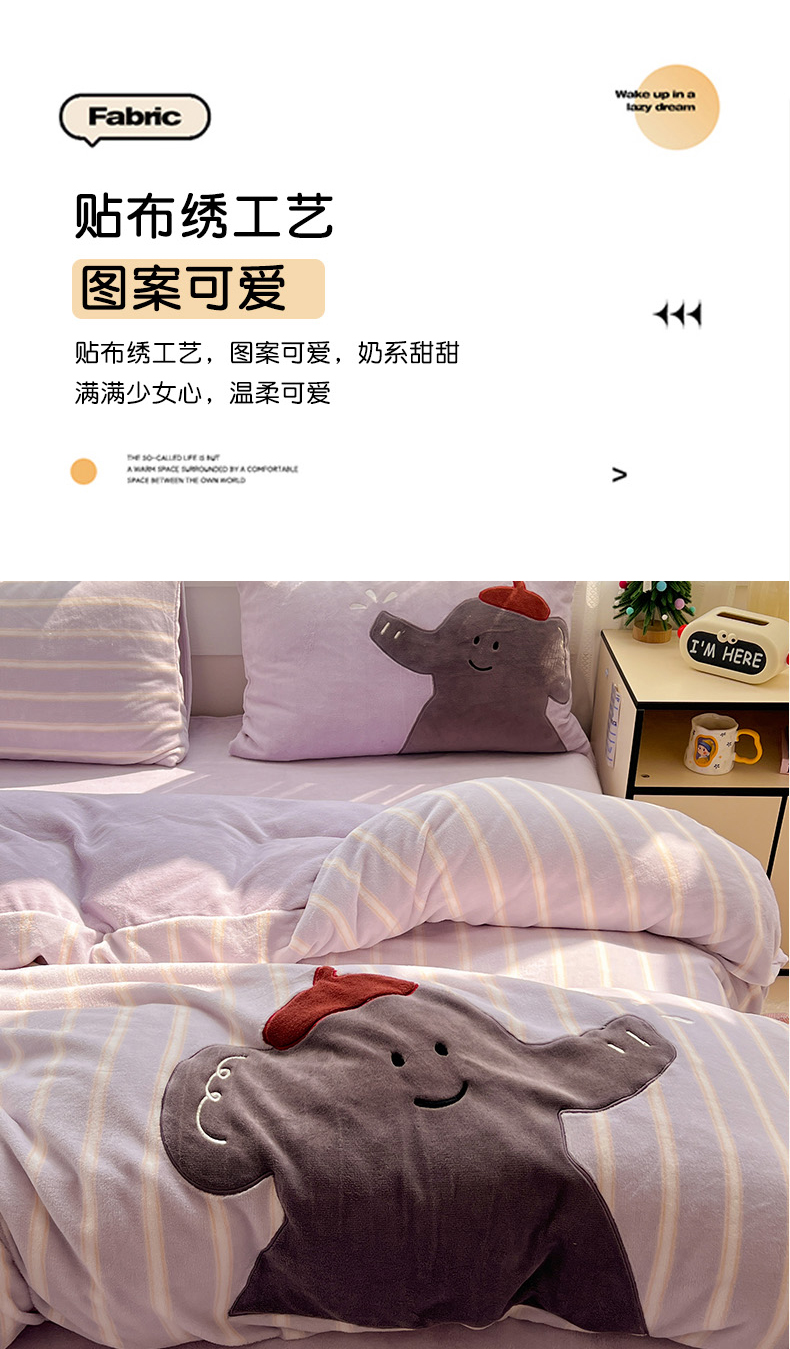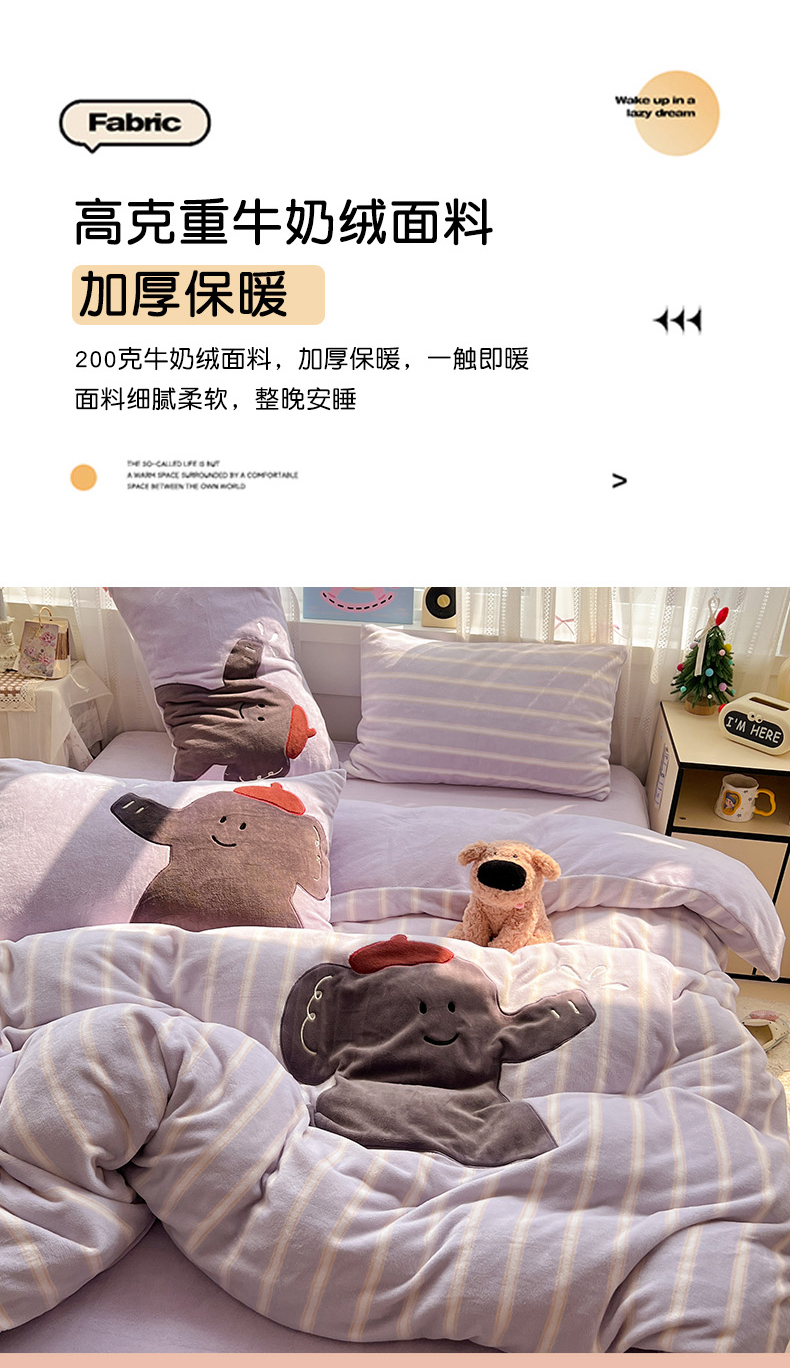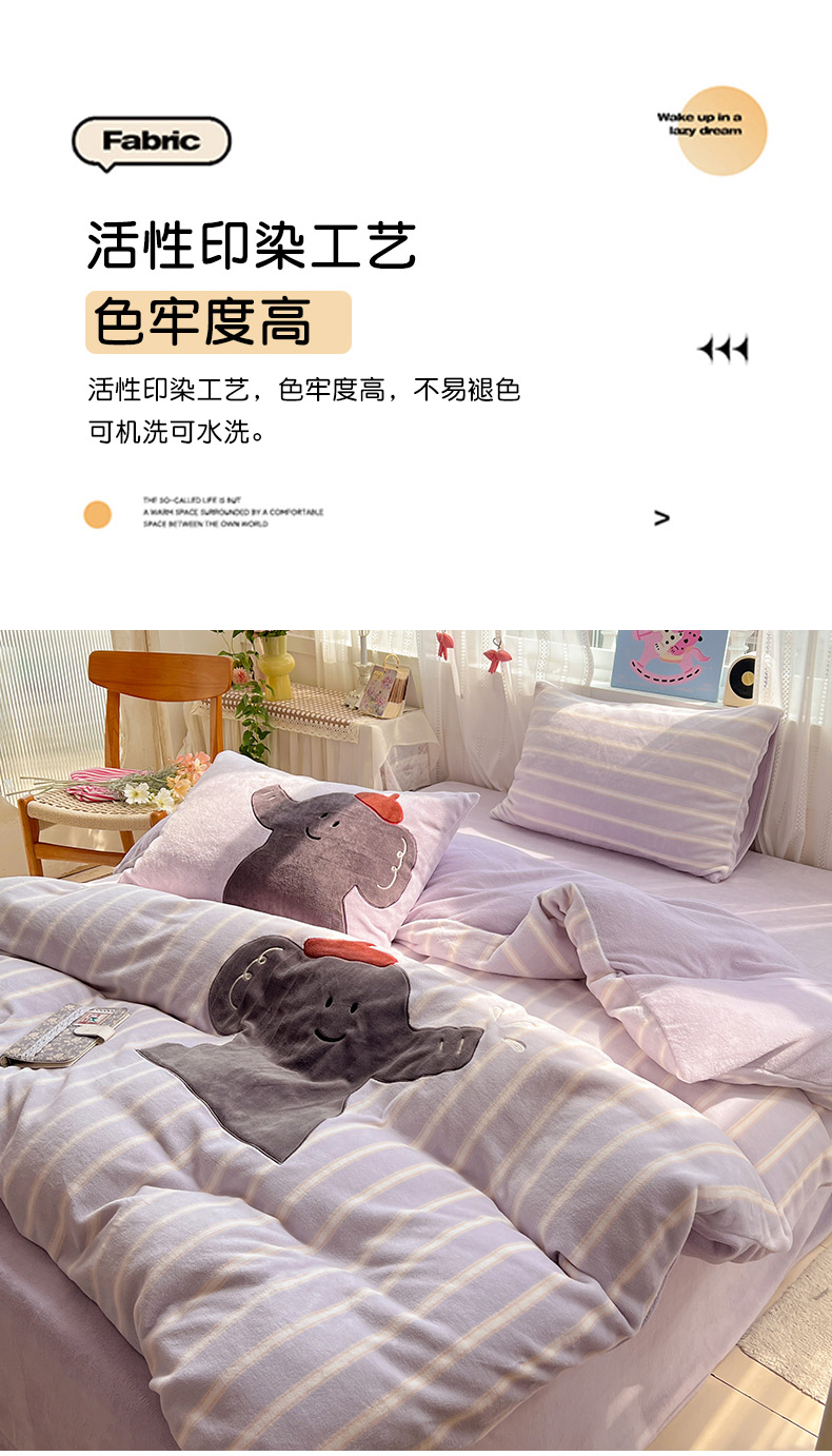 品乐家纺 2025秋冬新款高克重牛奶绒贴布绣四件套 条纹小象-紫