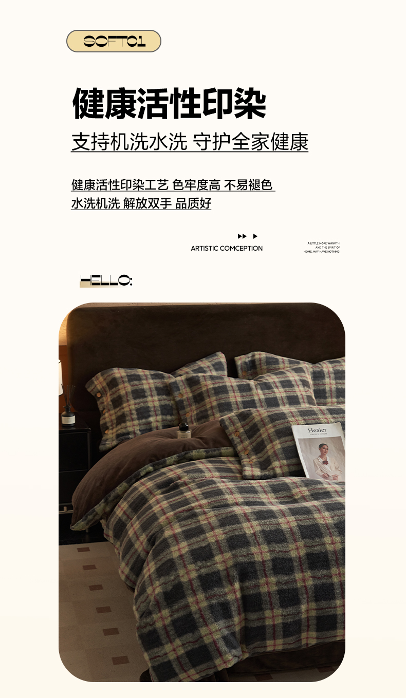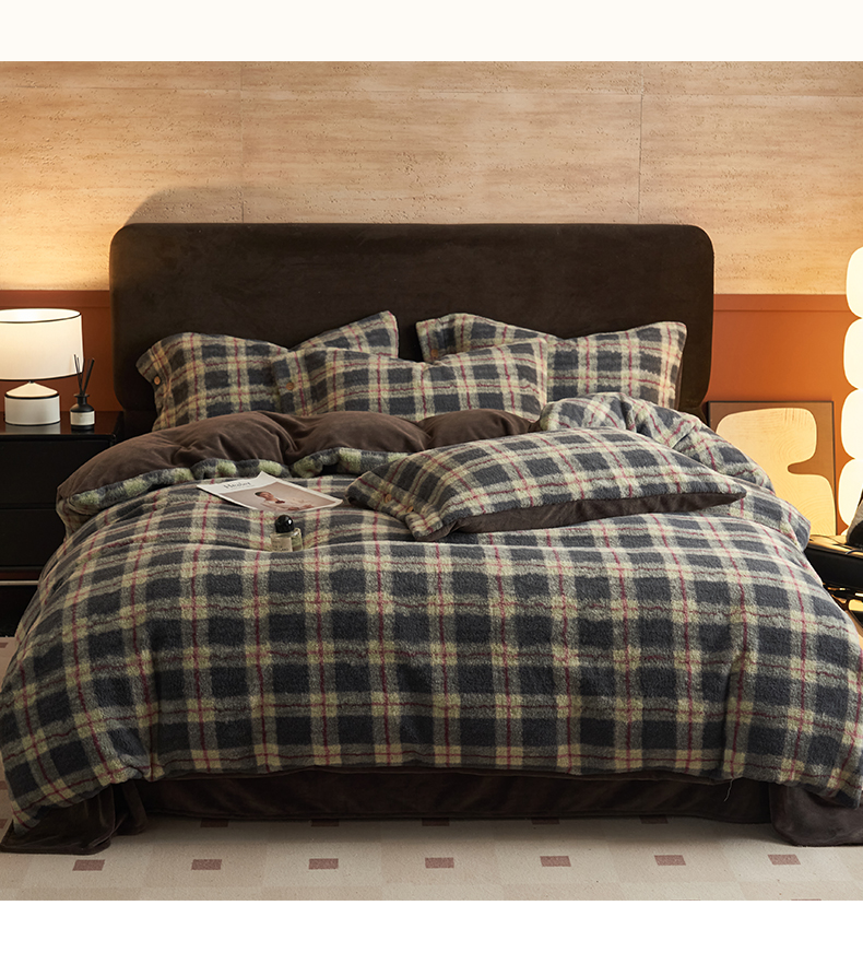商品名称:早晨家纺 2025新款230g羊驼绒复古格牛奶绒四件套 雾里青格