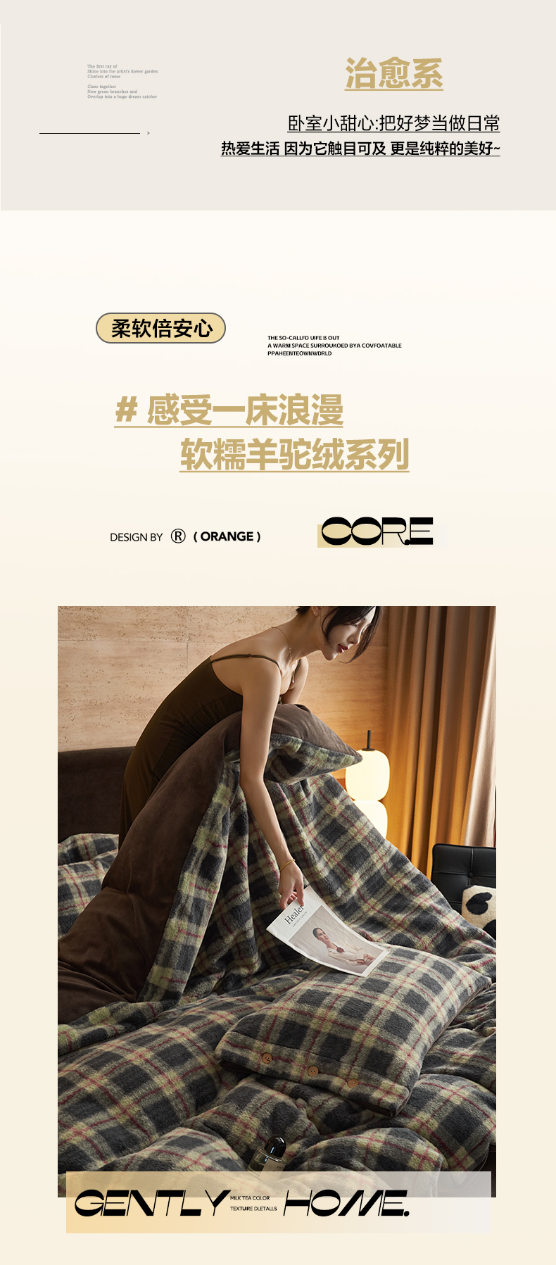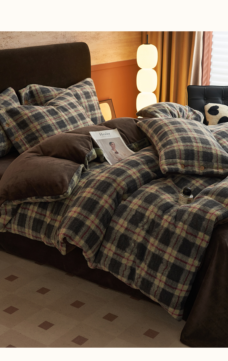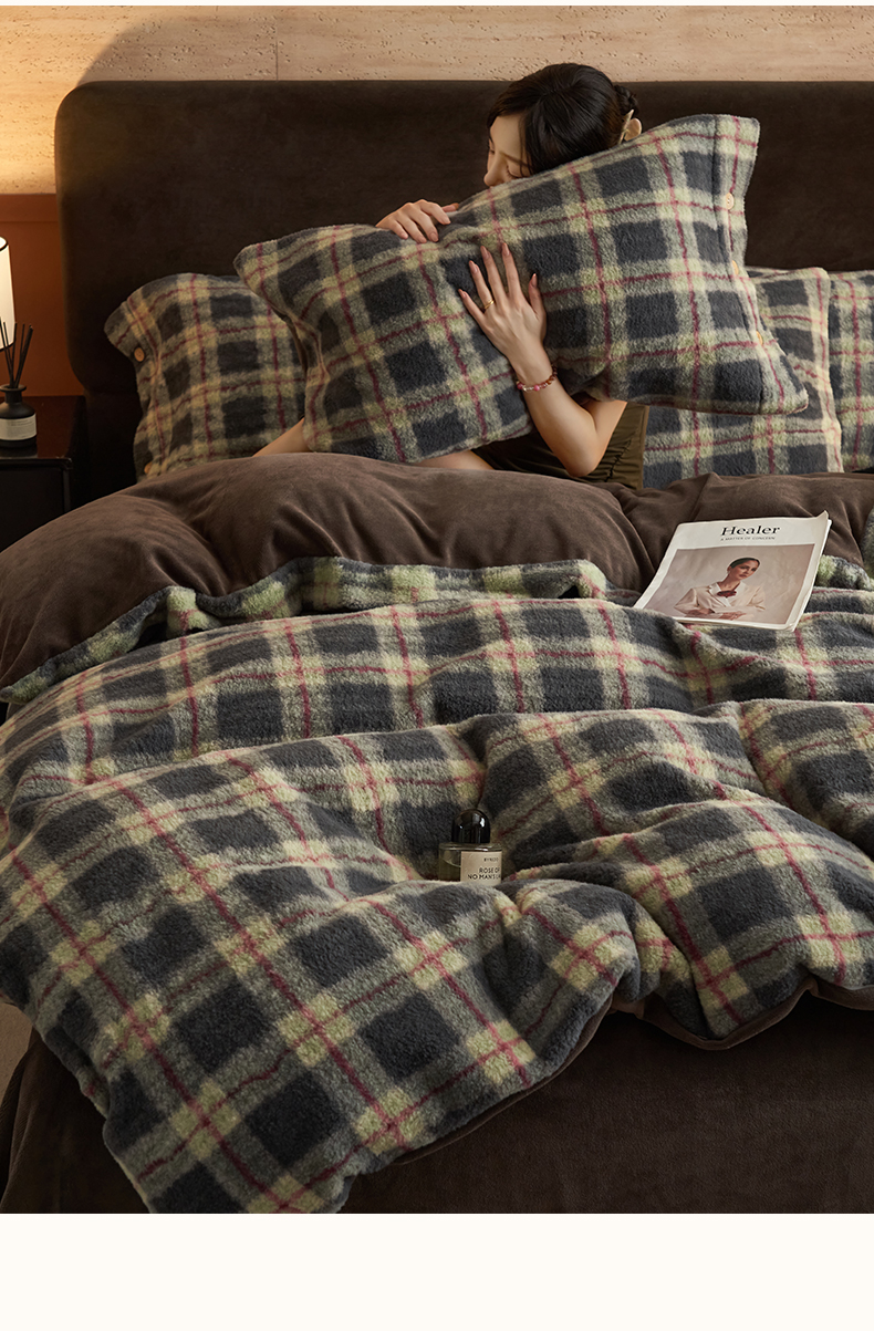 早晨家纺 2025新款230g羊驼绒复古格牛奶绒四件套 雾里青格