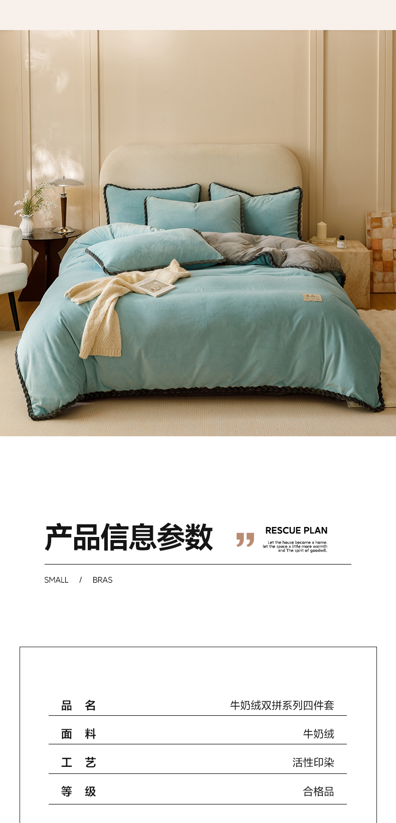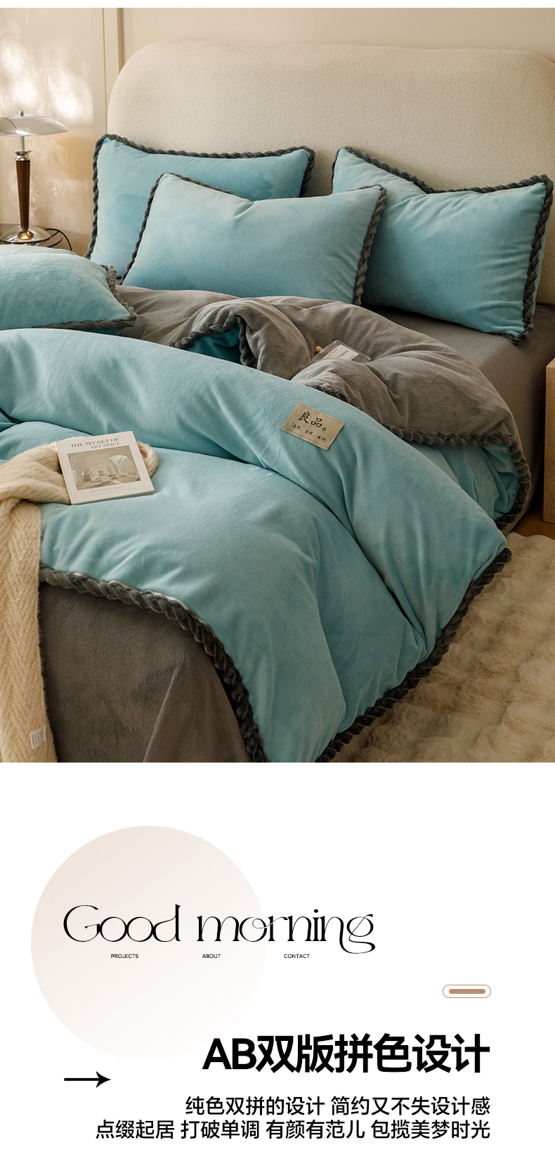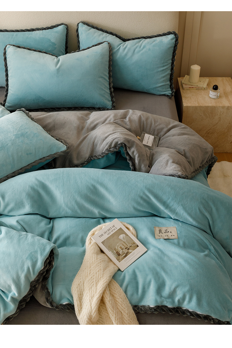 商品名称:早晨家纺 2025新款牛奶绒双拼四件套 双拼孔蓝+浅灰