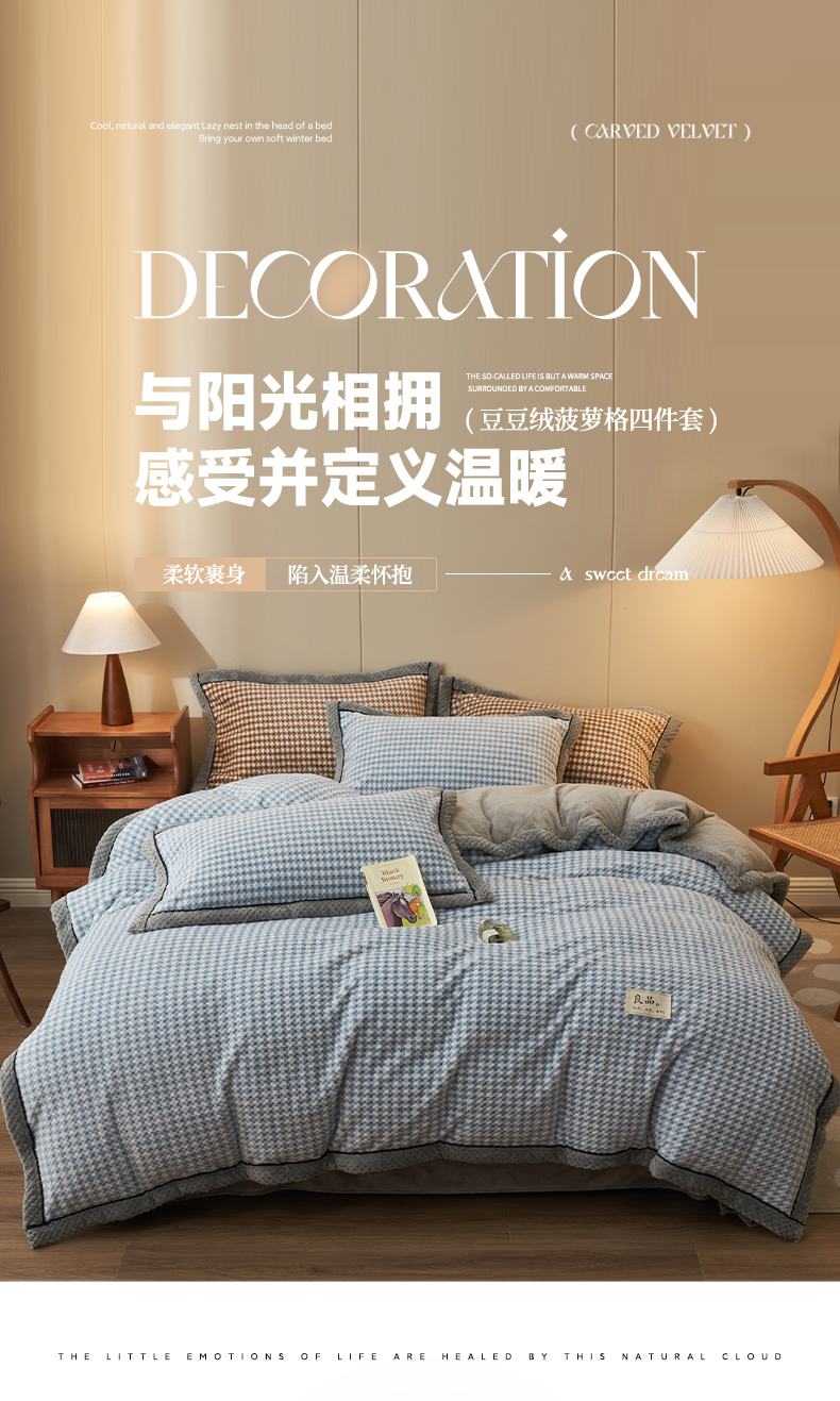 早晨家纺 2025新款豆豆款菠萝格提花四件套 豆豆绒-小格蓝