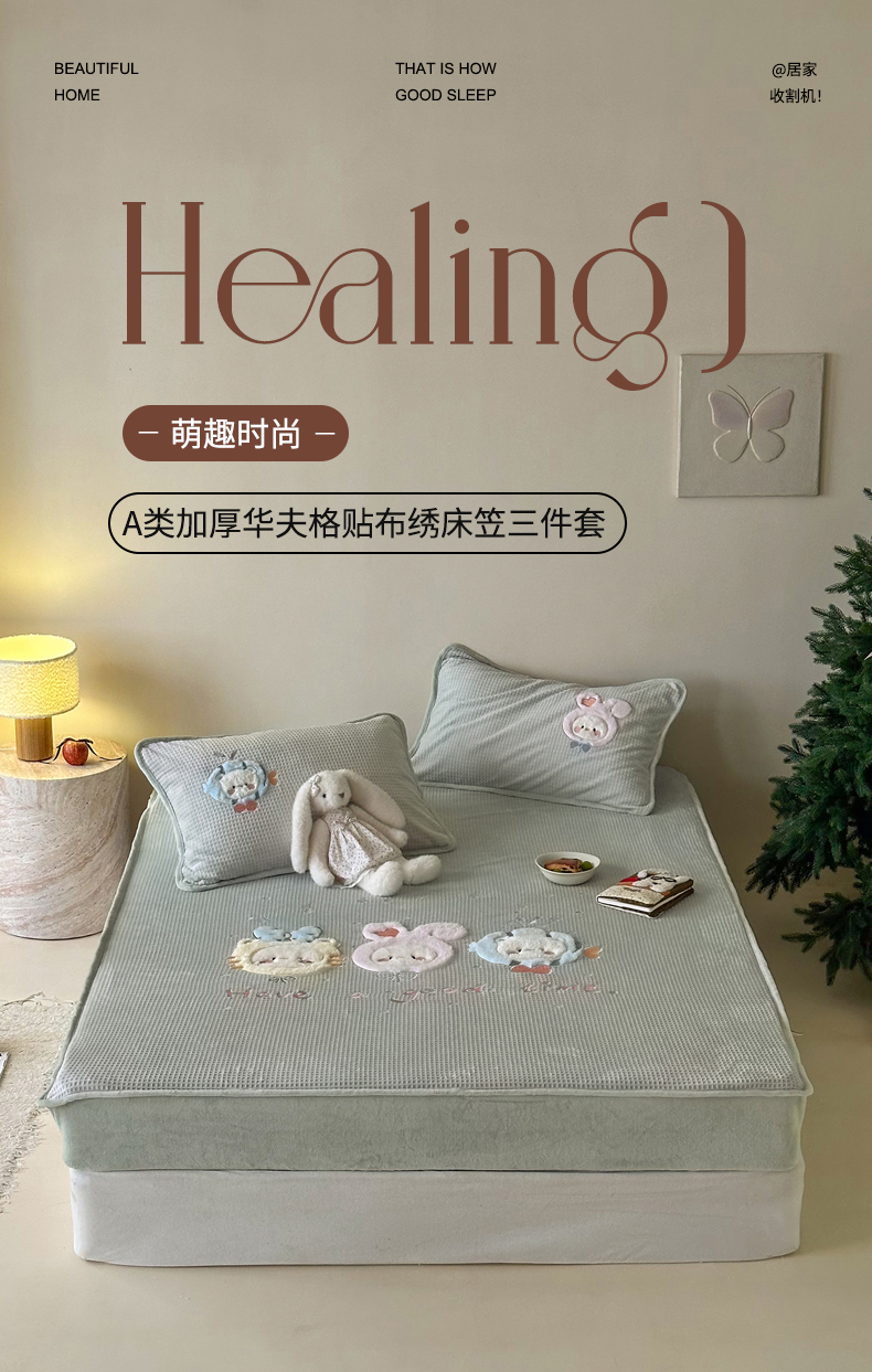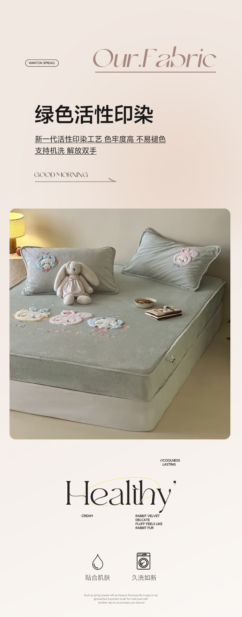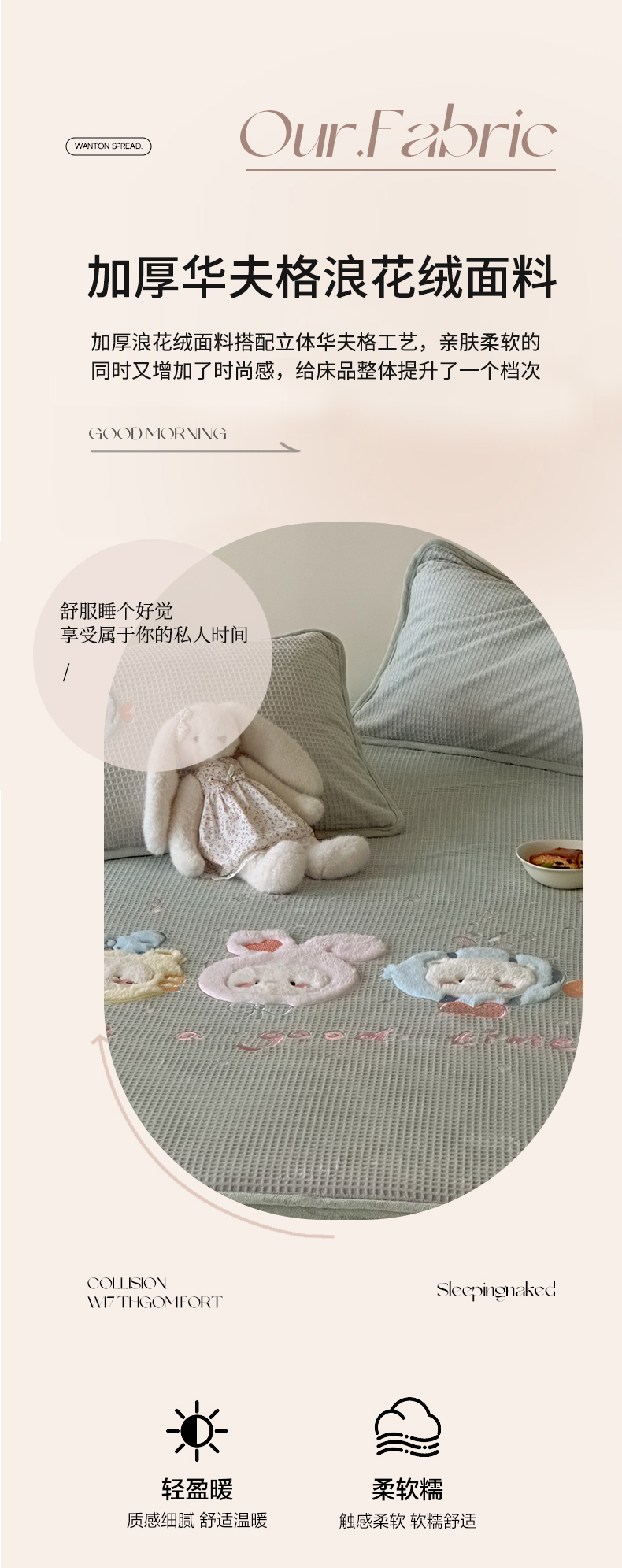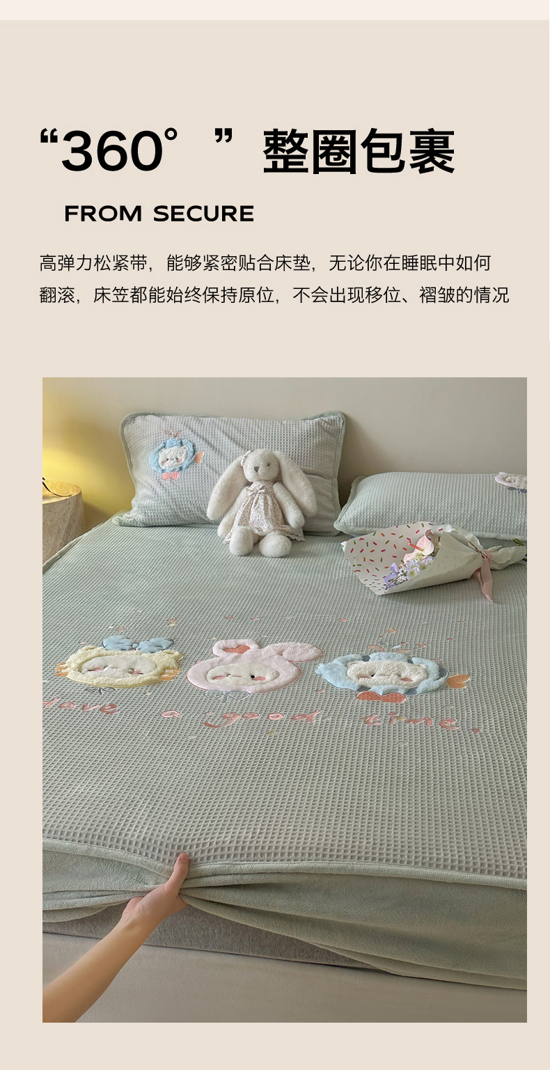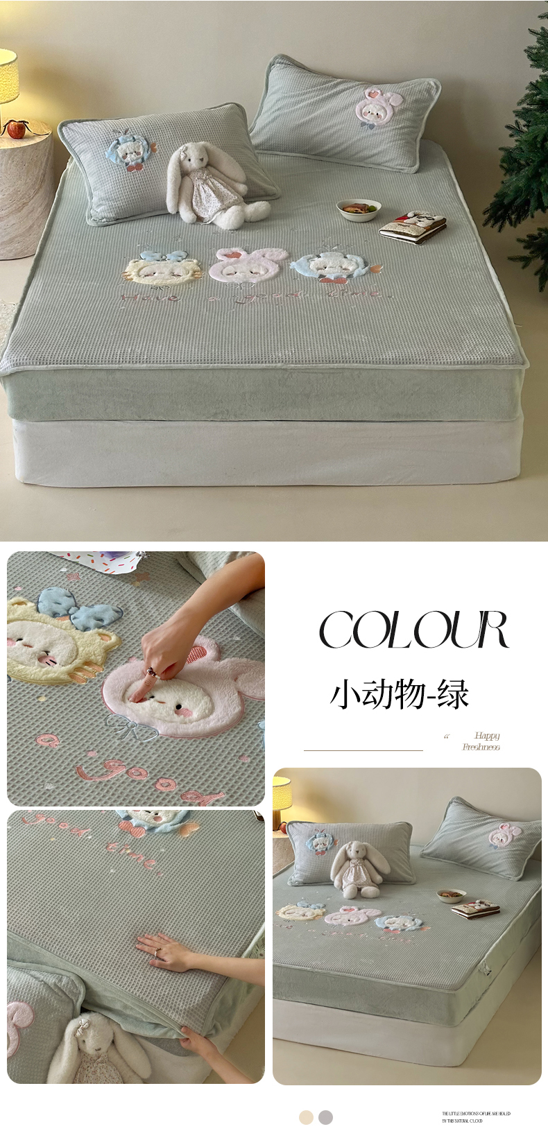 商品名称:Sweet dreams甜梦 2025新款华夫格绒兔毛贴布床笠三件套 小动物绿