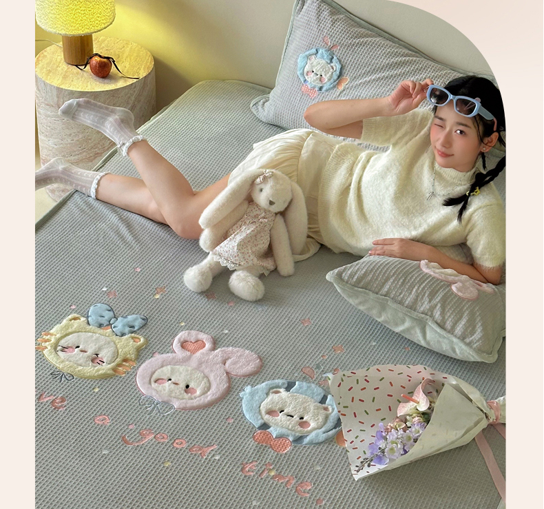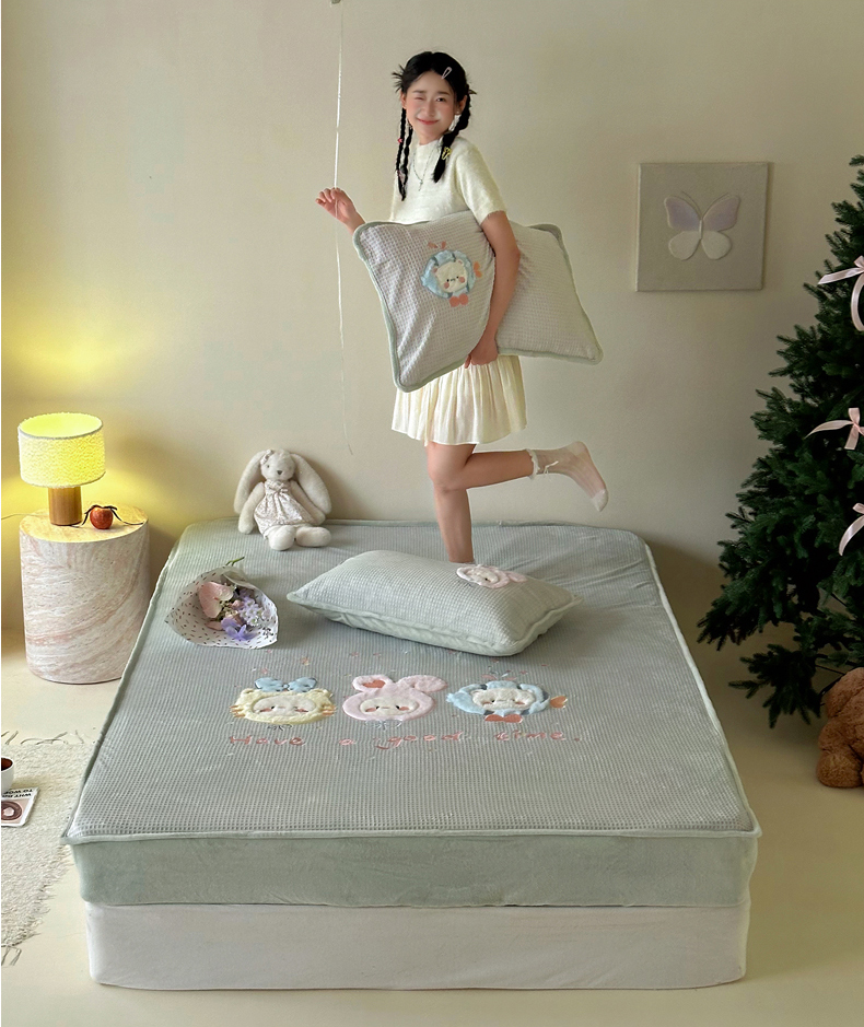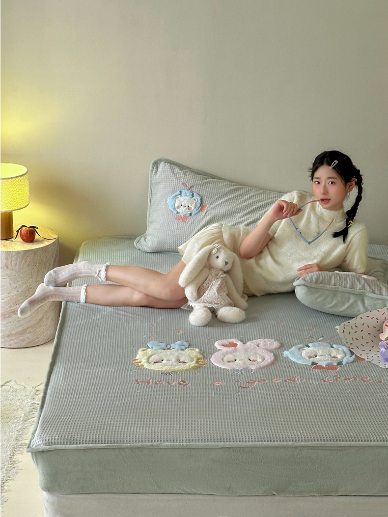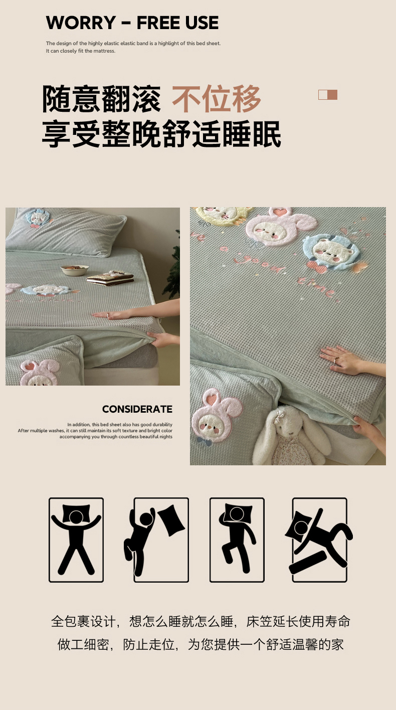 Sweet dreams甜梦 2025新款华夫格绒兔毛贴布床笠三件套 小动物绿