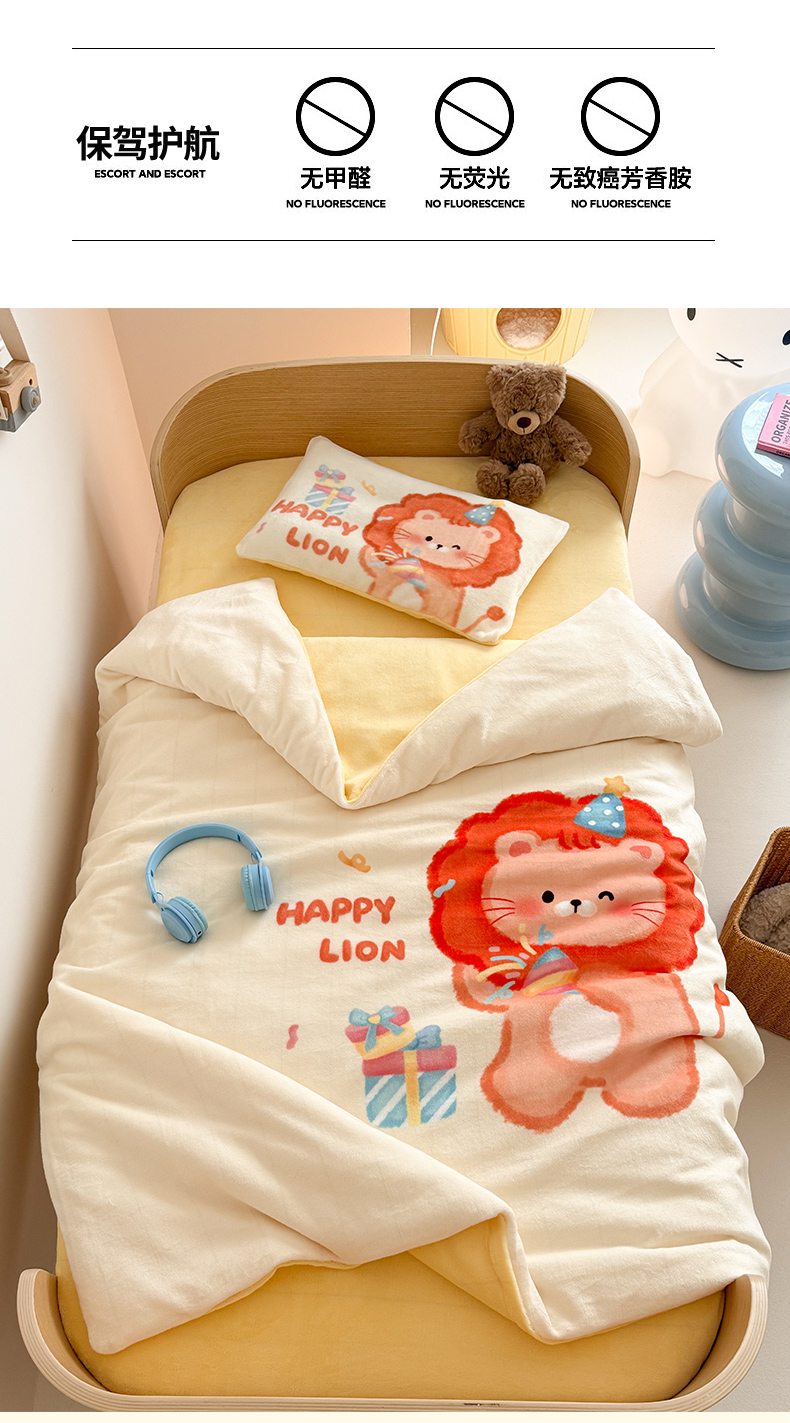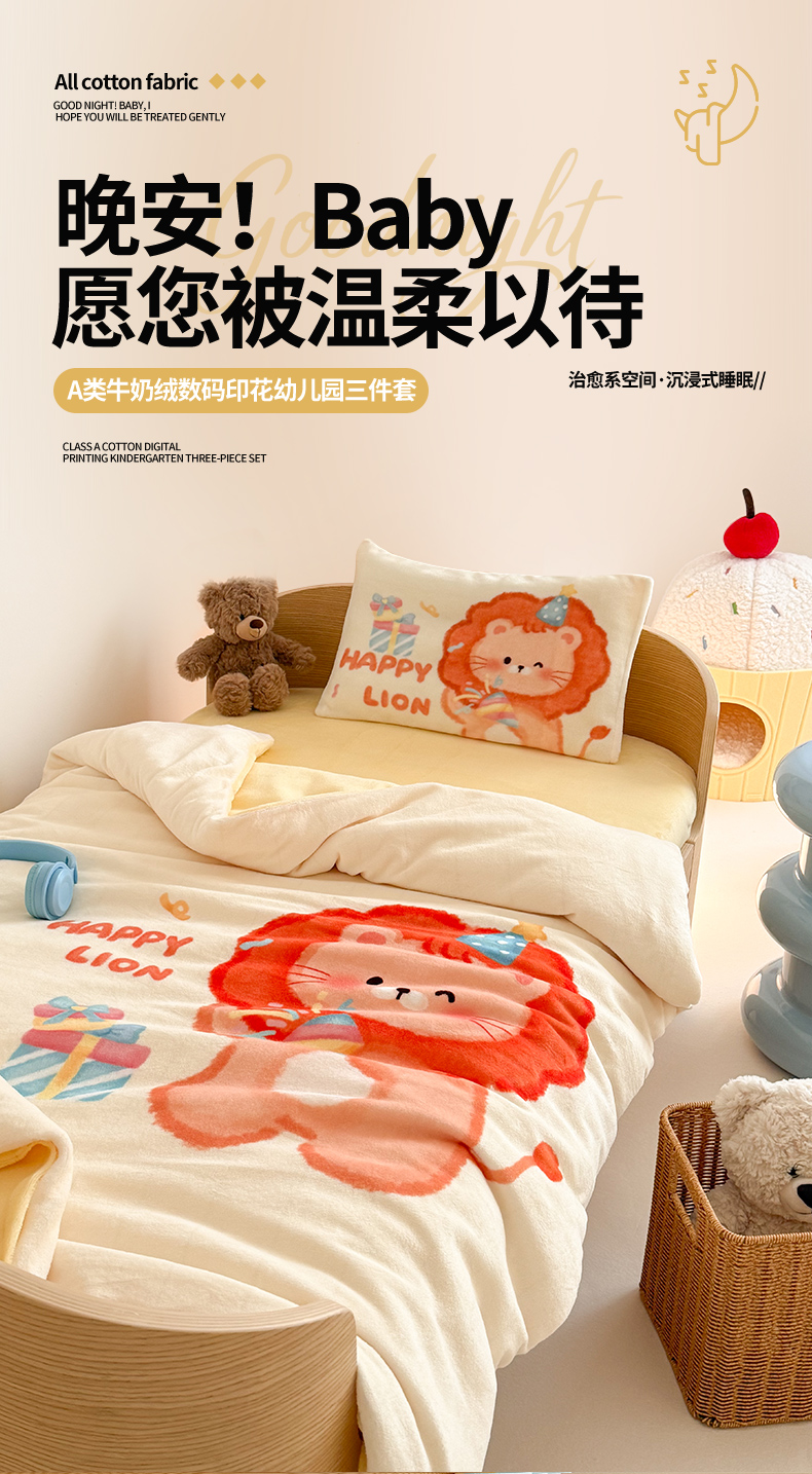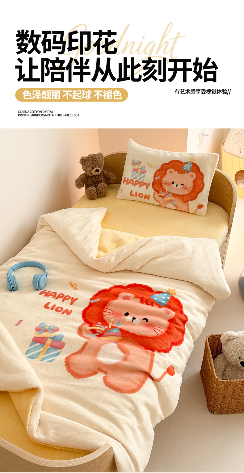 当前位置: 91家纺网 > 商品网购 > 床品套件 > 三件套 > 嗨生活 2025新款牛奶绒数码印花原创大版卡通幼儿园套件幼儿园三件套 萌小狮