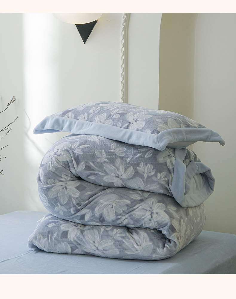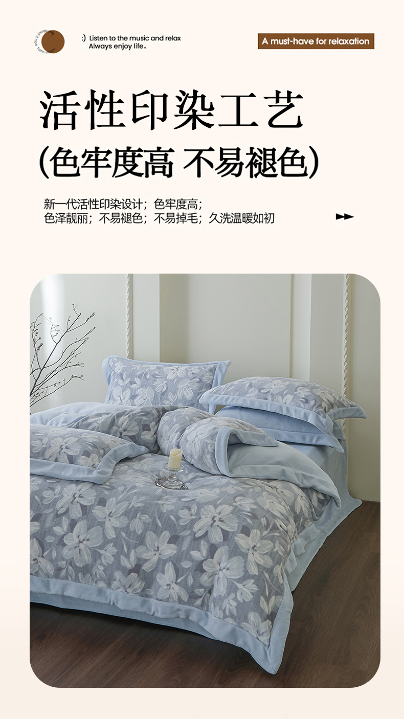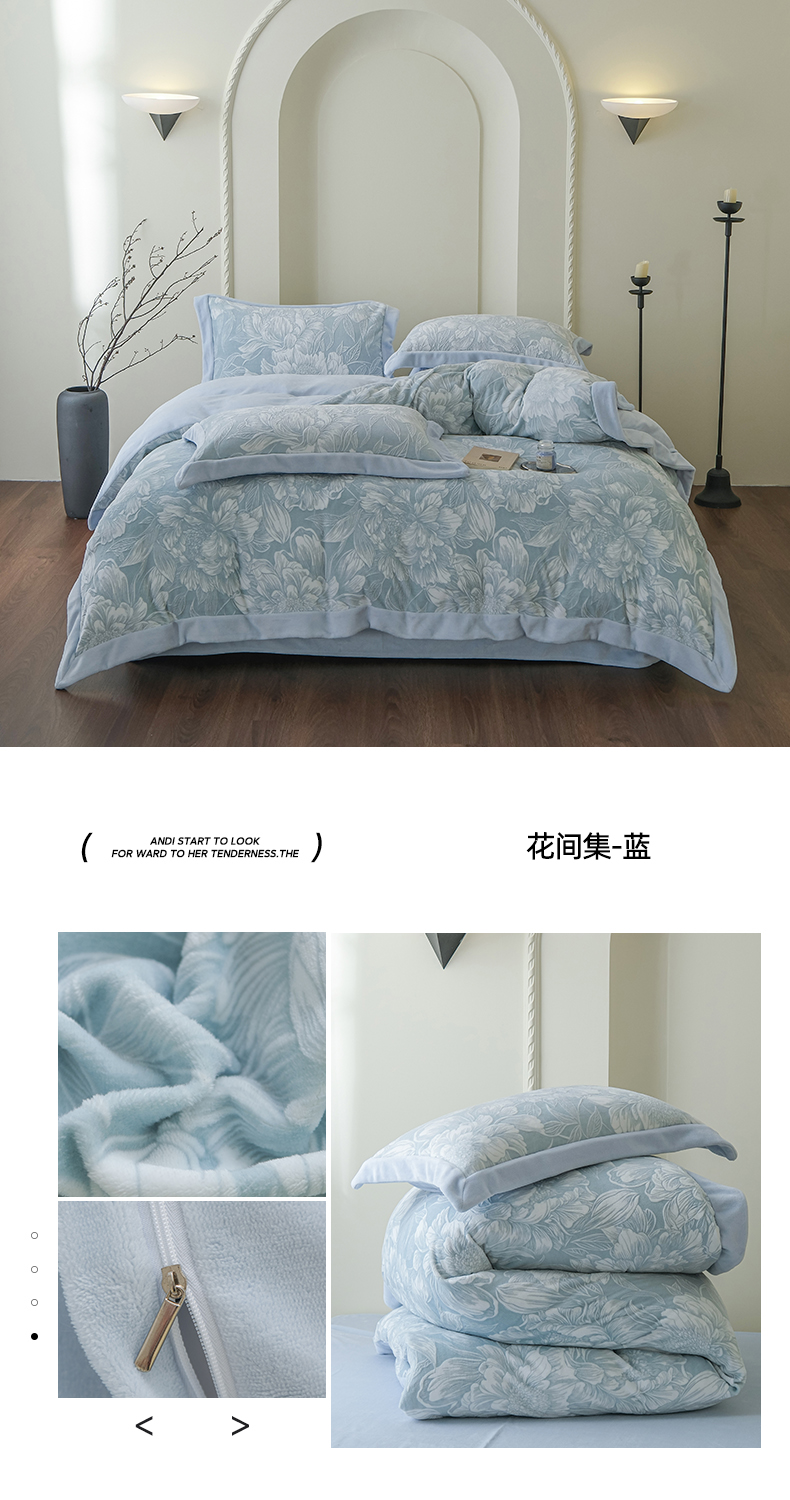 商品名称:米奈家居 2025新款立体雕花拼角款牛奶绒四件套 花如玉-蓝