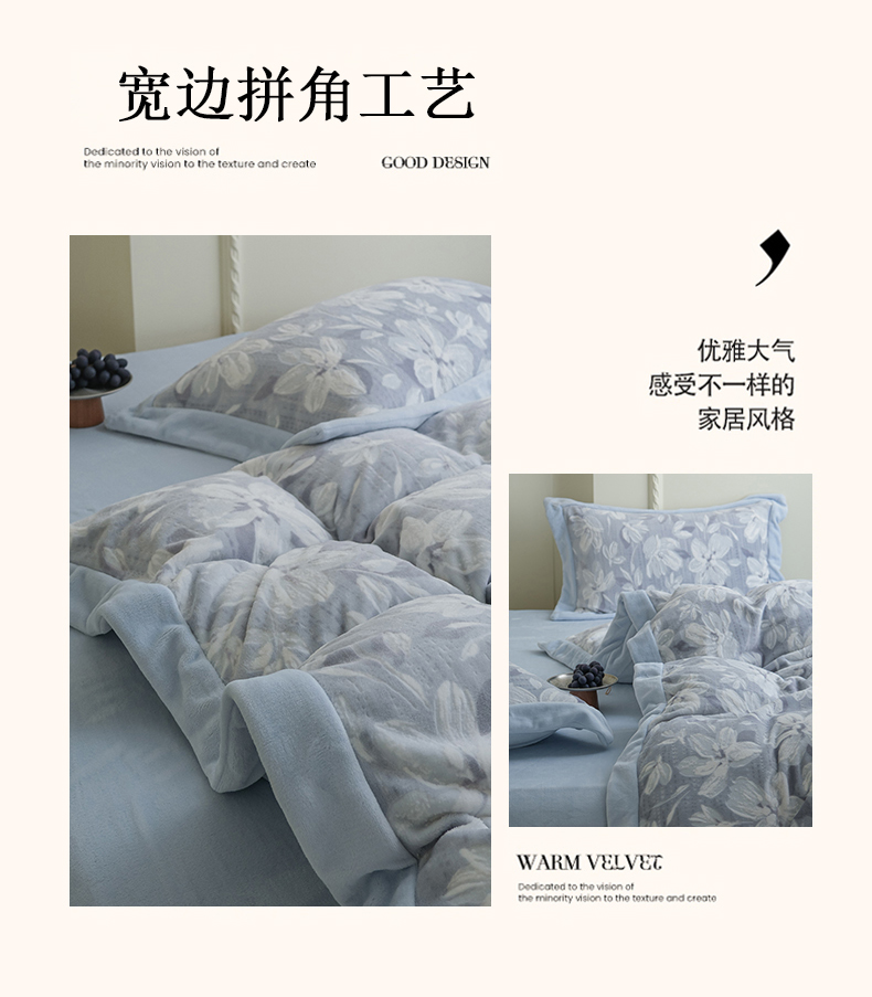 米奈家居 2025新款立体雕花拼角款牛奶绒四件套 花如玉-蓝