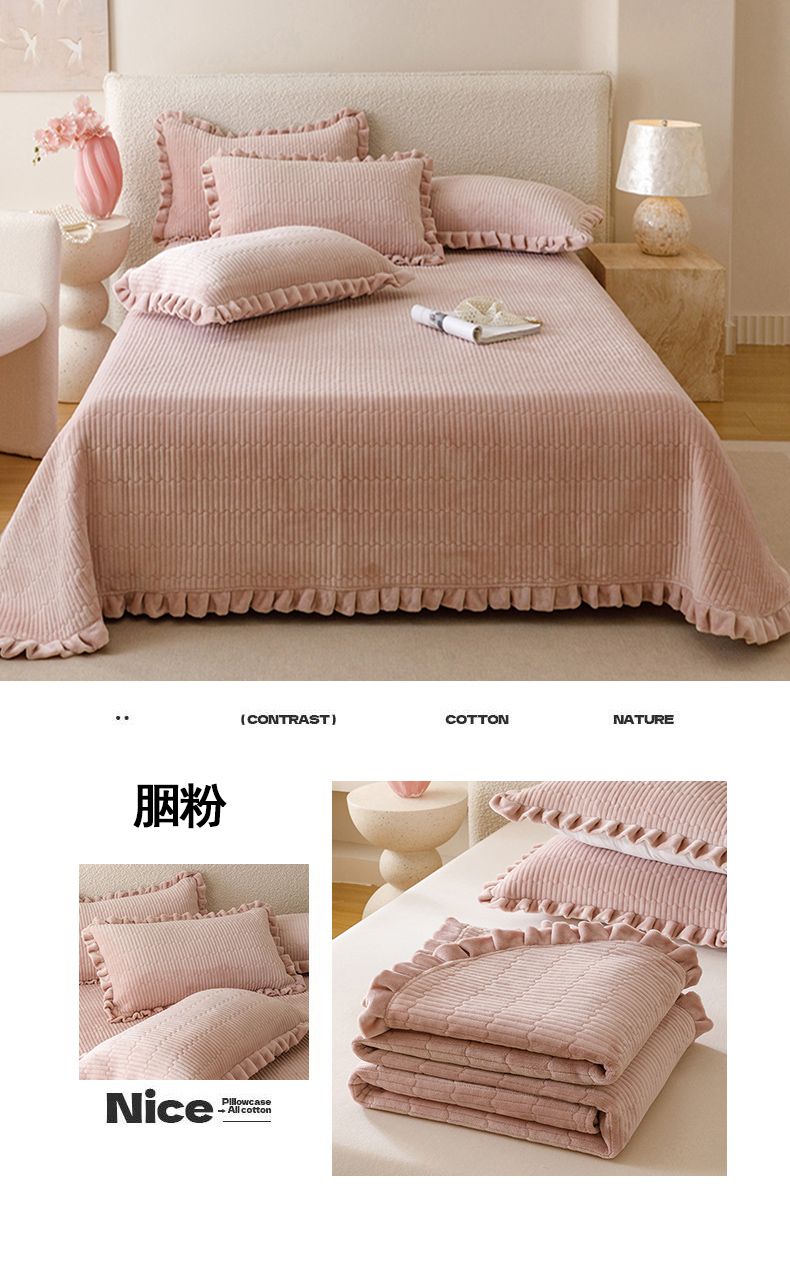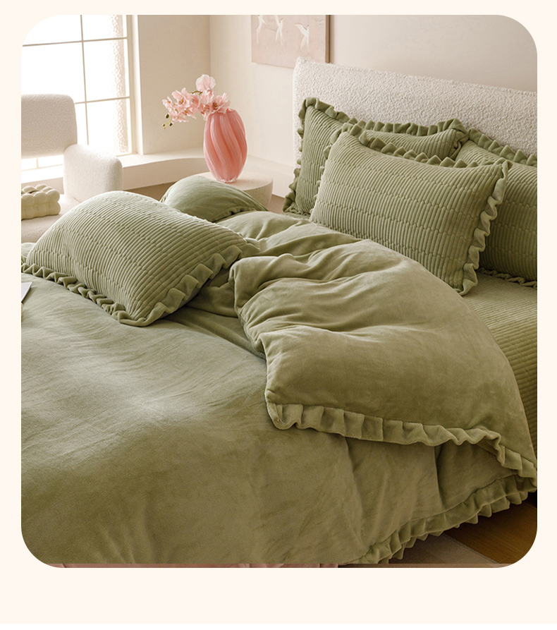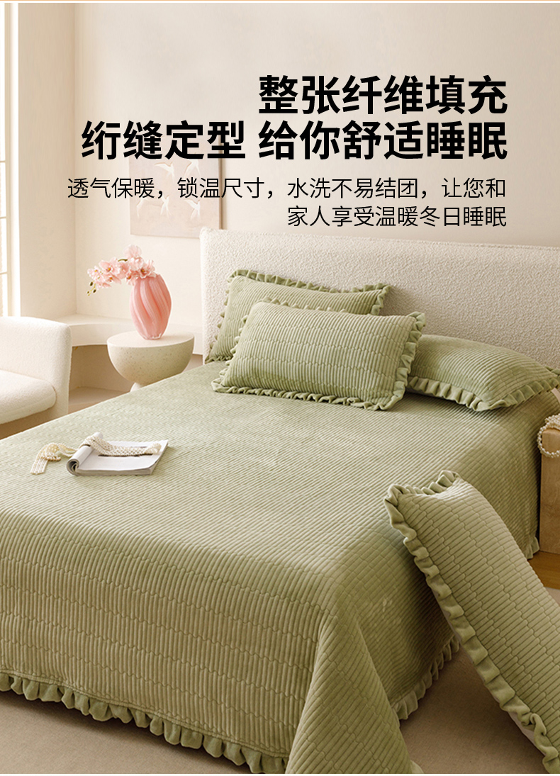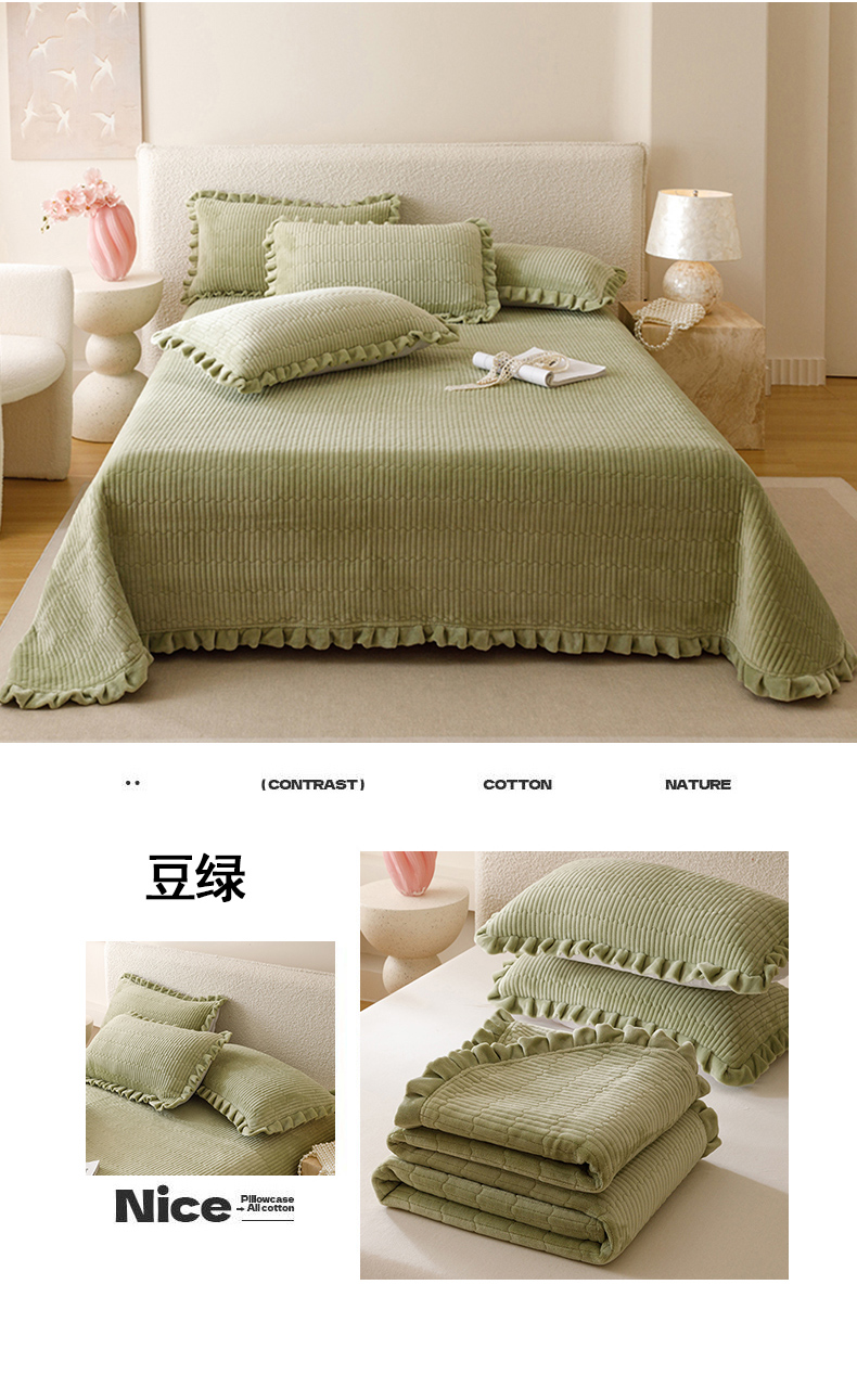 当前位置: 91家纺网 > 商品网购 > 床品套件 > 四件套 > 牛奶绒四件套 > 沐晴家纺 2025新款纯色牛奶绒法式床盖四件套花边床盖三件套单被套 豆绿