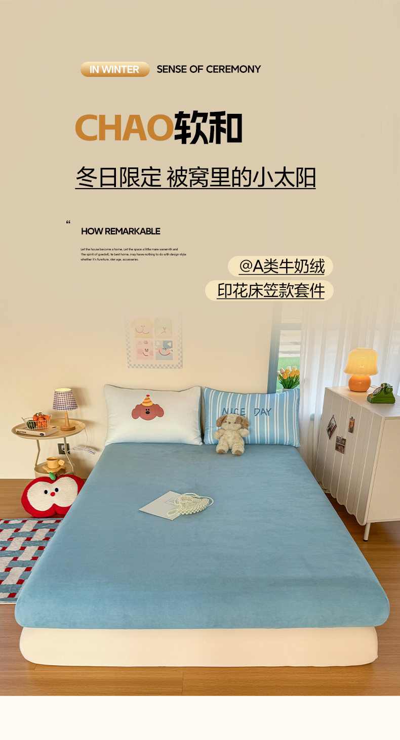(总)十一家居 2025新款A类原创设计大版印花恒温保暖牛奶绒床笠套件,音乐萌犬,安睡小熊,暖冬狗狗,圣诞小熊