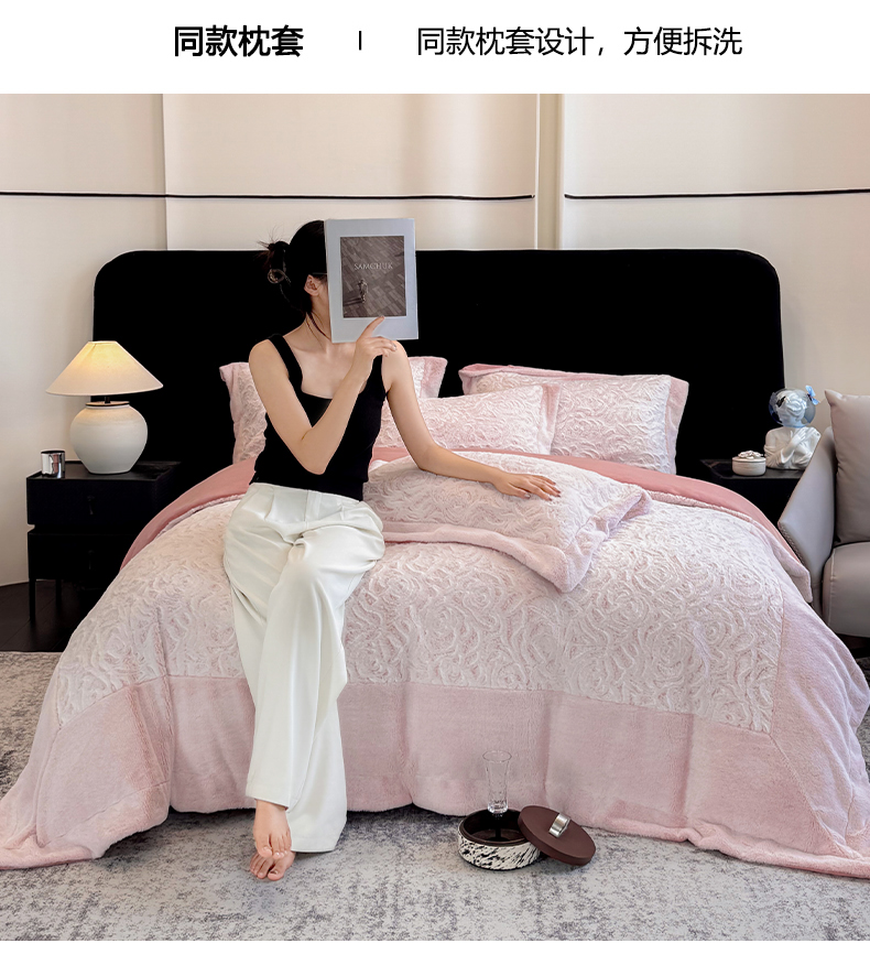 商品名称:丞音家纺 11斤新款秋冬A类轻奢皮草绒加厚保暖水貂绒牛奶绒床上用品珊瑚绒四件套床单被套 伯恩-温柔粉