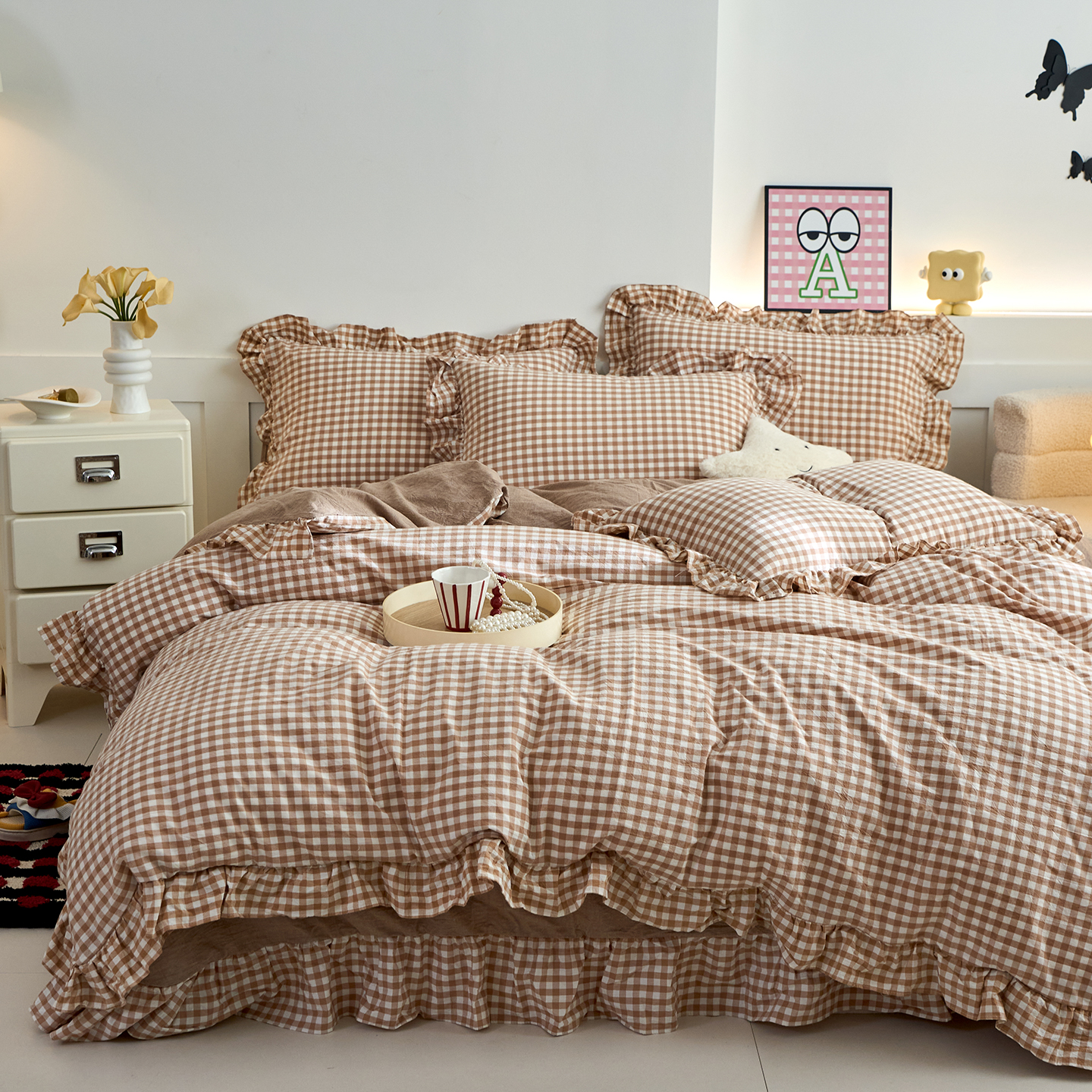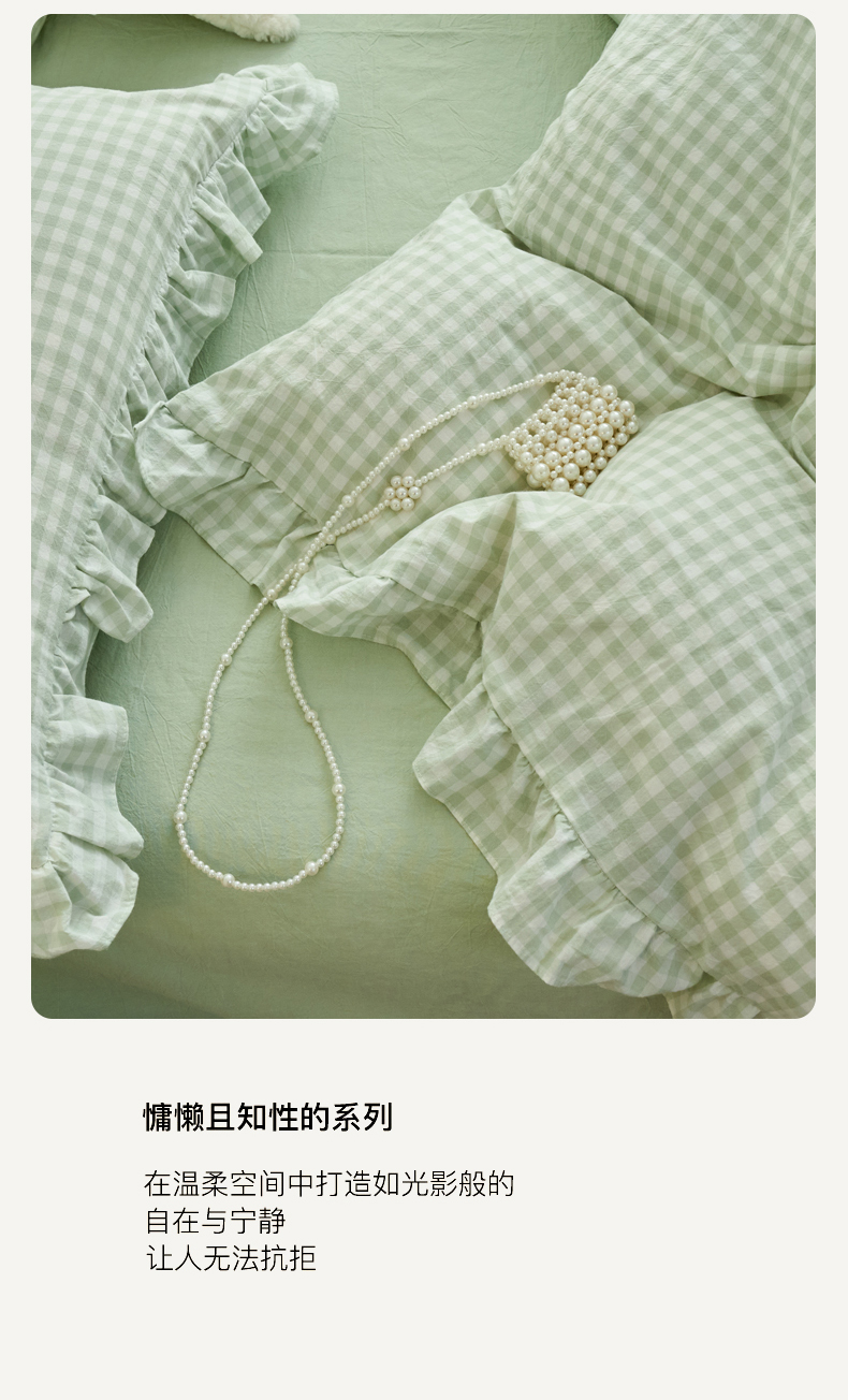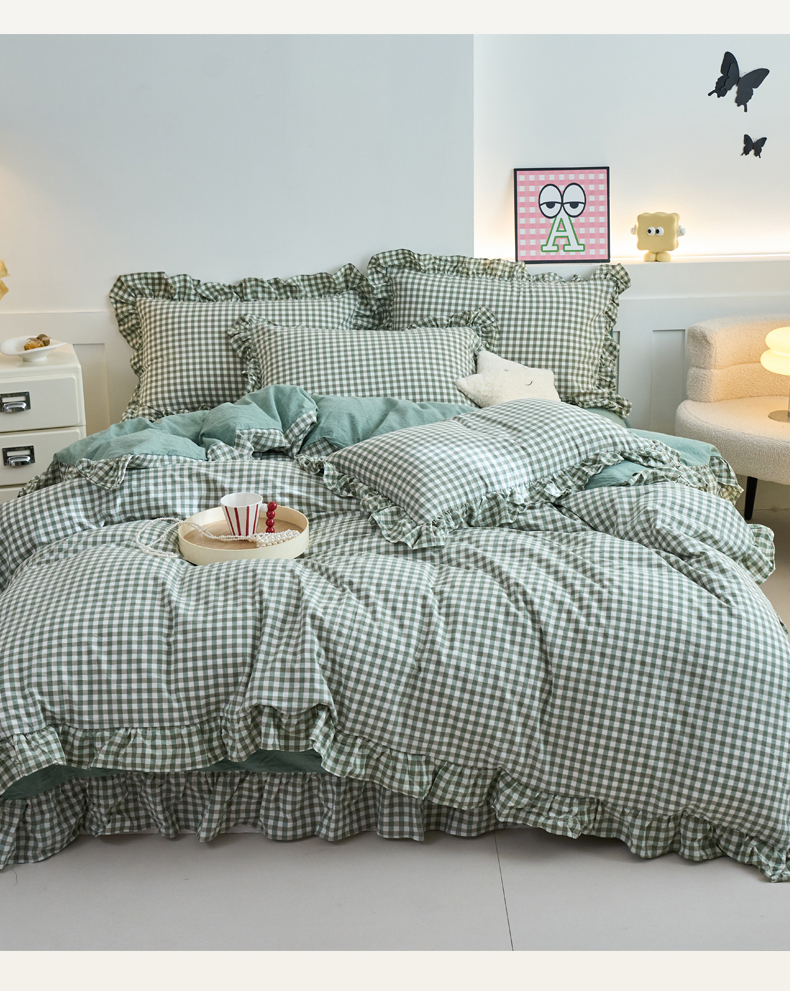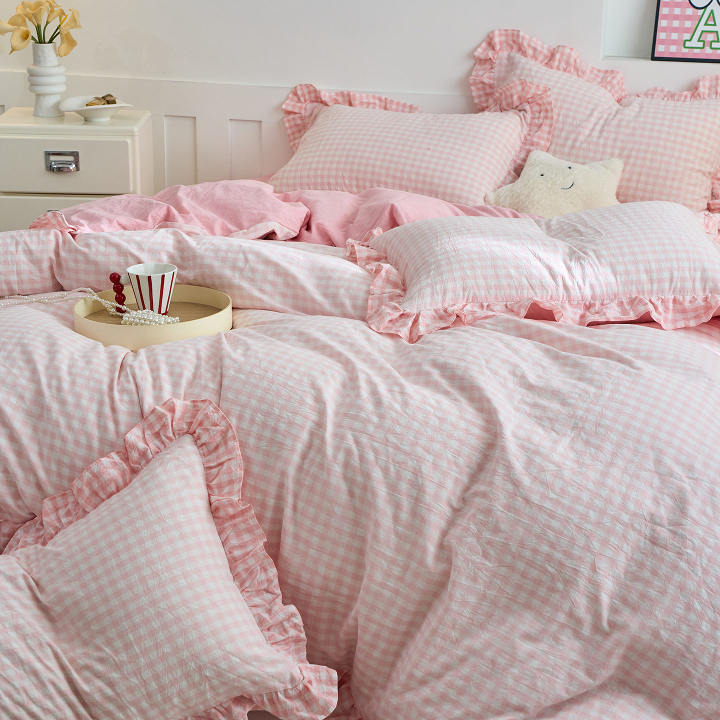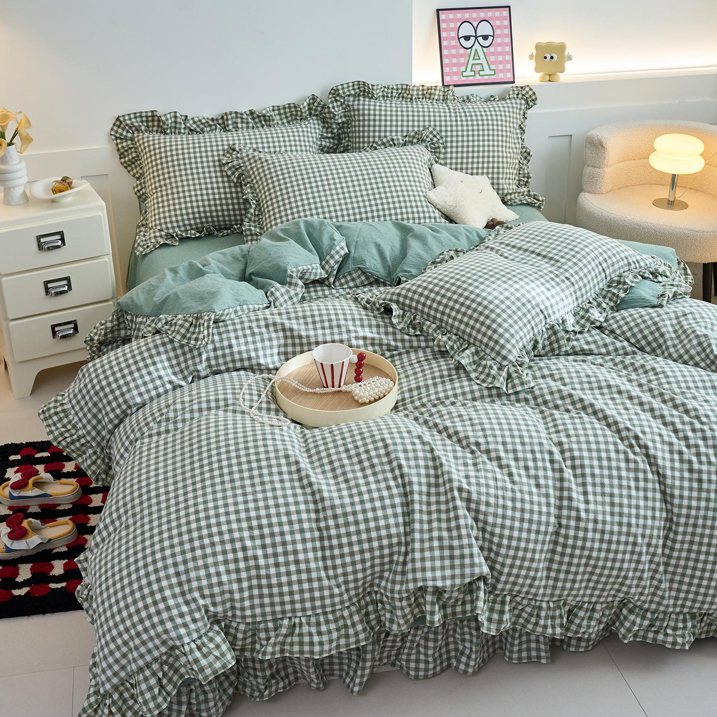 (总)珂博家纺 2025新款韩版花边四件套纯棉全棉水洗棉四件套,粉小格,蓝小格,浅绿小格,浅粉小格,绿小格,咖小格