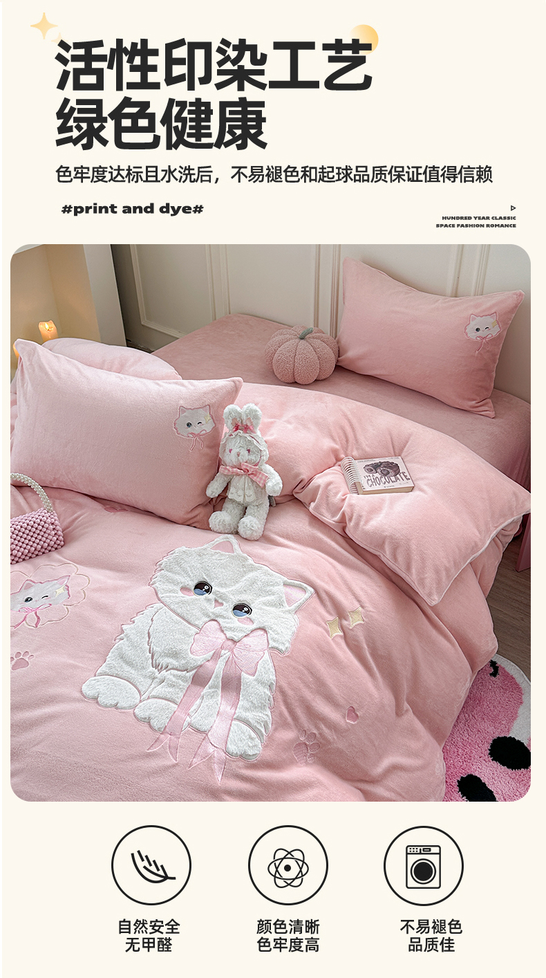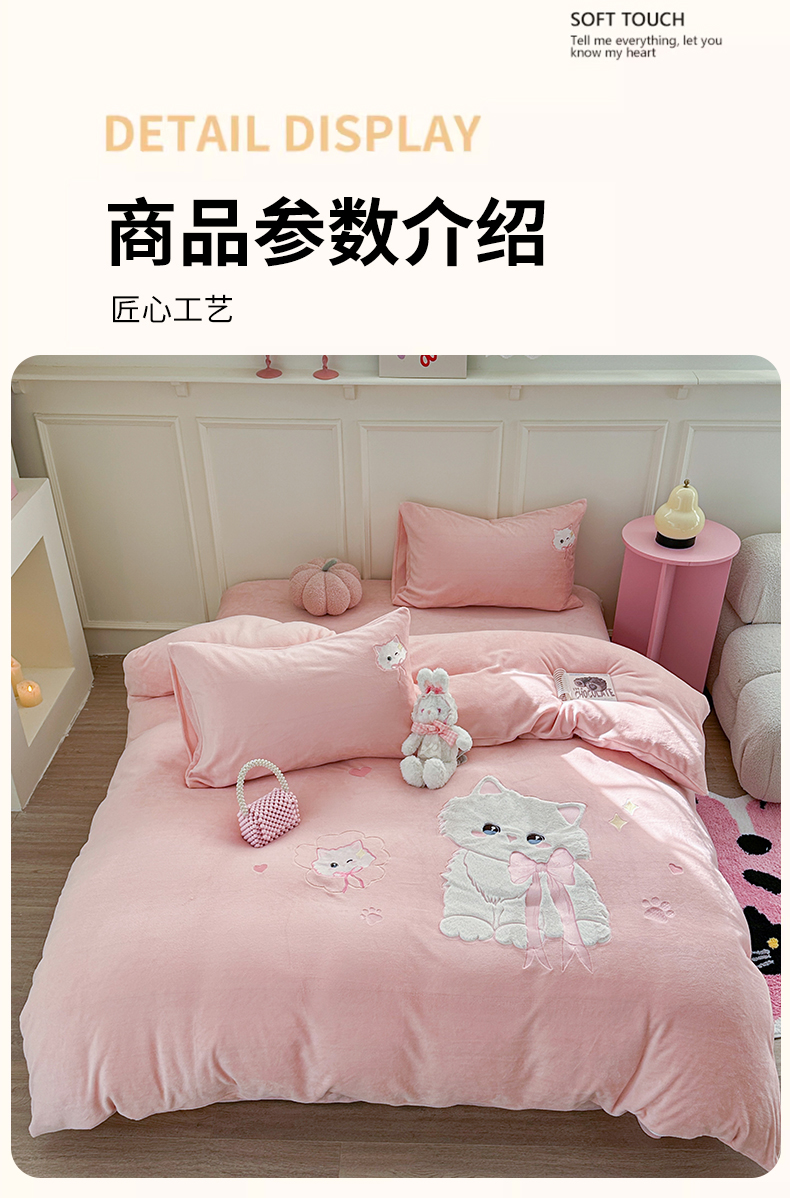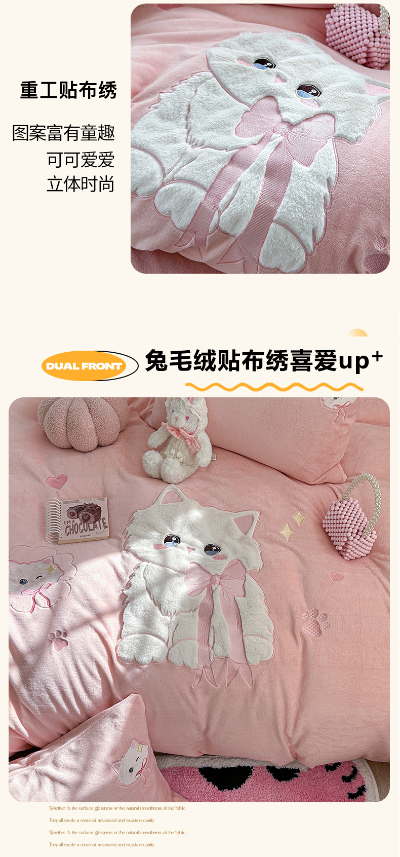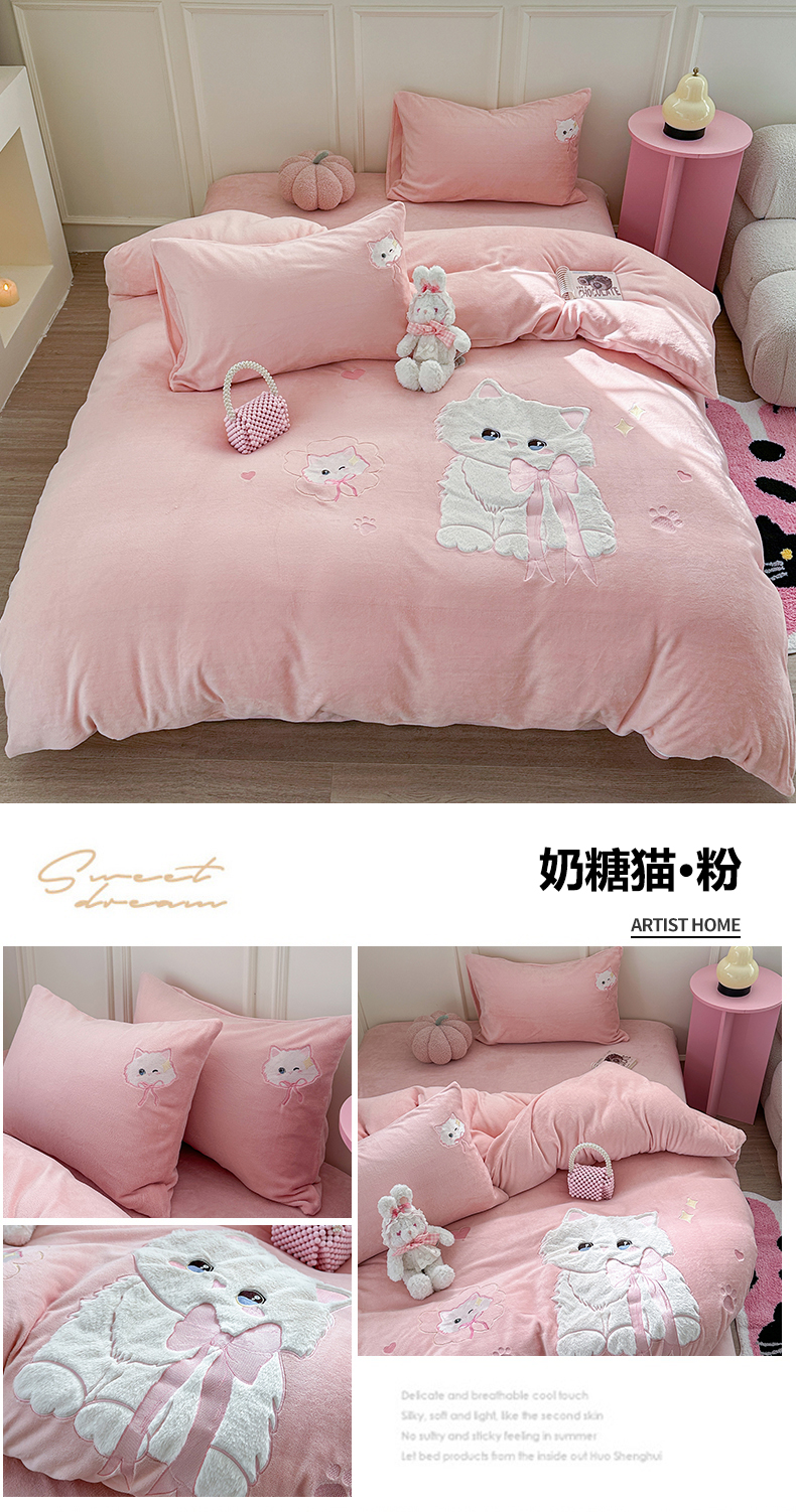 商品名称:TT.one 塔塔家居 2025新款牛奶绒立体贴布绣四件套 奶糖猫-粉